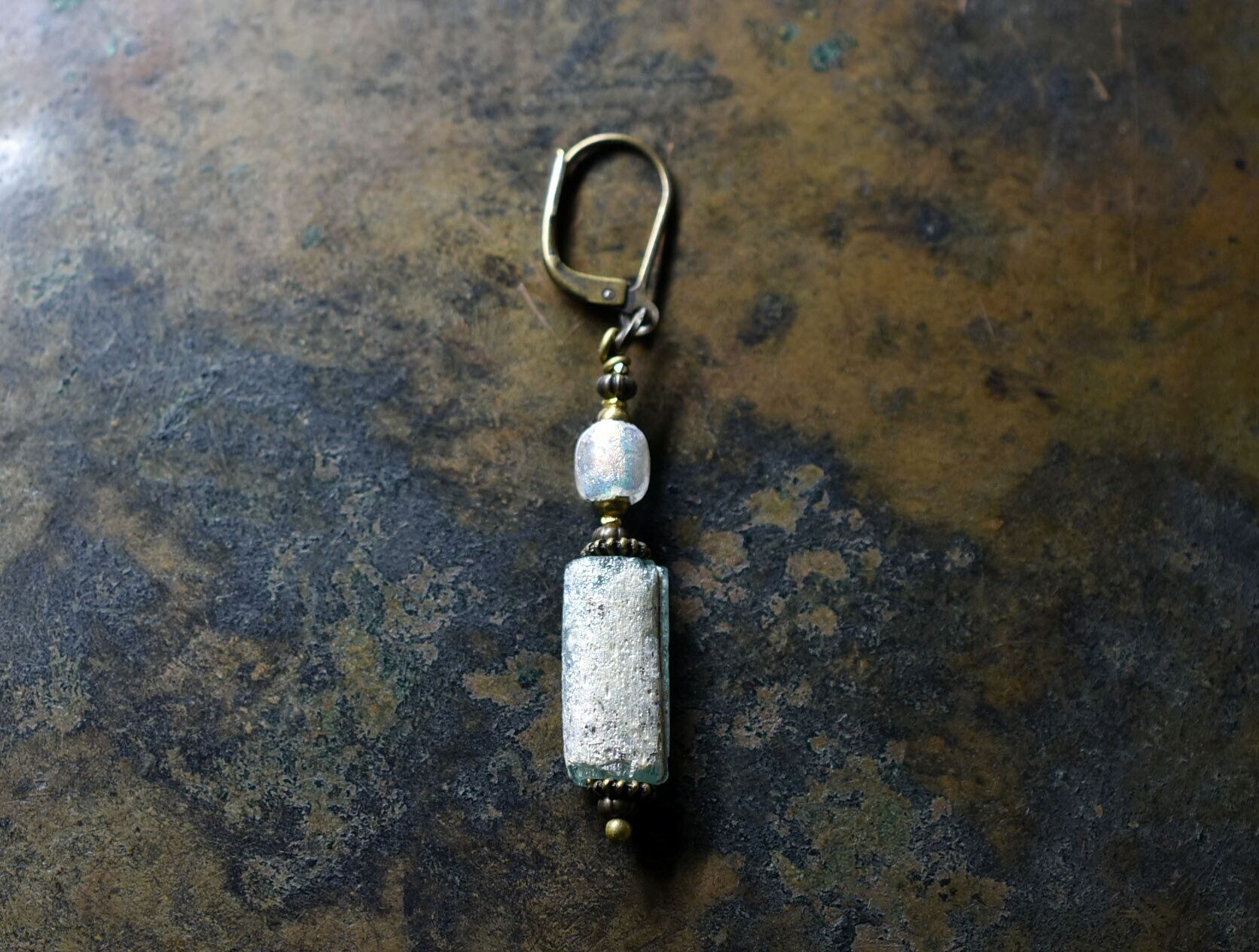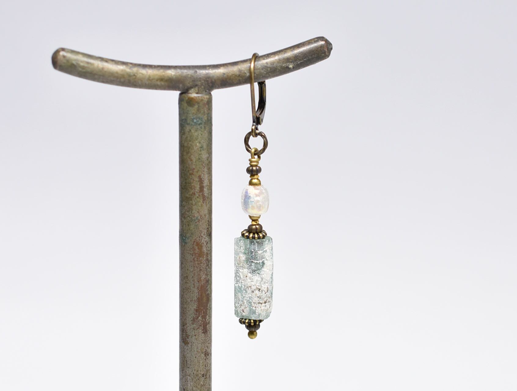 オパールの様な銀化の輝きローマングラスを繋いだ片耳ピアスです。
