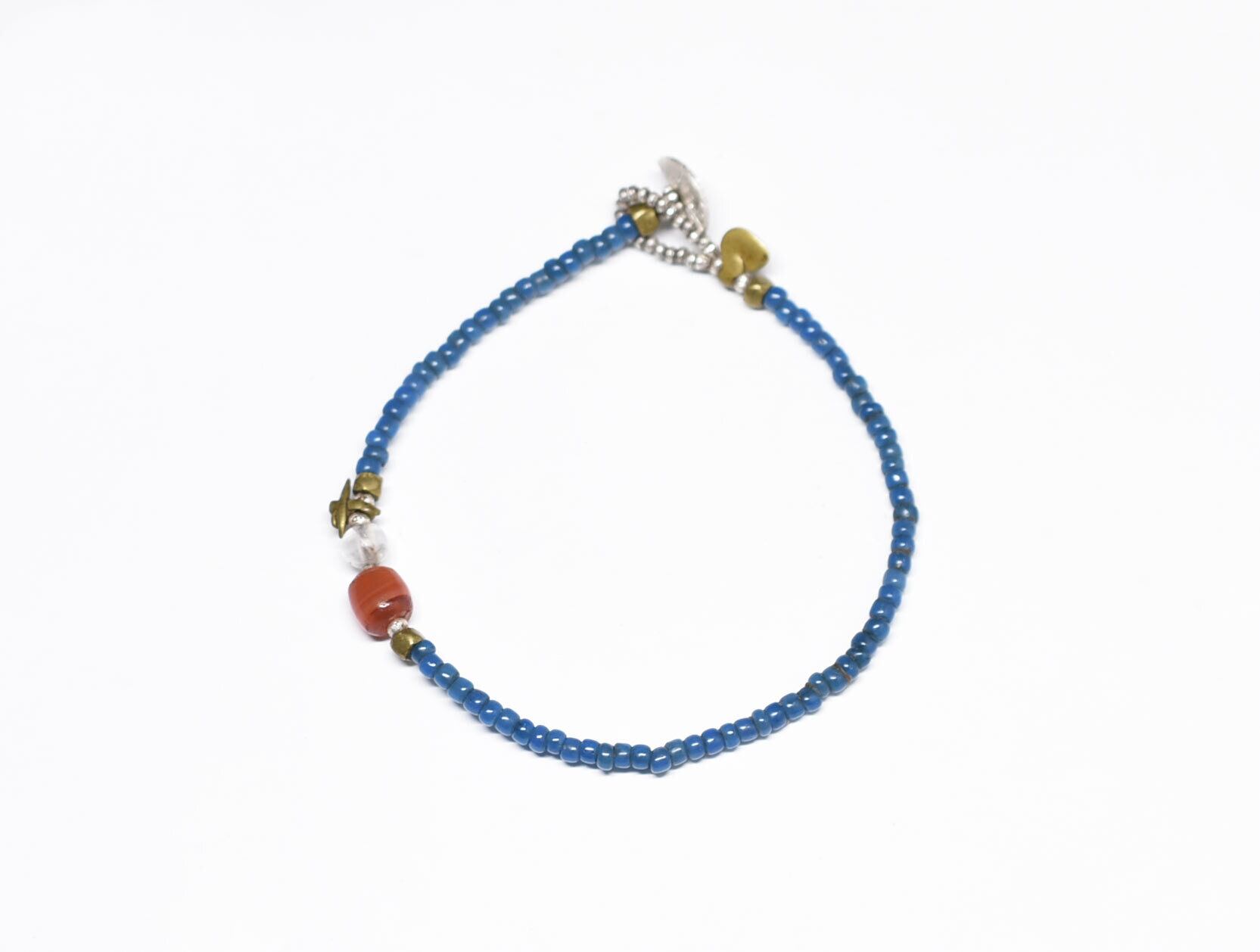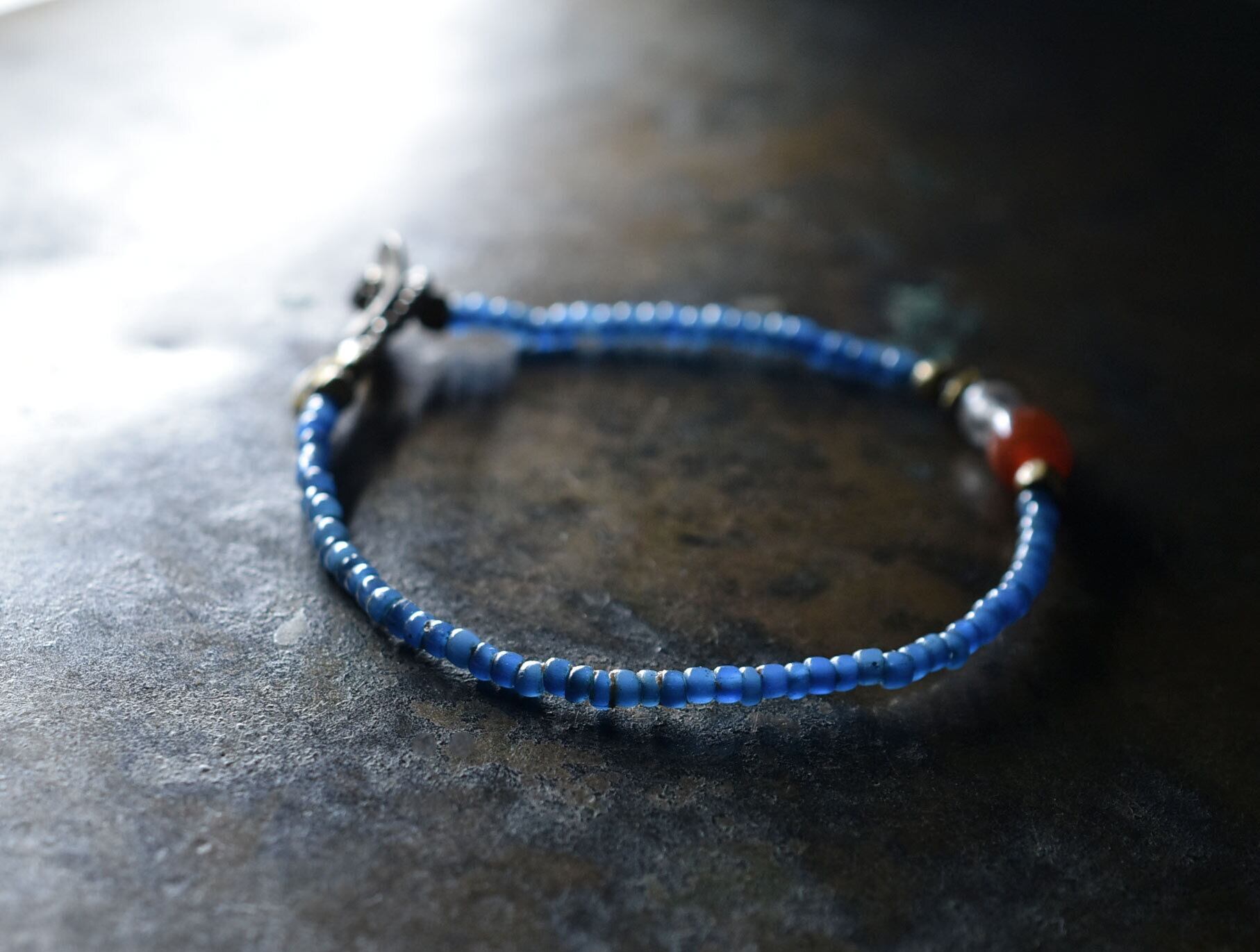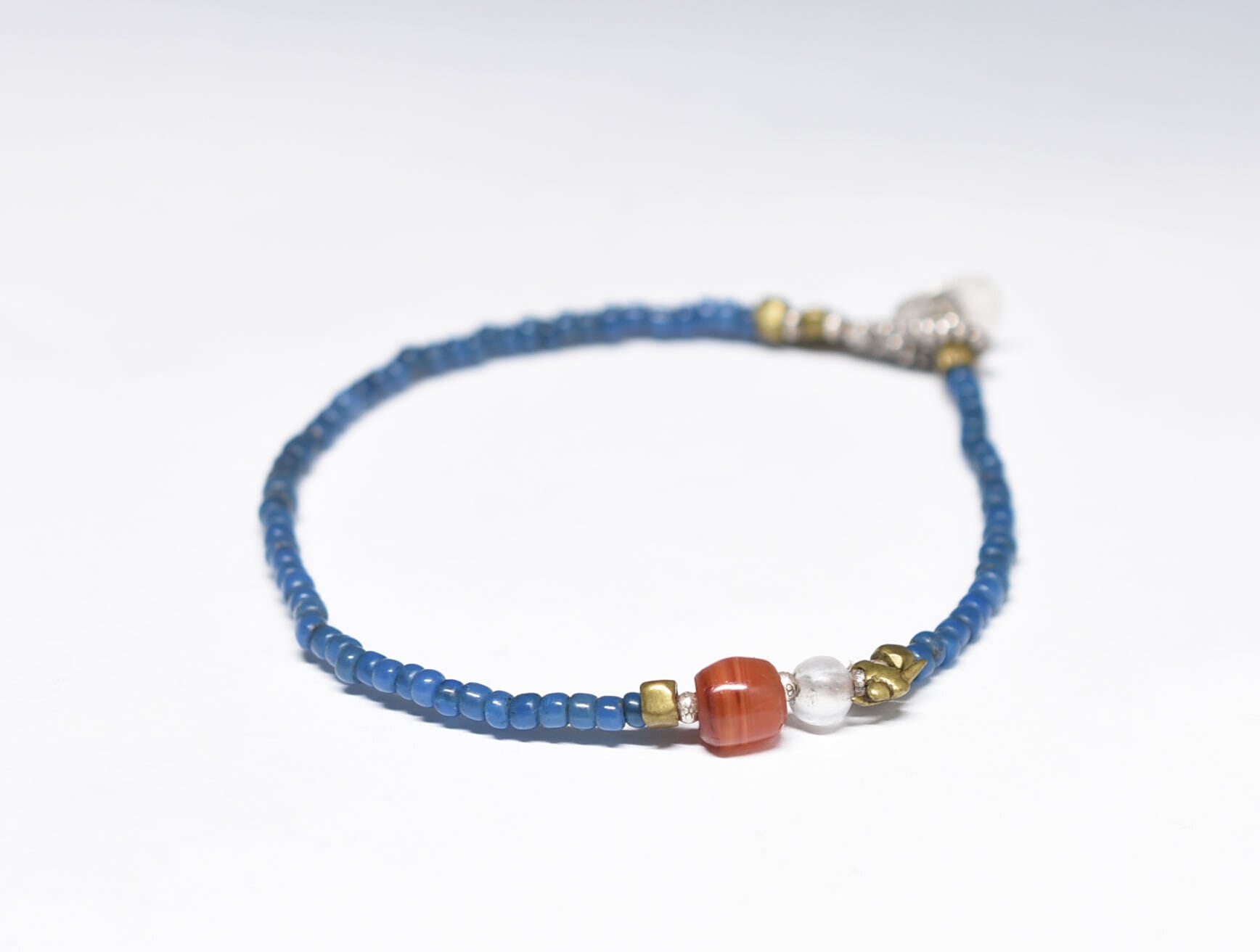 サックスブルービーズとミゾーラムカーネリアン、古代水晶、オリッサブラスなどを繋いだ華奢なブレスです。