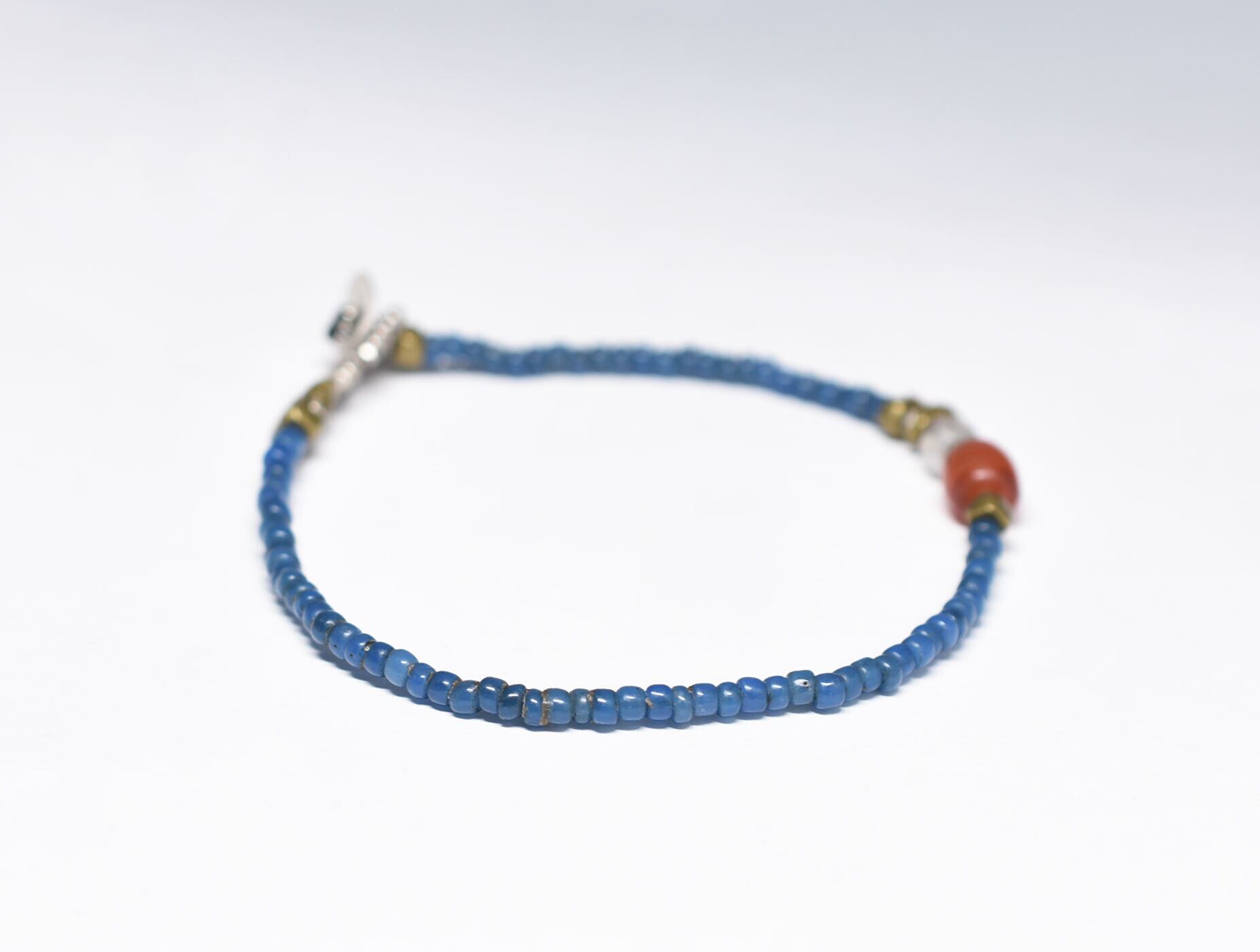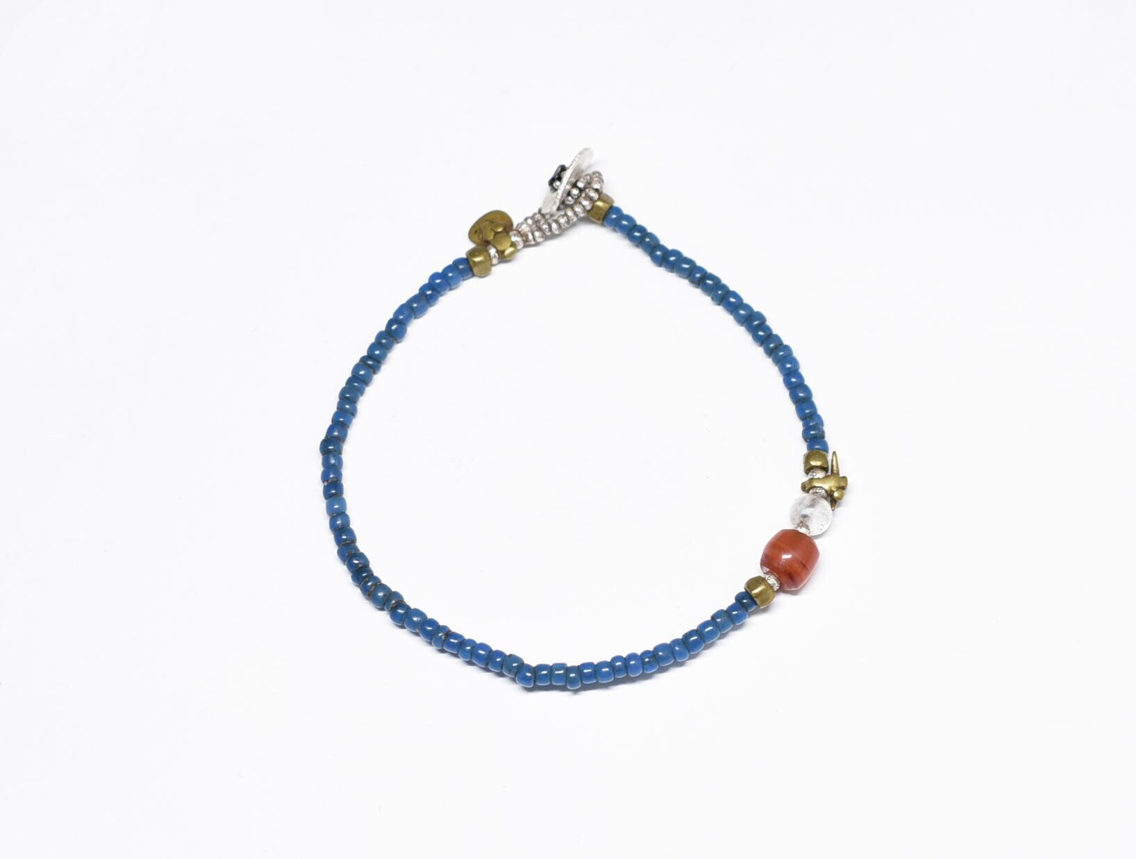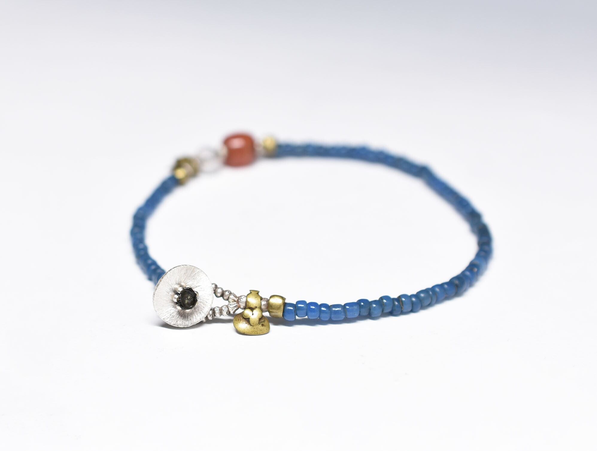 サックスブルービーズとミゾーラムカーネリアン、古代水晶、オリッサブラスなどを繋いだ華奢なブレスです。