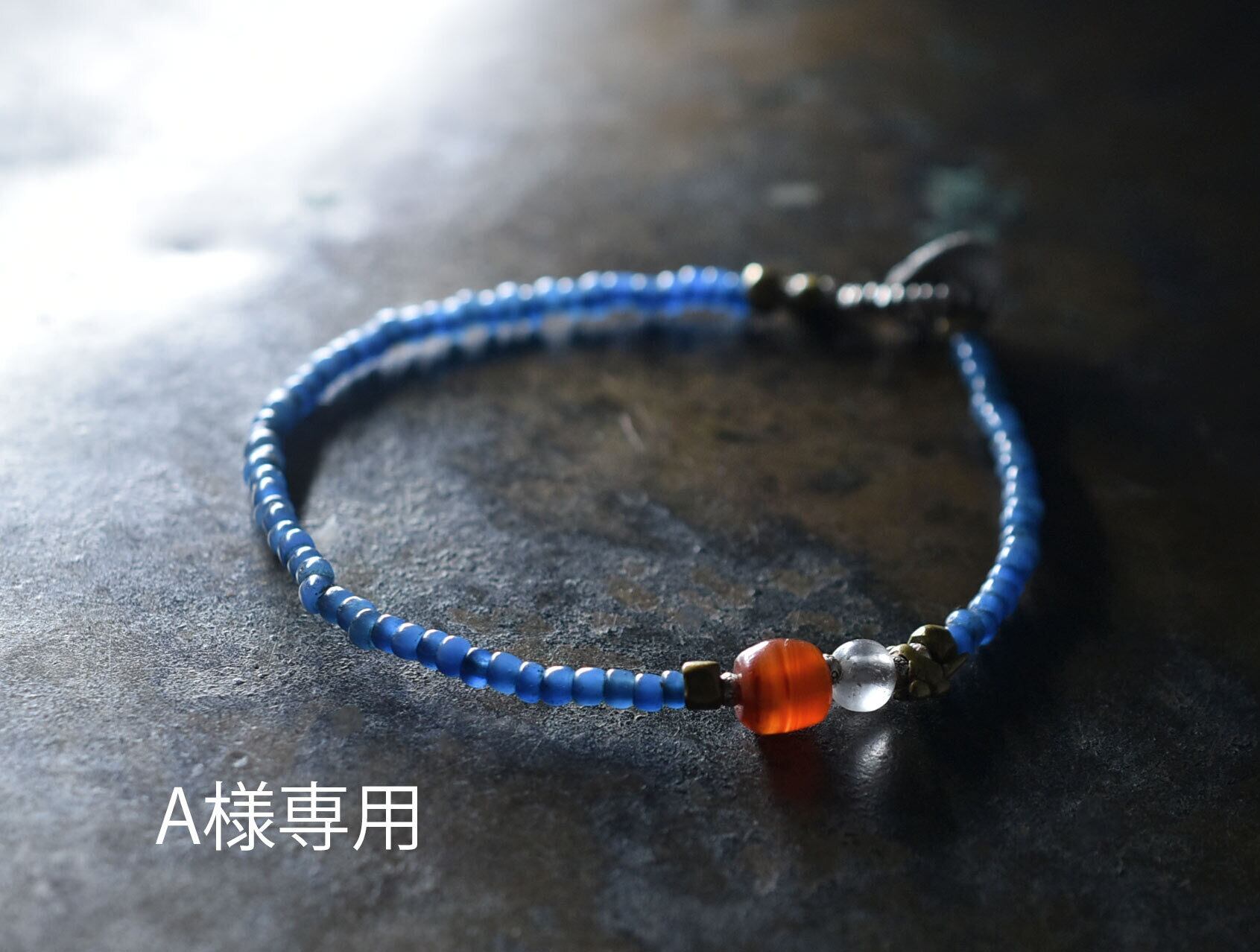 「A様専用」サックスブルービーズとミゾーラムカーネリアン、古代水晶、オリッサブラスの華奢なブレス