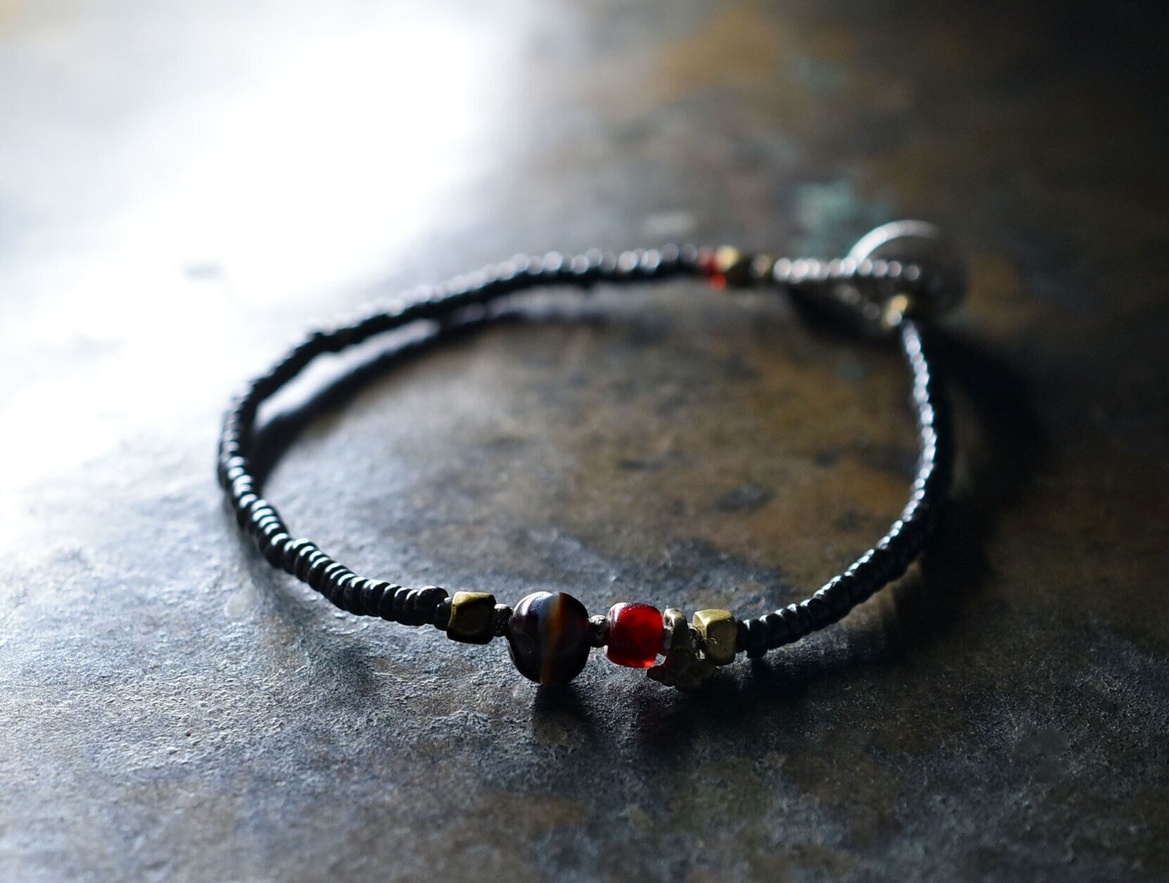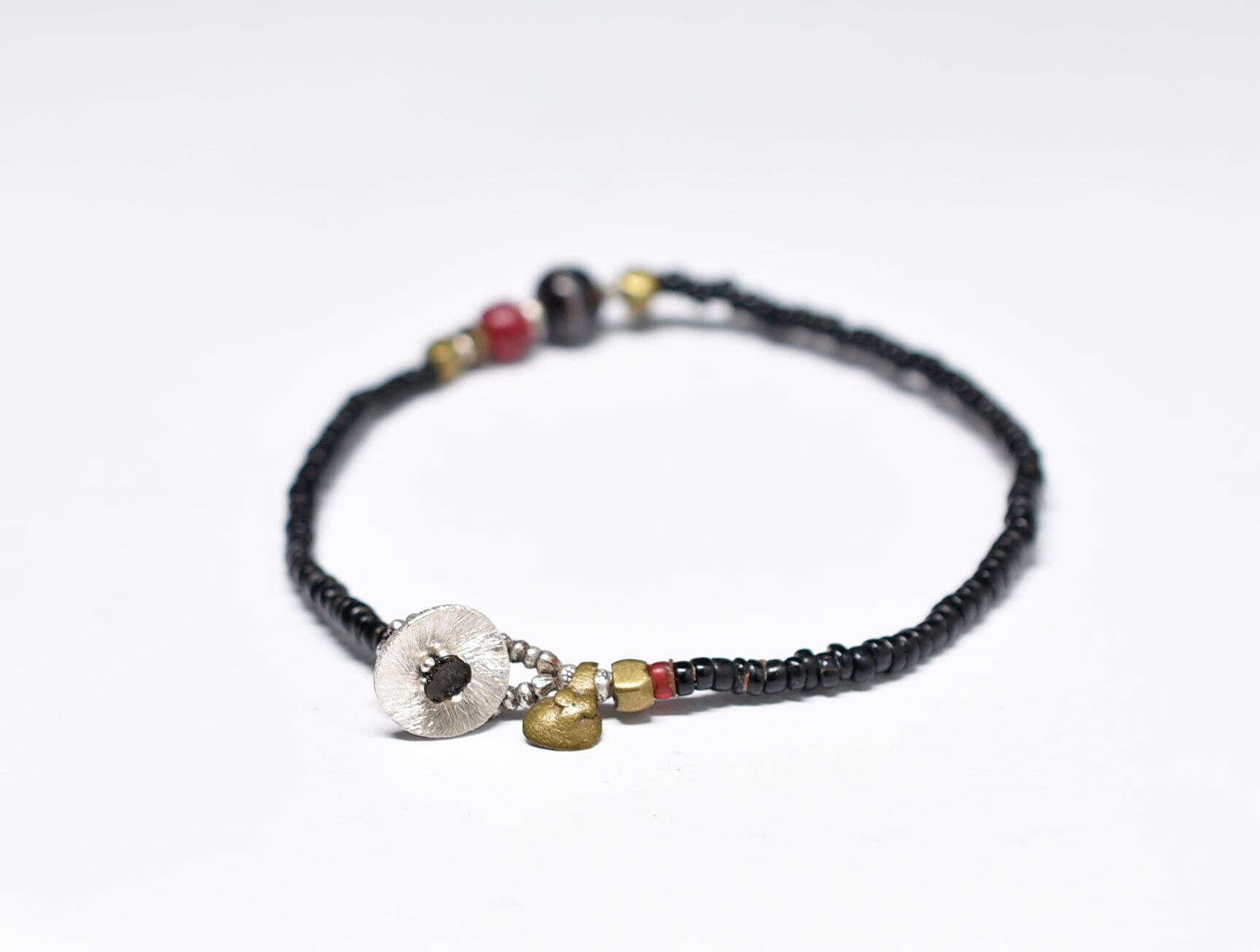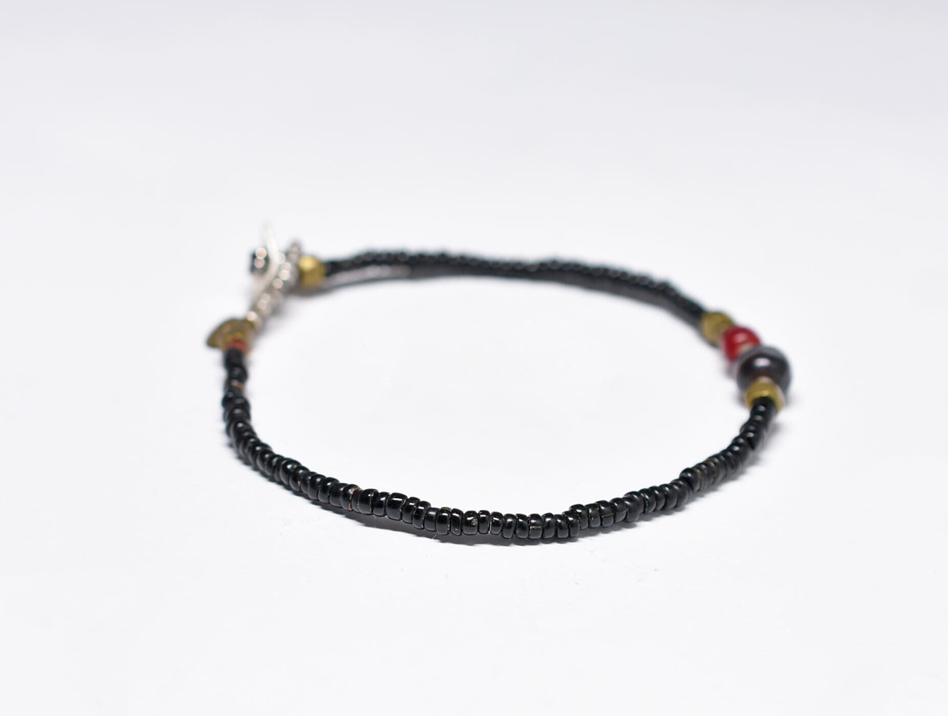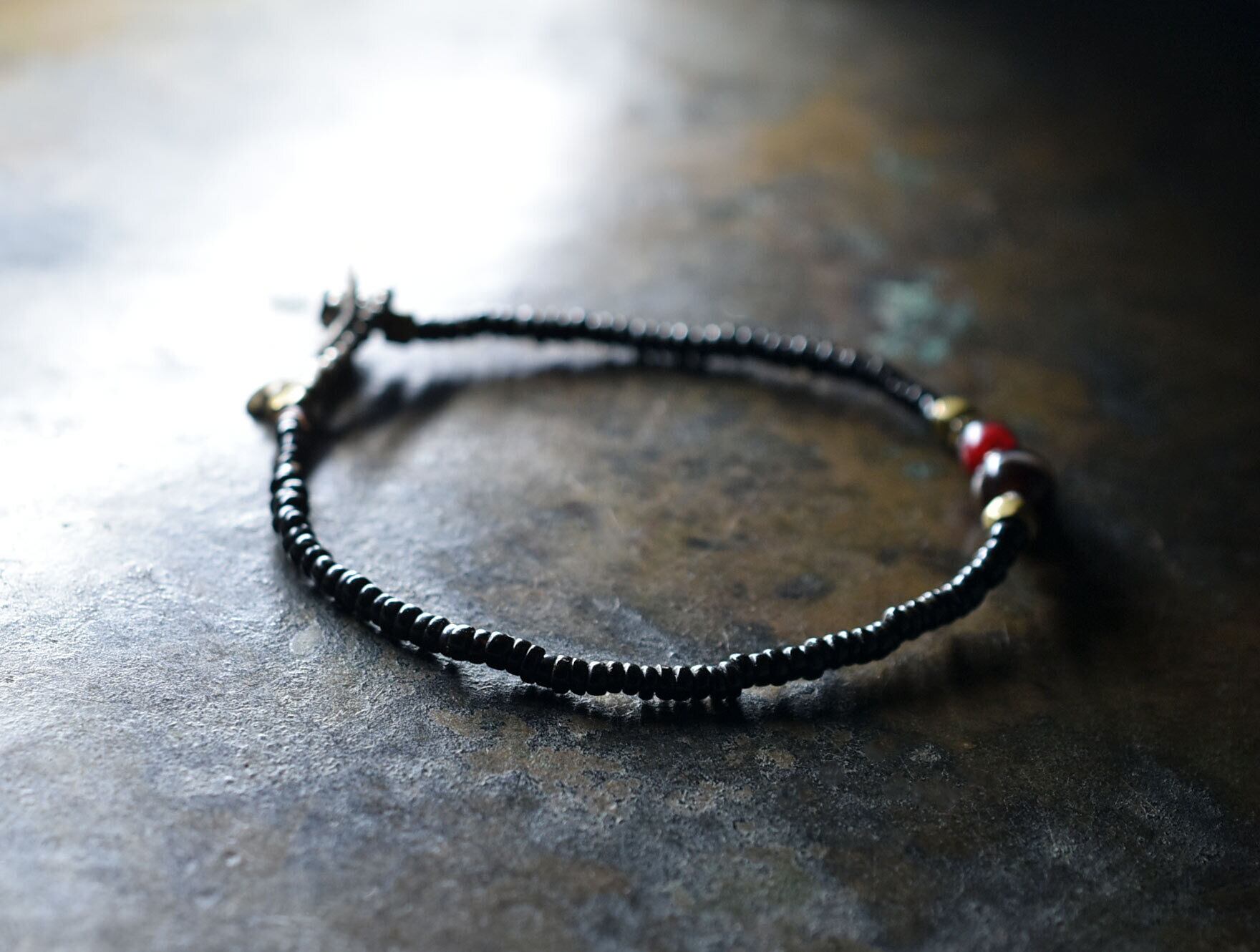 古代瑪瑙と濃赤ホワイトハーツ、オリッサブラス、漆黒ビーズを繋いだ華奢なブレスです。