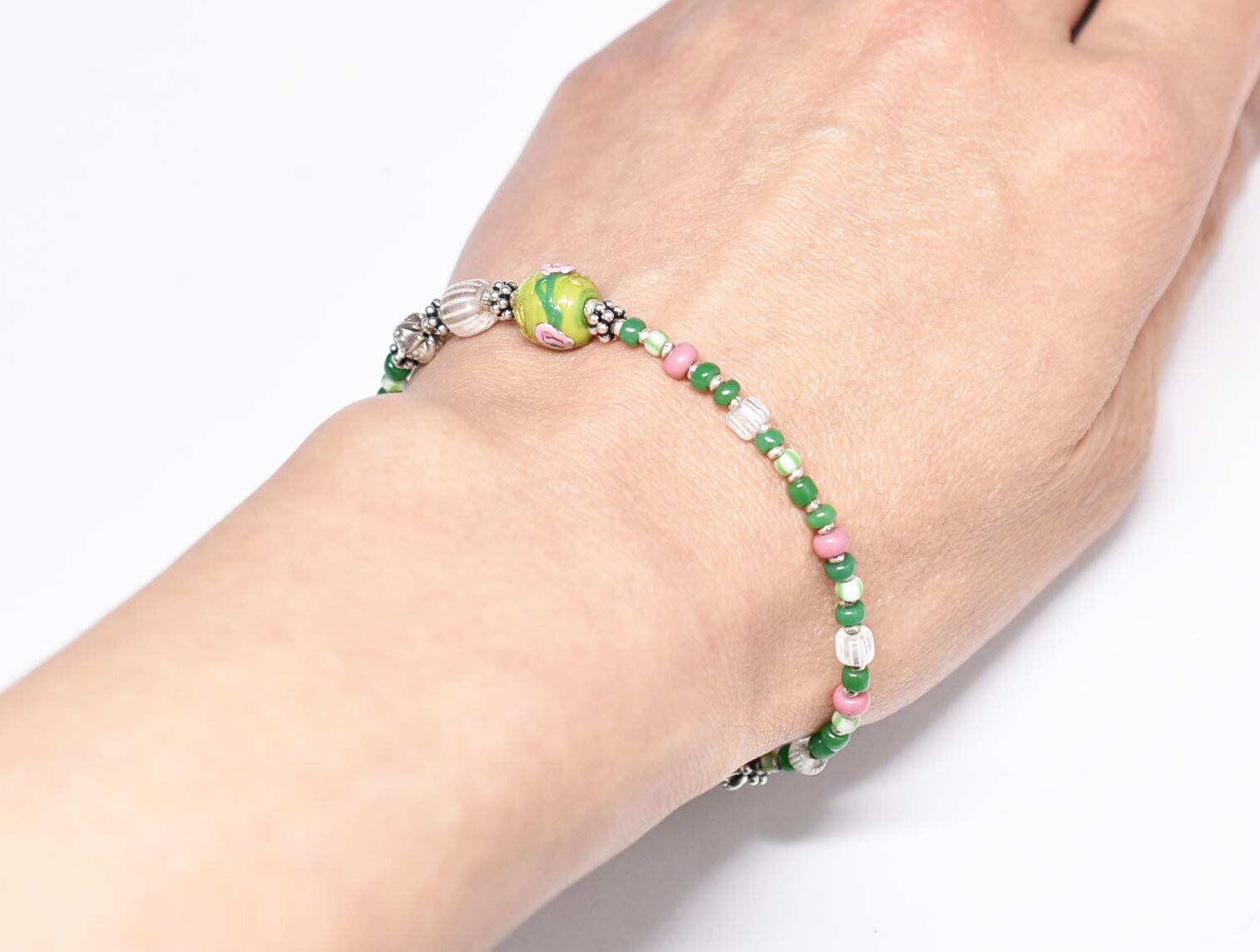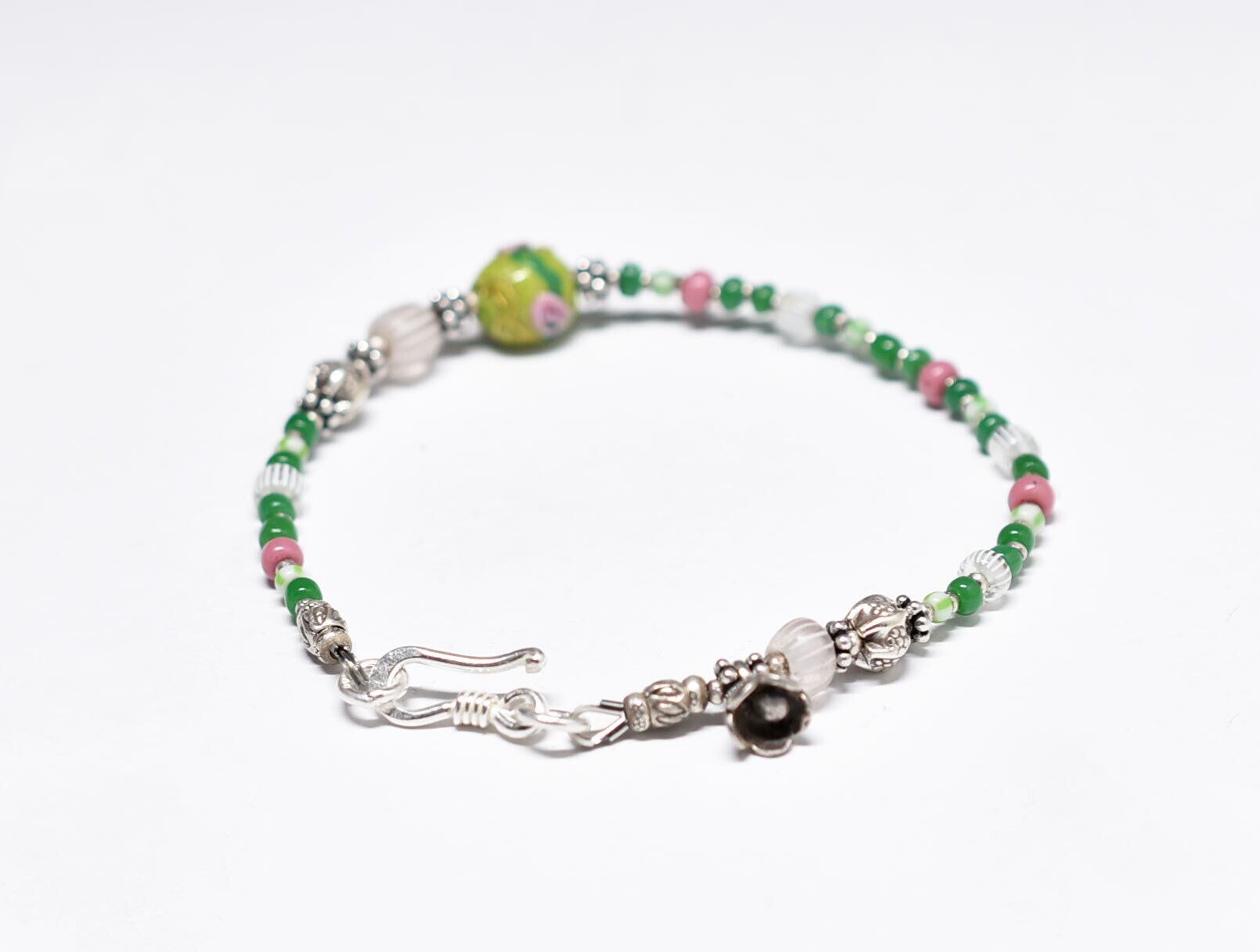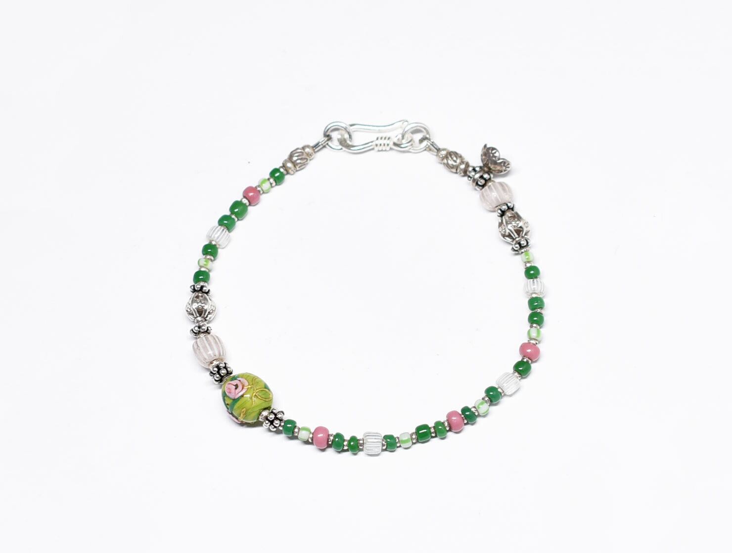 薔薇と蔦模様ヴェネチアアンティークビーズとグーズベリー、カレンシルバー、小さなアンティークビーズのブレス