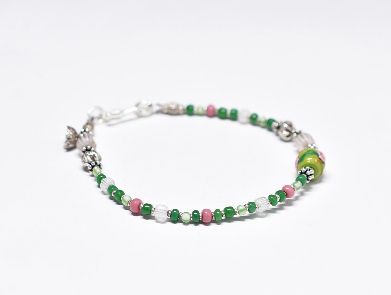 巾着の様な花の刻印が施されたビーズ、間の小さなビーズ、留め金、お花チャームはカレンシルバーです。