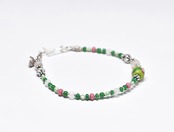 小さなグーズベリー、縞模様の入ったカンネビーズ、美しい翡翠色のビーズ、ピンクい色のビーズはピンクマサイと呼ばれるビーズです。
