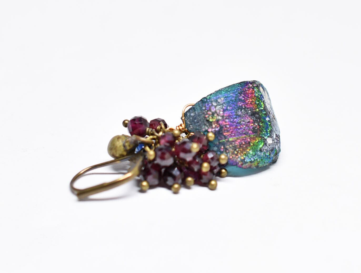 三日月型銀化ブルーローマングラスとたわわなガーネット、ハーキマーダイヤモンド、カイヤナイト、民族鈴の片耳ピアス