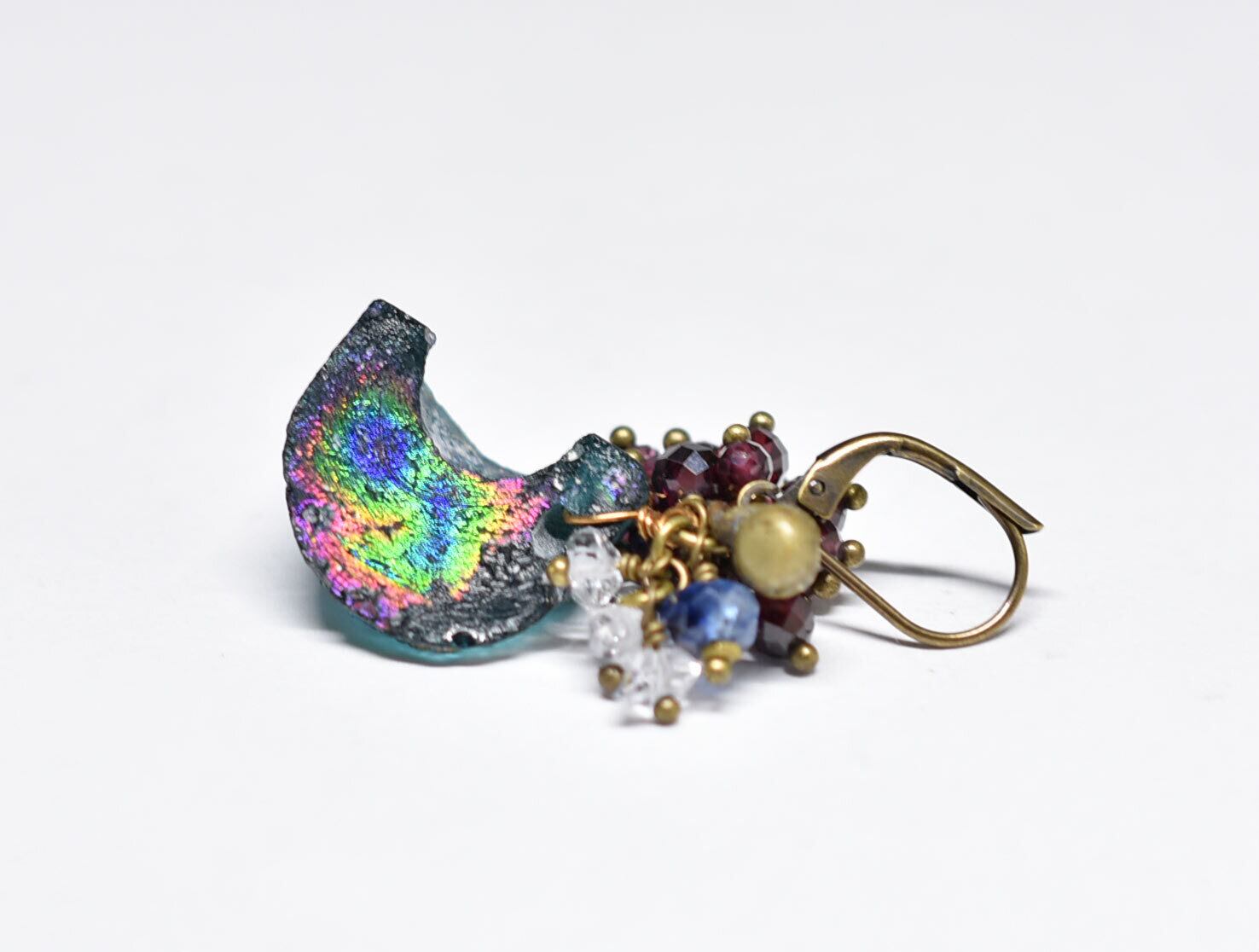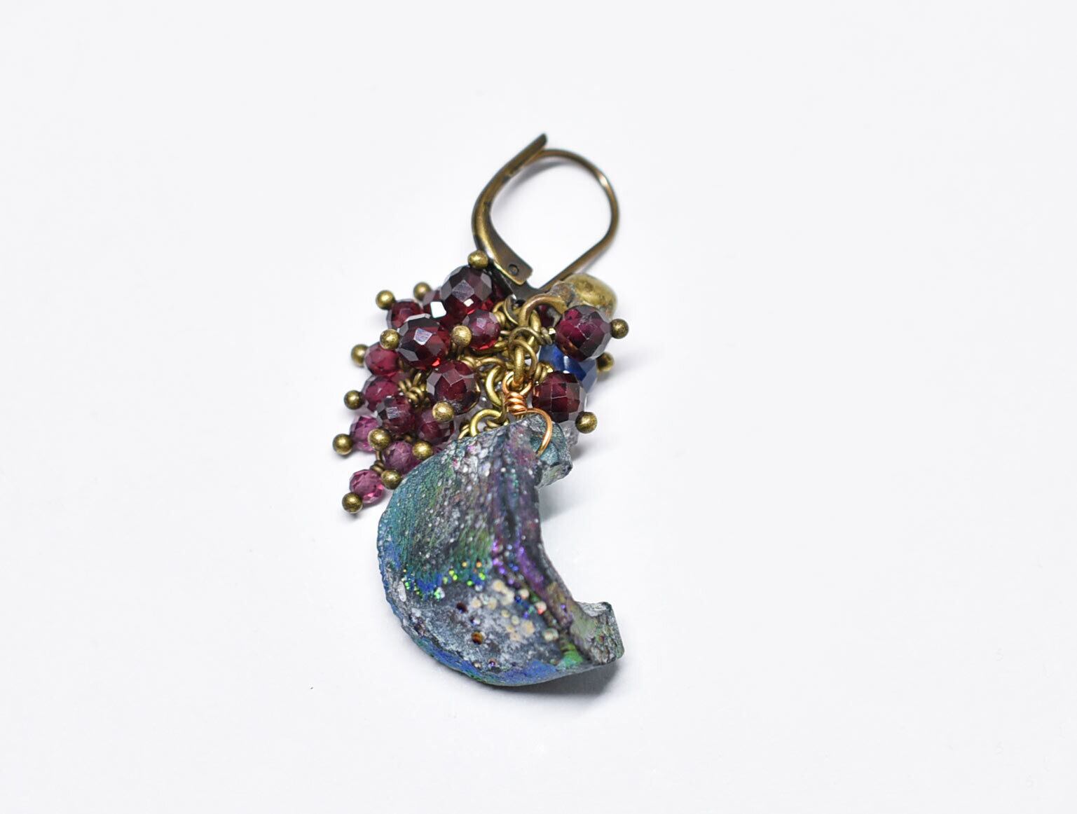 三日月型銀化ブルーローマングラスとたわわなガーネット、ハーキマーダイヤモンド、カイヤナイト、民族鈴を繋いだ片耳ピアスです。