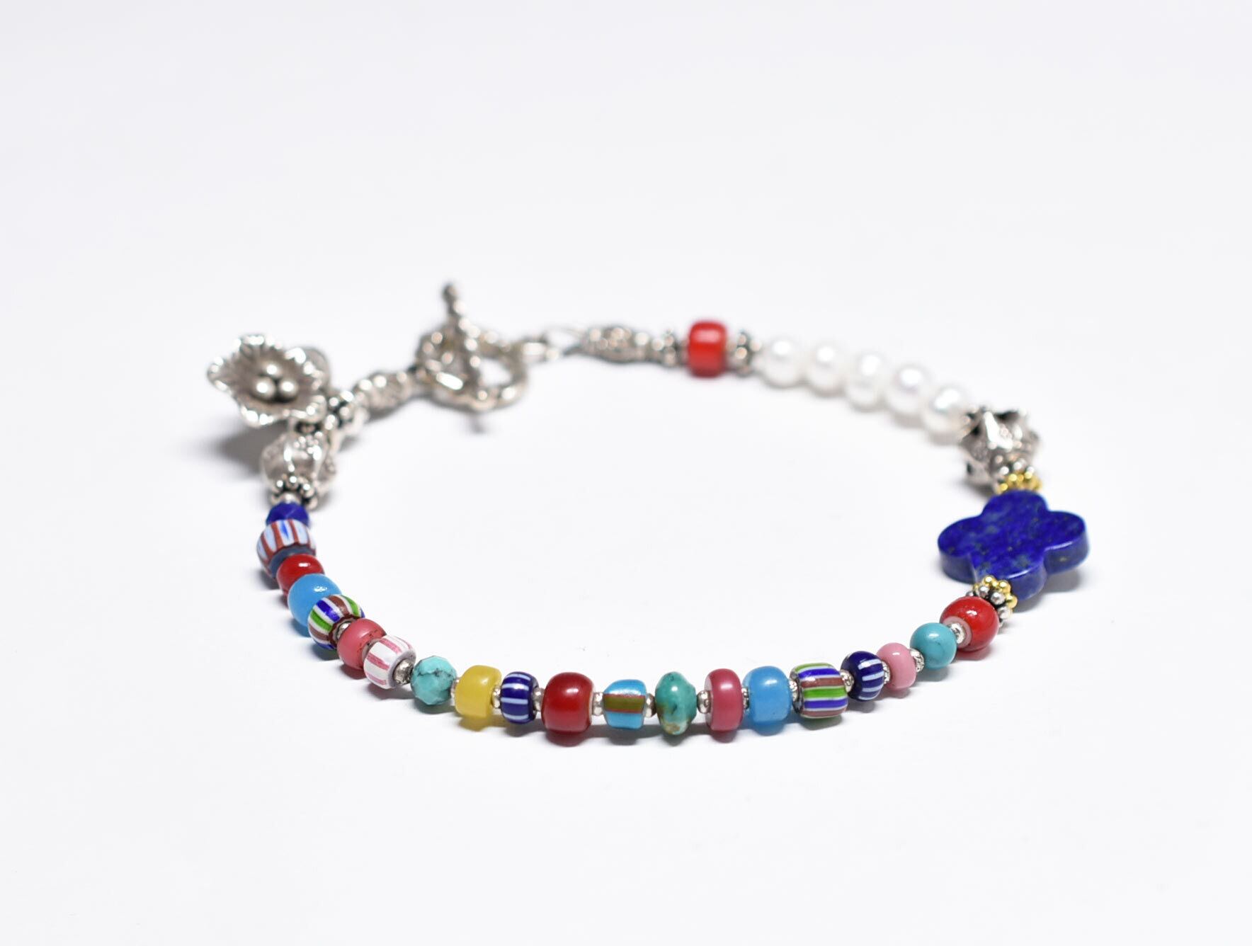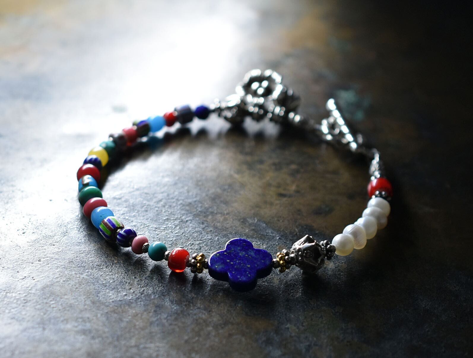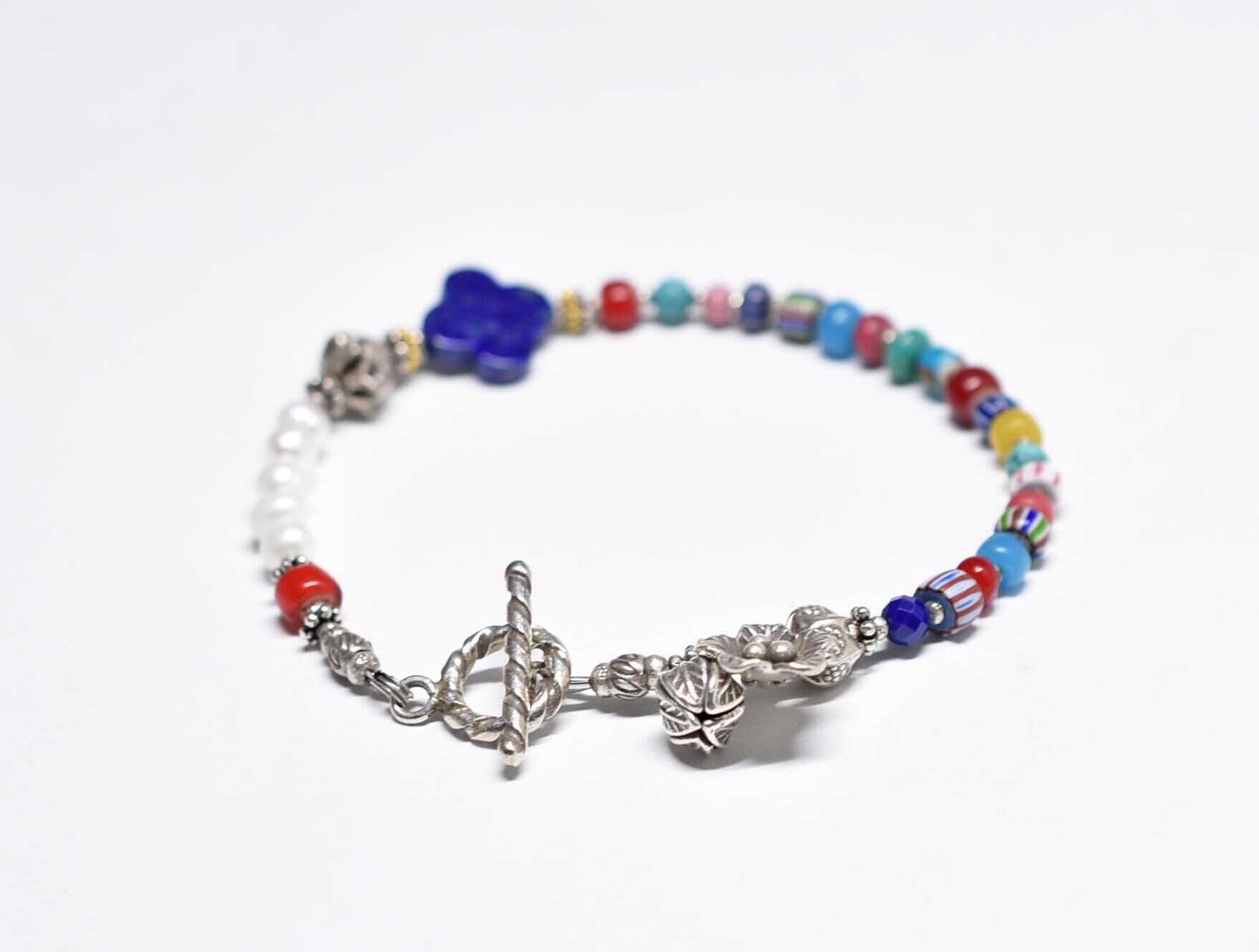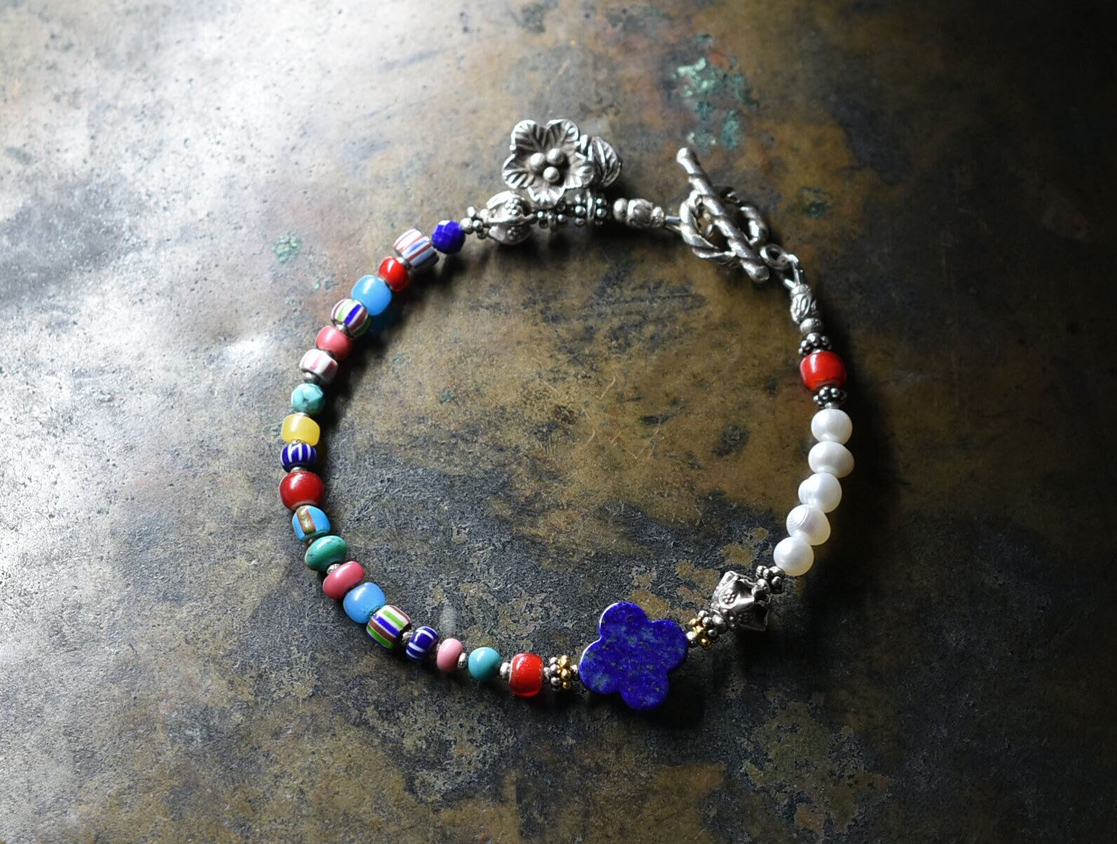 クローバーラピスラズリとパール、多彩ヴェネチアビーズ、カレンシルバーのブレス