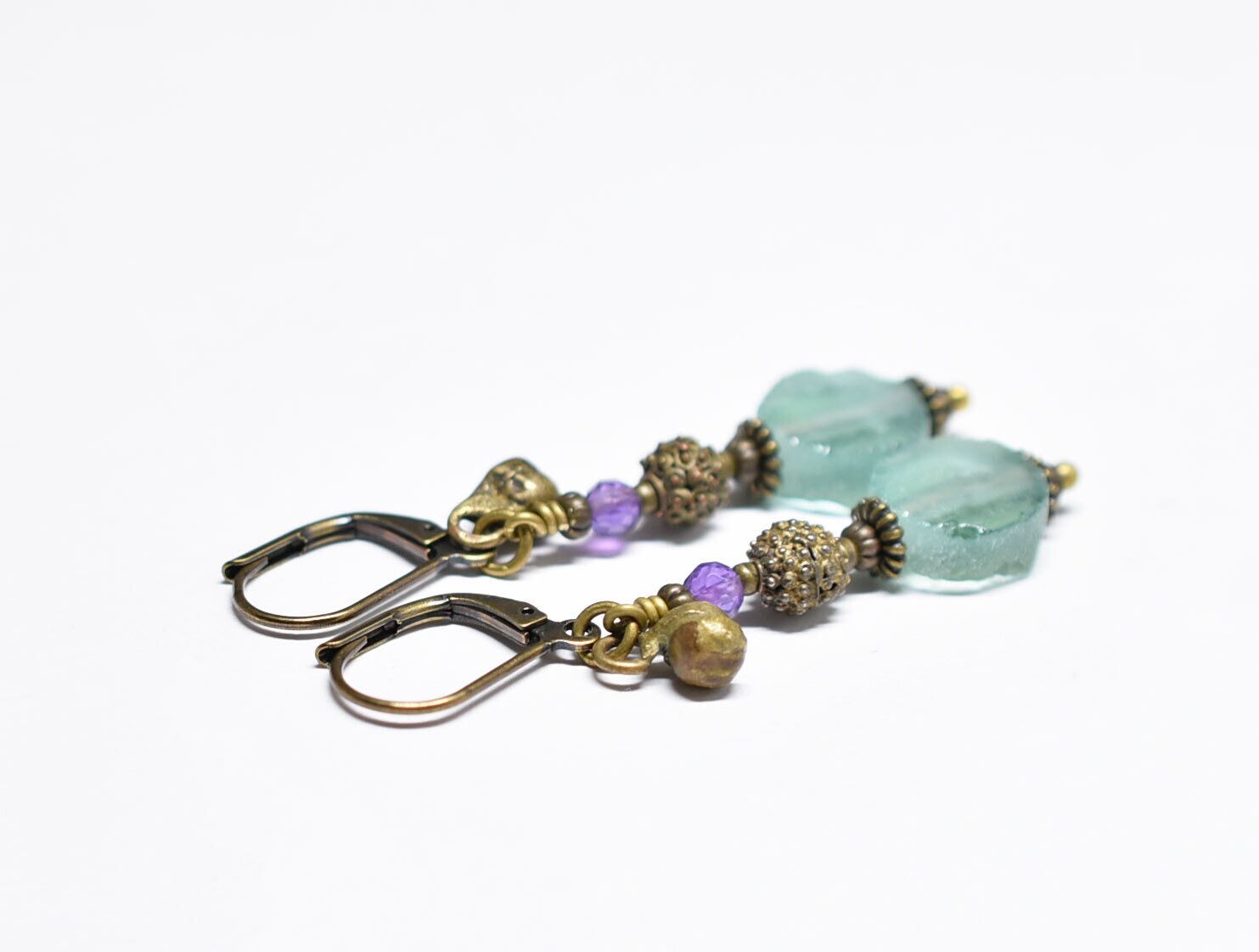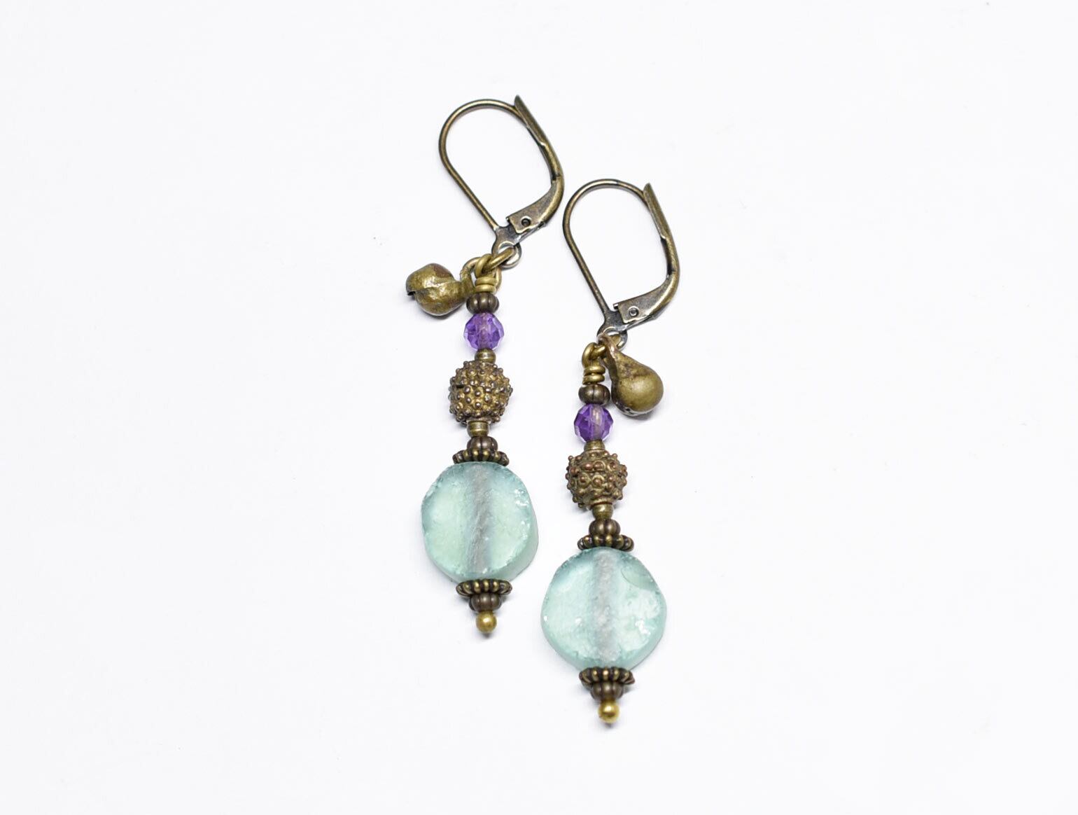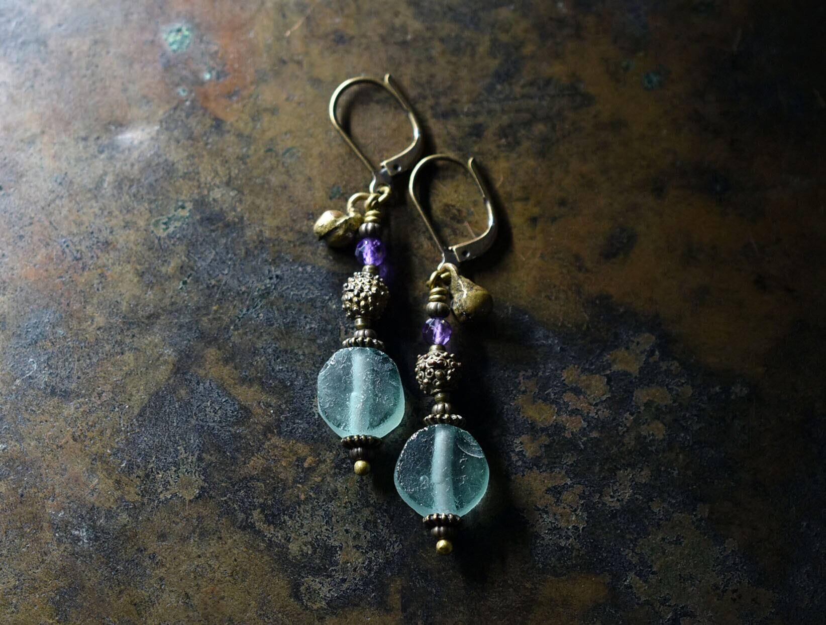 ソーダブルーローマングラスとつぶつぶブラス、アメジスト、民族鈴のピアス