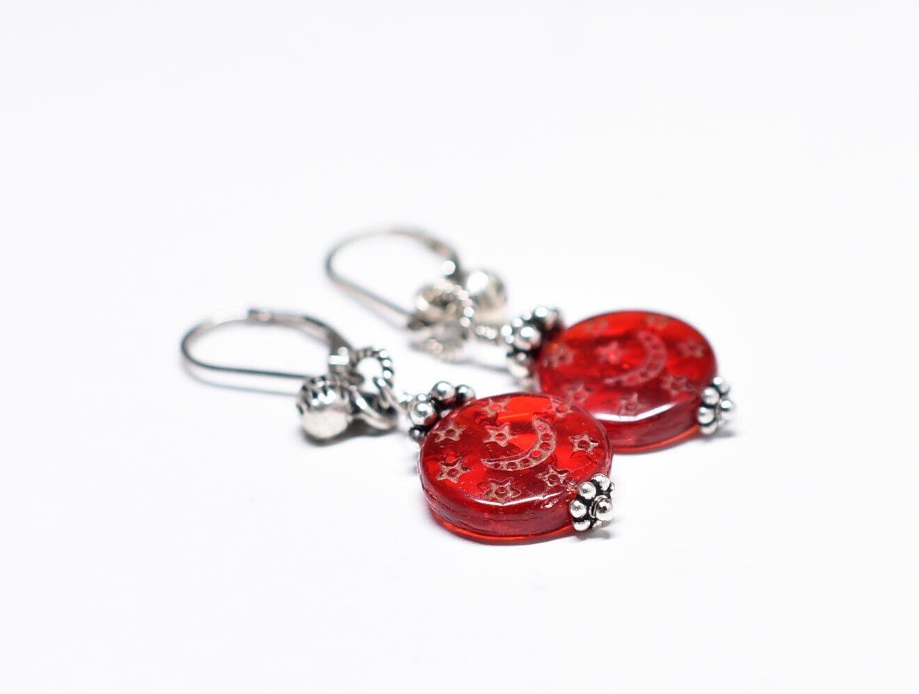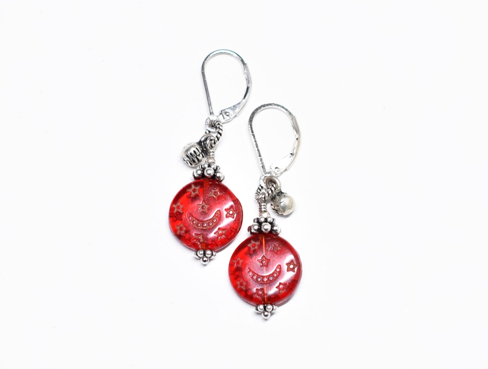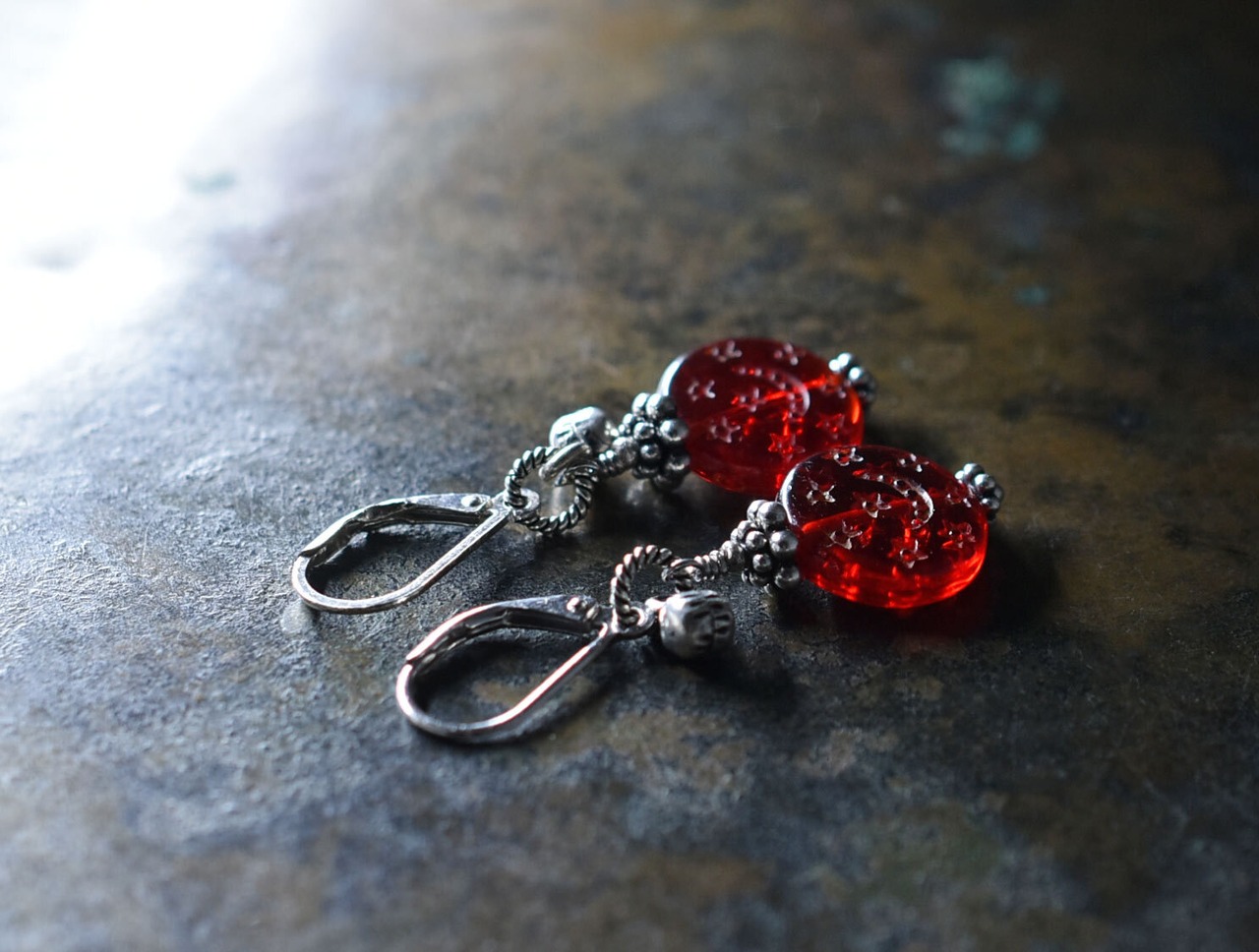 真っ赤な聖者のビーズが美しい民族感のあるピアスです。