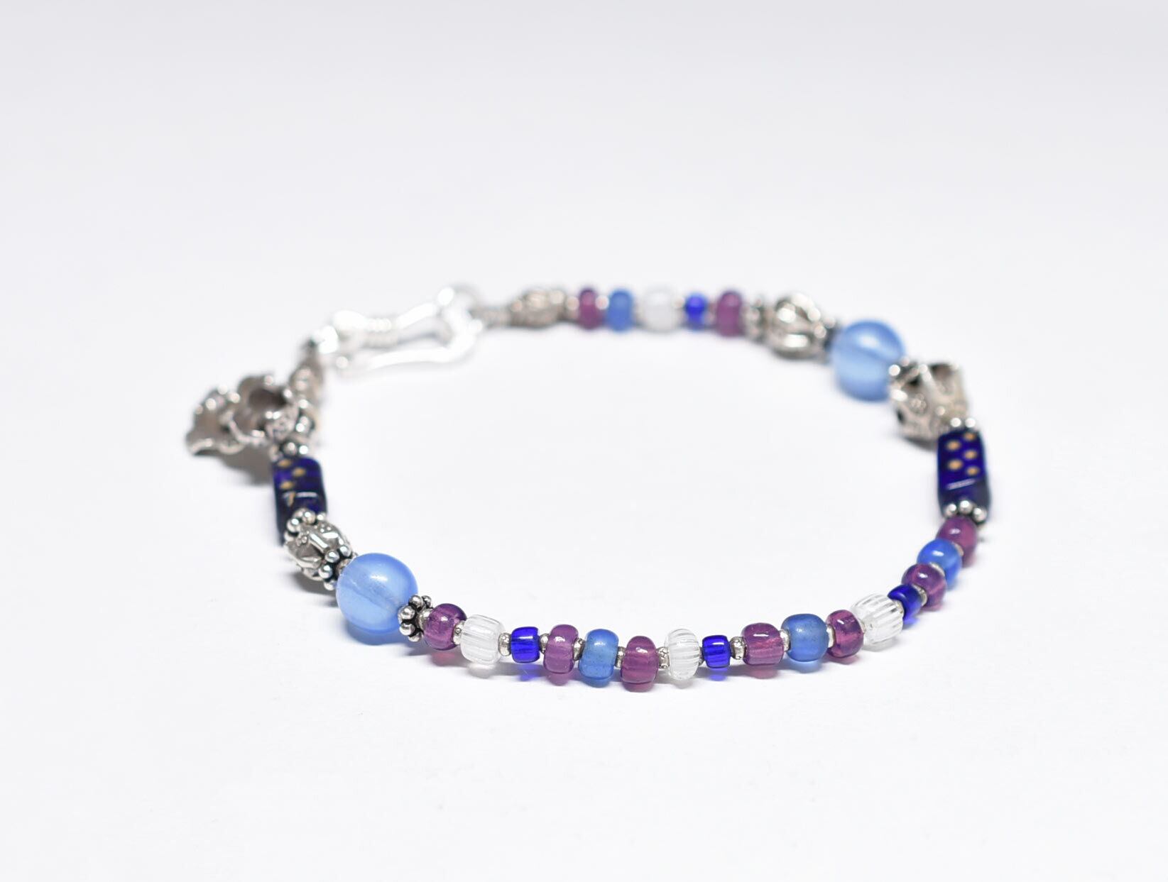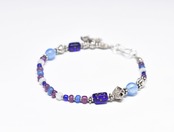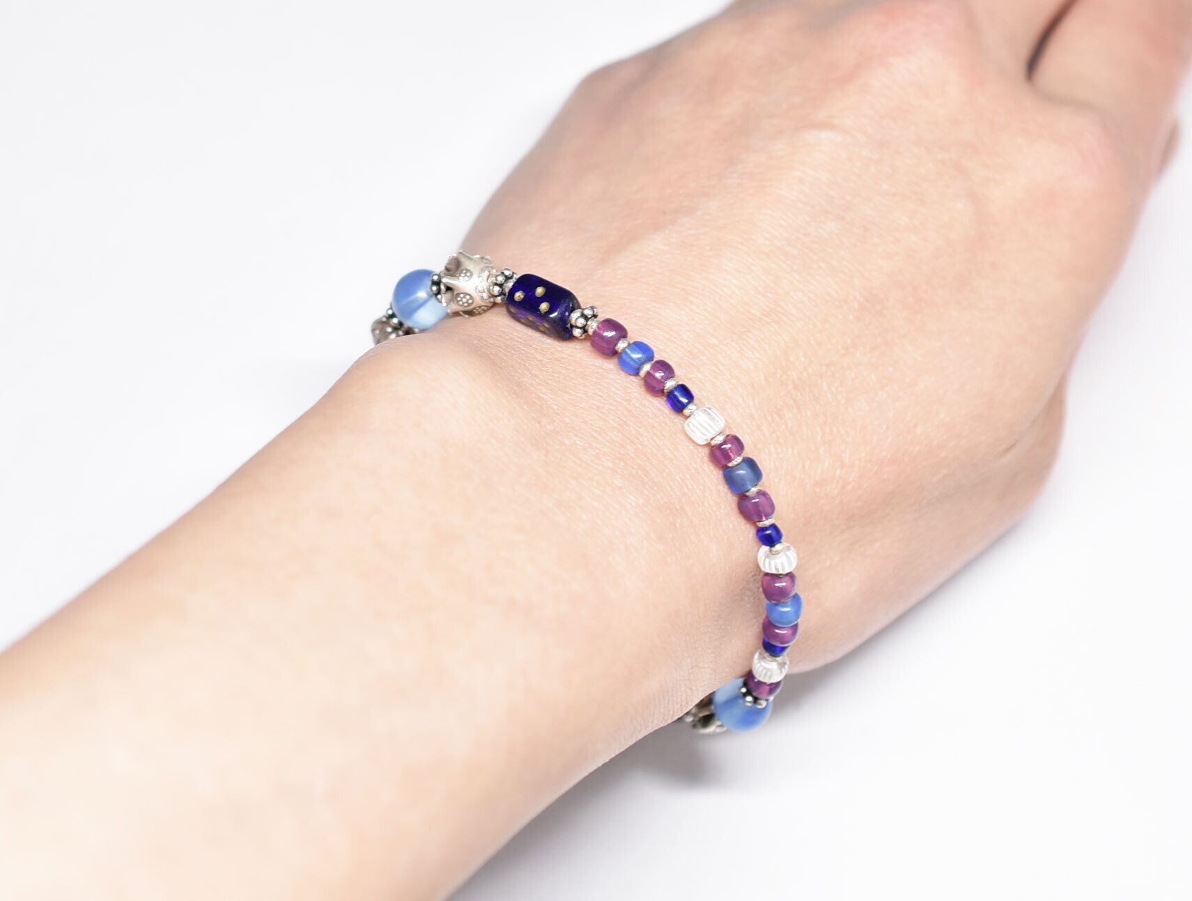 瑠璃色ダイスビーズと青藤色&瑠璃色&すみれ色ビーズ、グーズベリー、カレンシルバーを繋いだブレスです。
