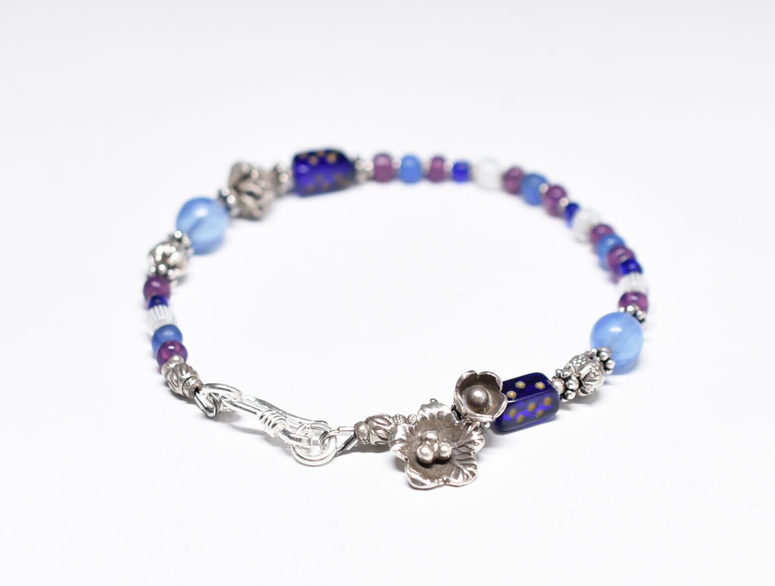 瑠璃色ダイスビーズと青藤色&瑠璃色&すみれ色ビーズ、グーズベリー、カレンシルバーのブレス