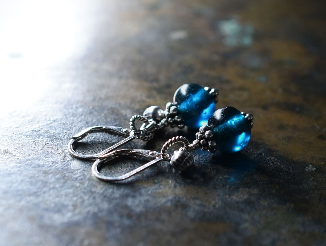 ブルーヴィンテージビーズとインドシルバー鈴のピアス