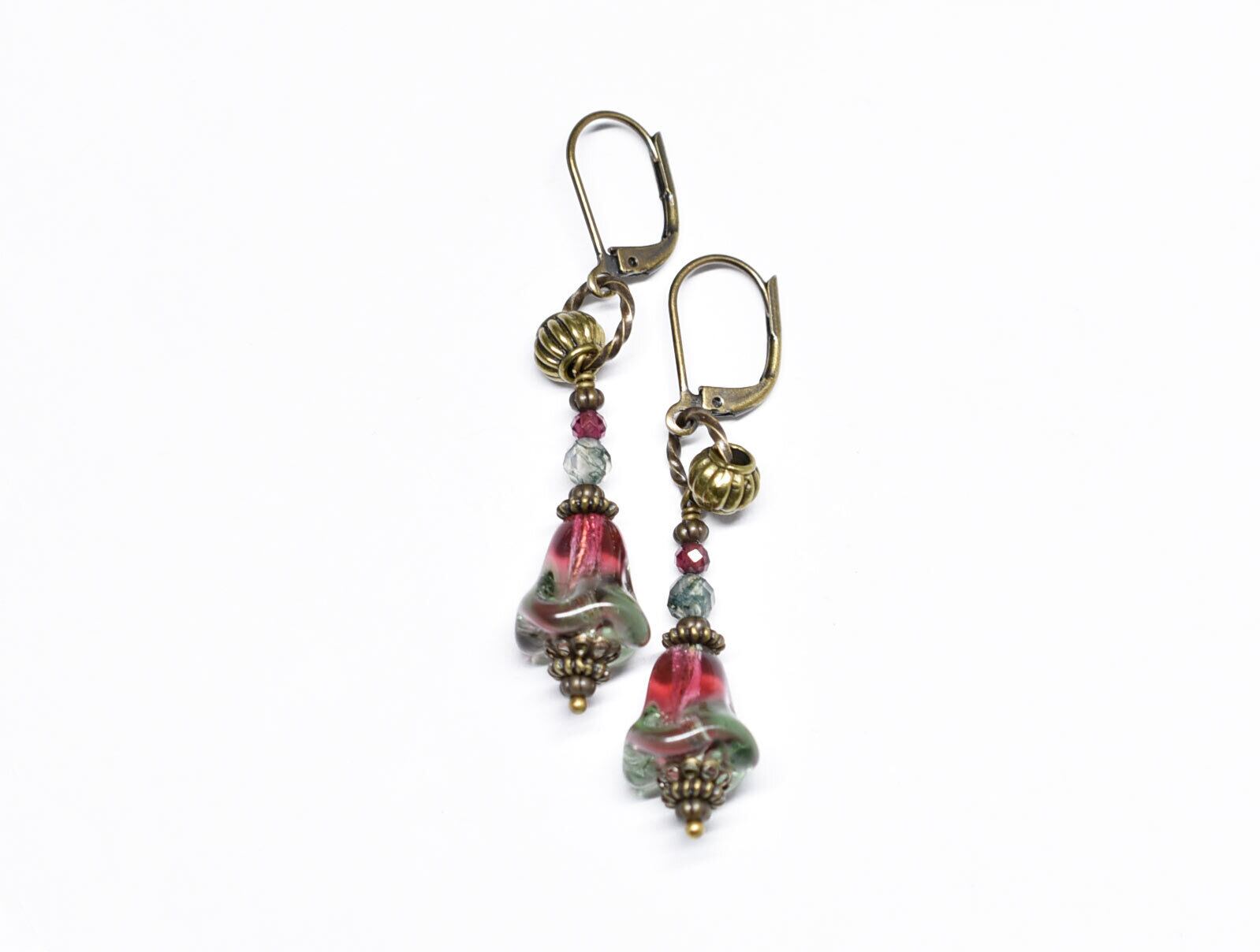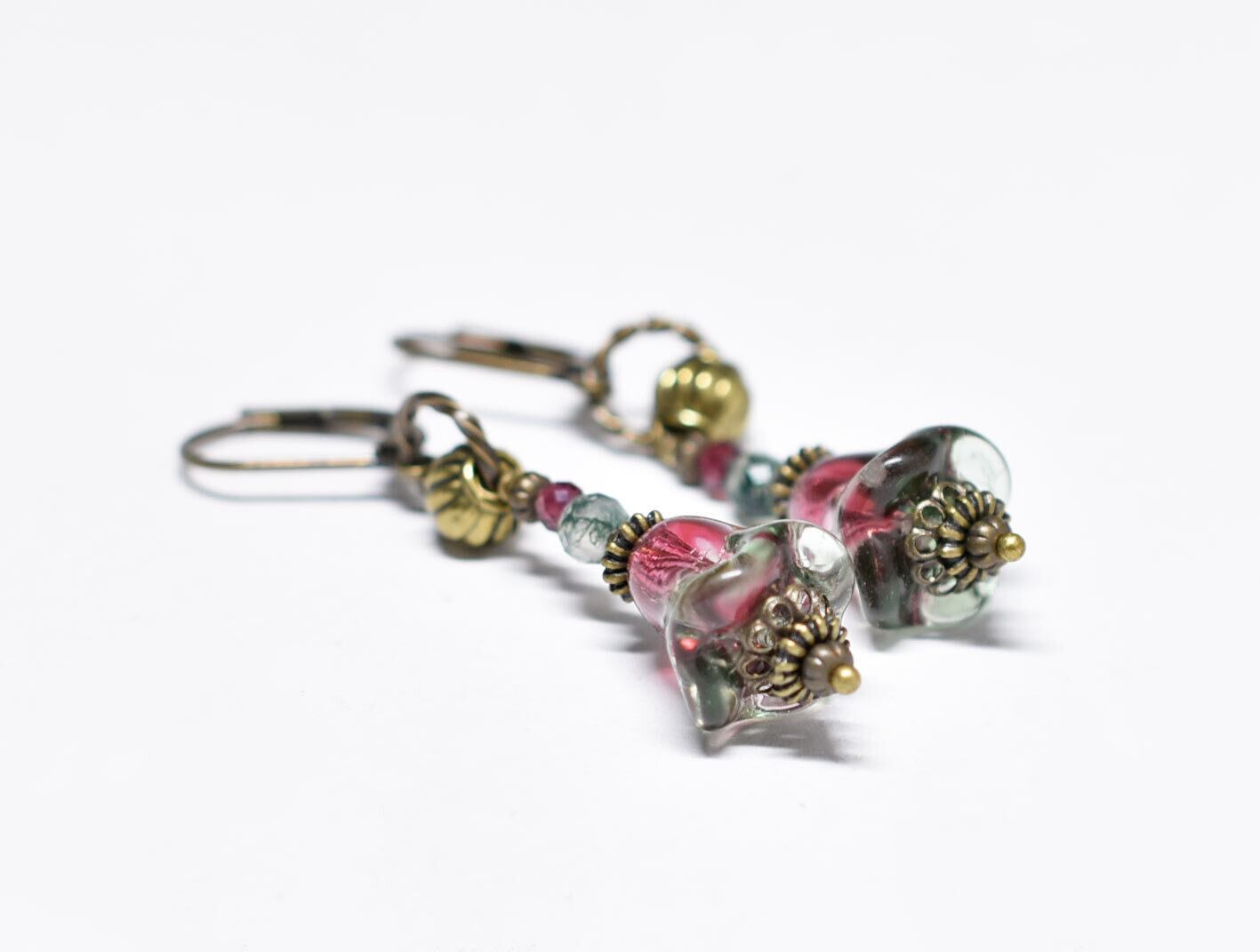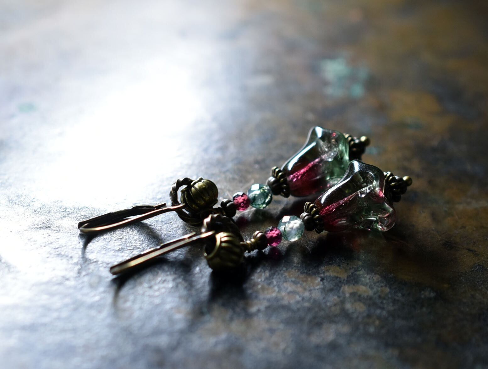 エンジェルトランペットの様なドイツヴィンテージビーズとガーネット&モスアゲートなどを繋いだピアスです。