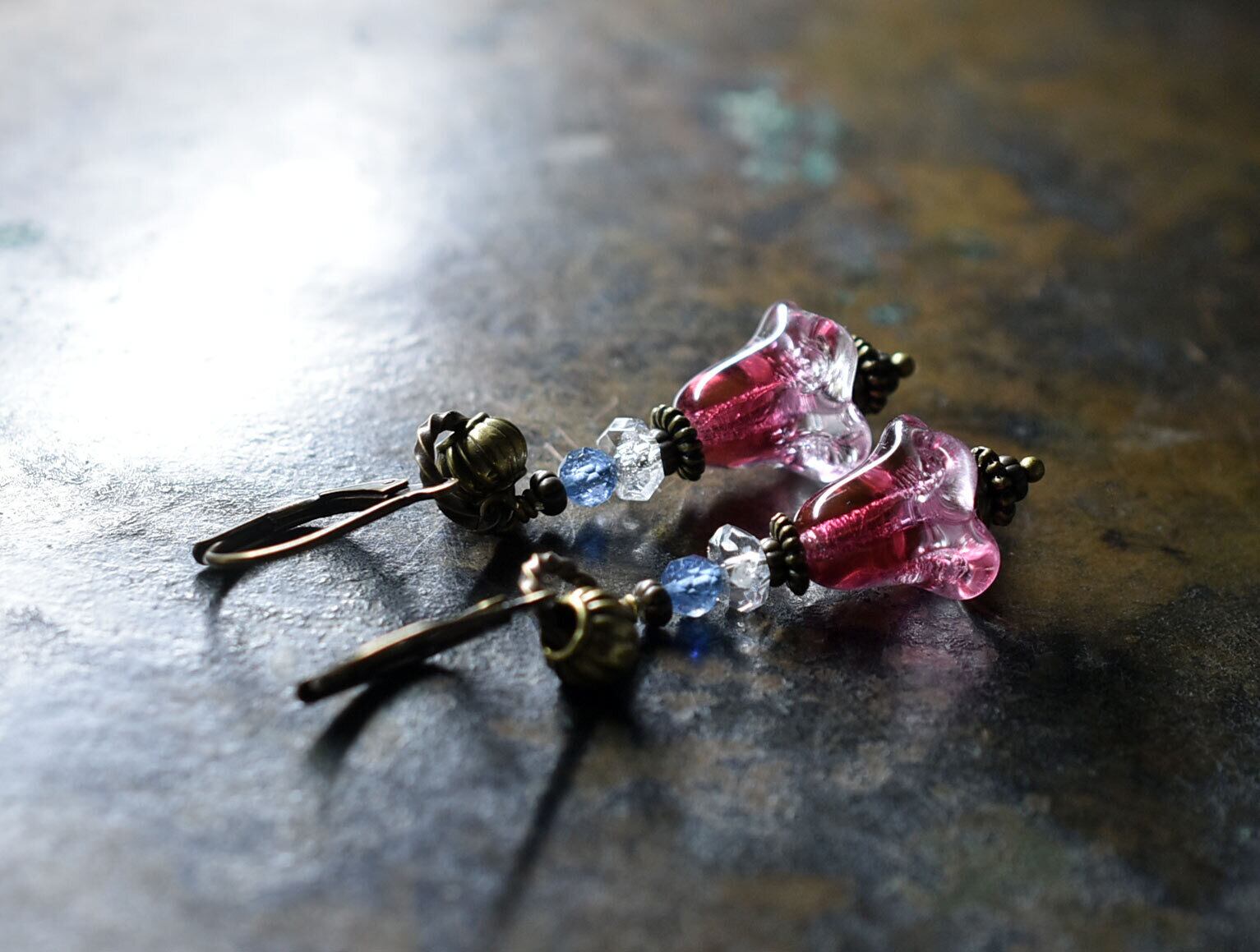 エンジェルトランペットの様なドイツヴィンテージビーズとクォーツ&アクアマリントなどを繋いだピアスです。