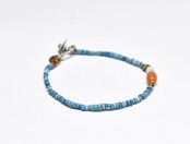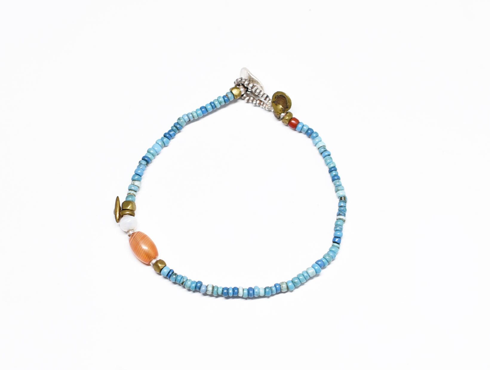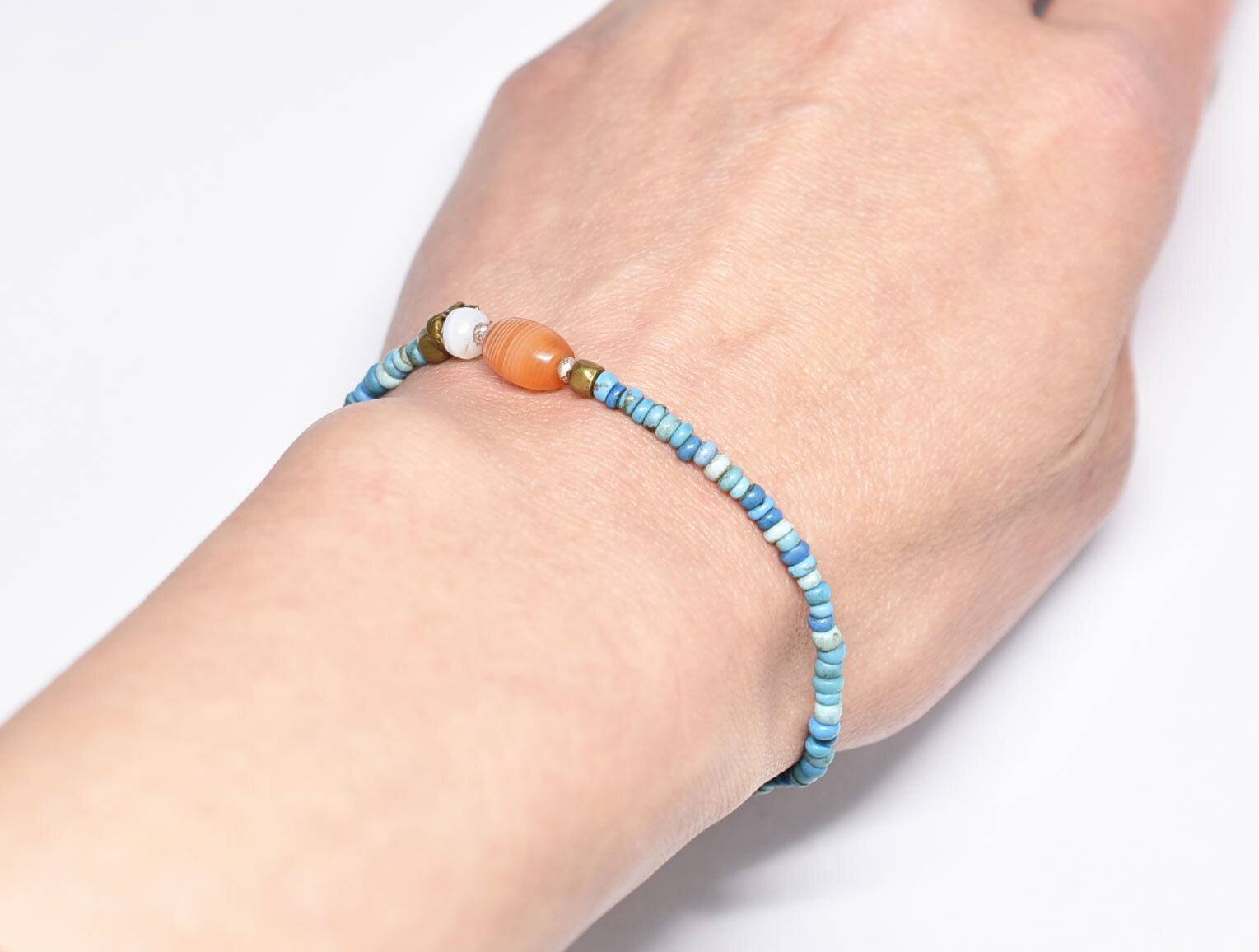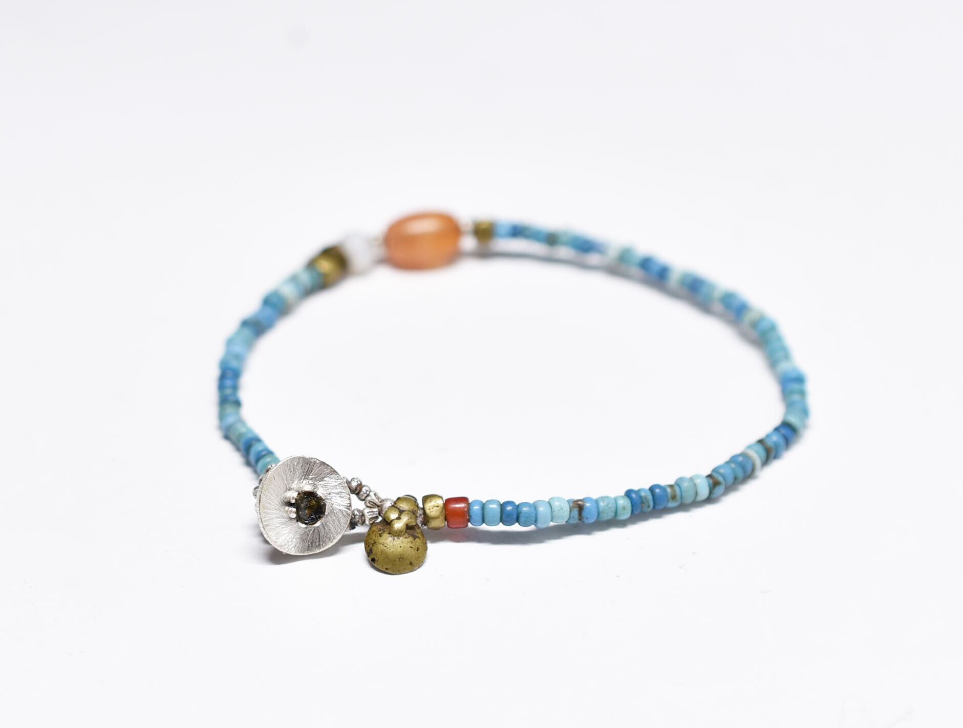 多彩水色シードビーズとシャン族ヴィンテージカーネリアン、古代瑪瑙、oldオリッサブラスを繋いだ華奢なブレスです。
