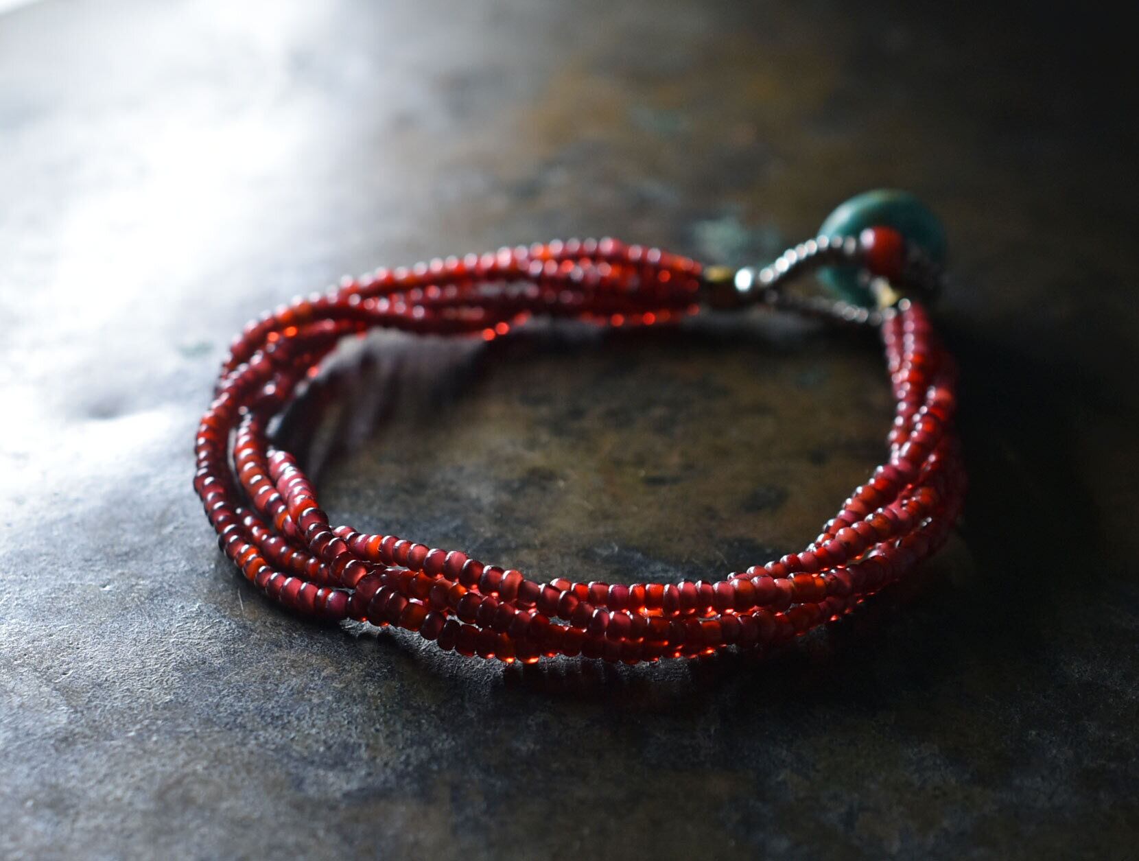 様々な赤色のビーズはホワイトハーツと呼ばれるアンティークビーズです。芯(ハート)部分が白いことからこう呼ばれています。こちらは19~20世紀頃のヴェネチア産のビーズです。特にピンク色の様な渋い赤色は金で赤色を発色させているため、このようなお色をしています、