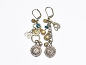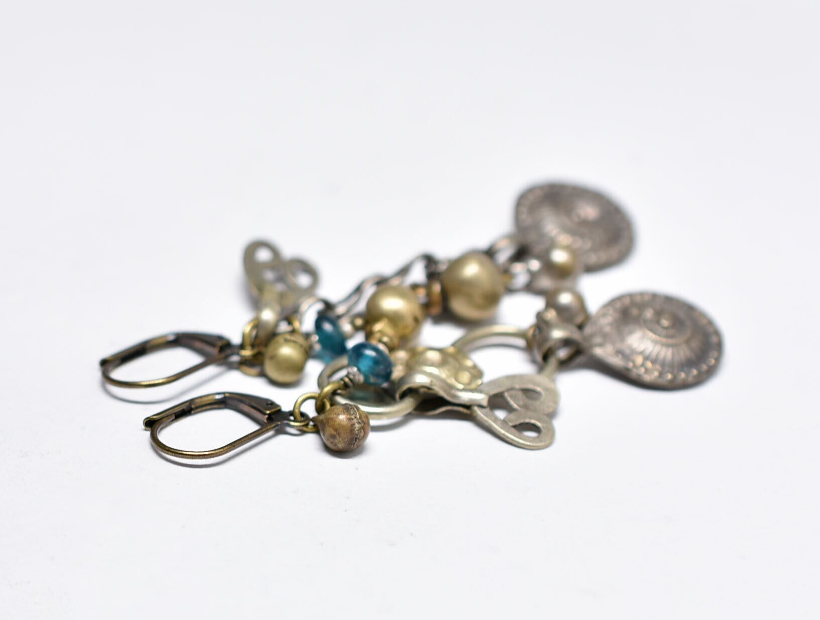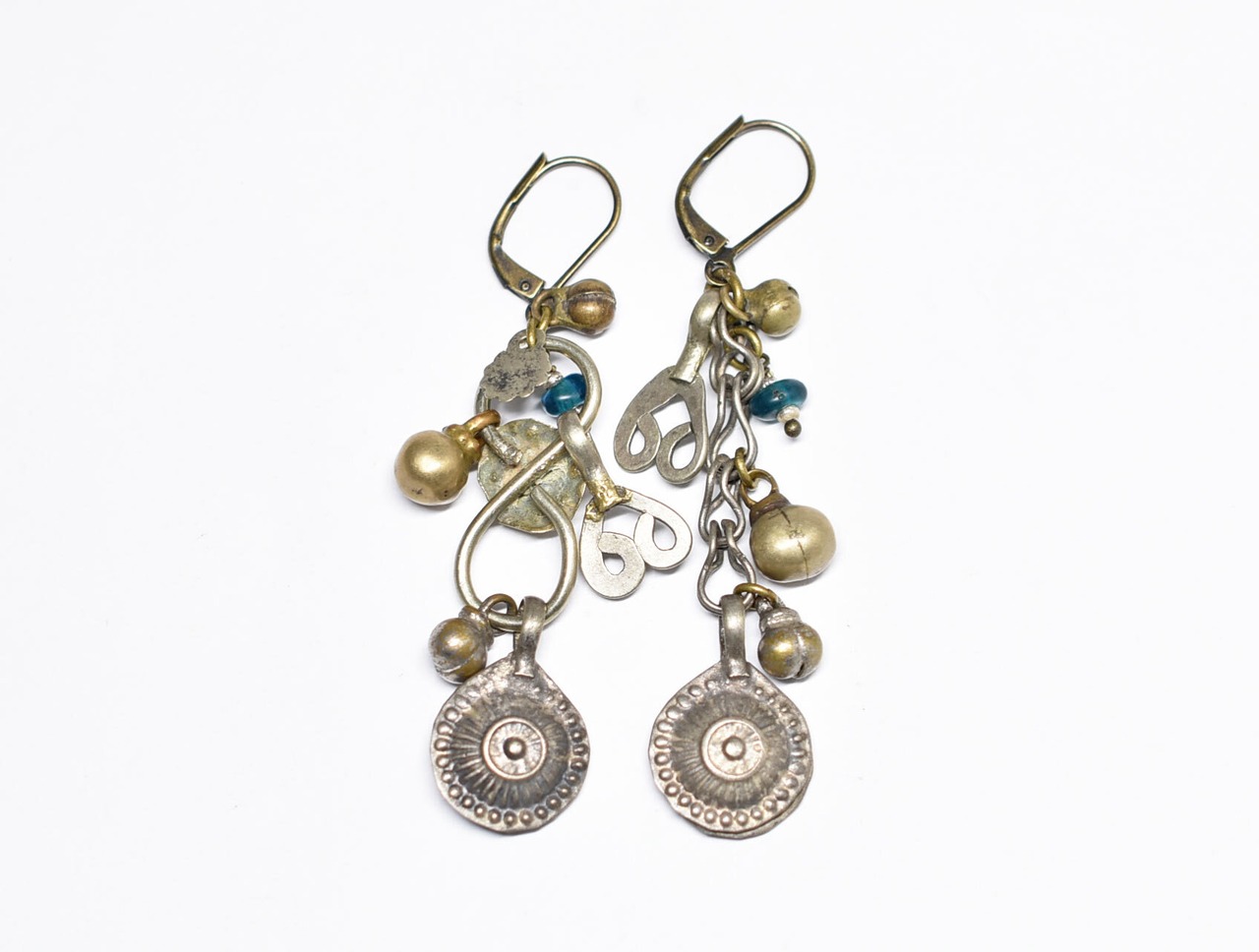 アフガンメタルと民族鈴、エメラルドブルービーズを繋いだアンシメトリーなピアスです。