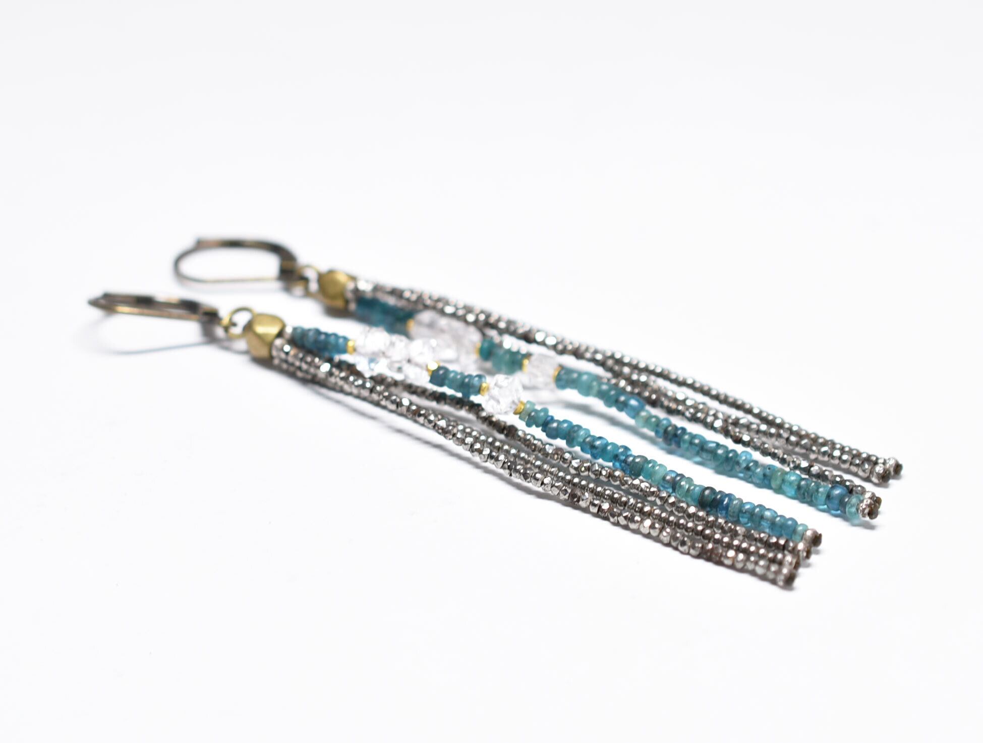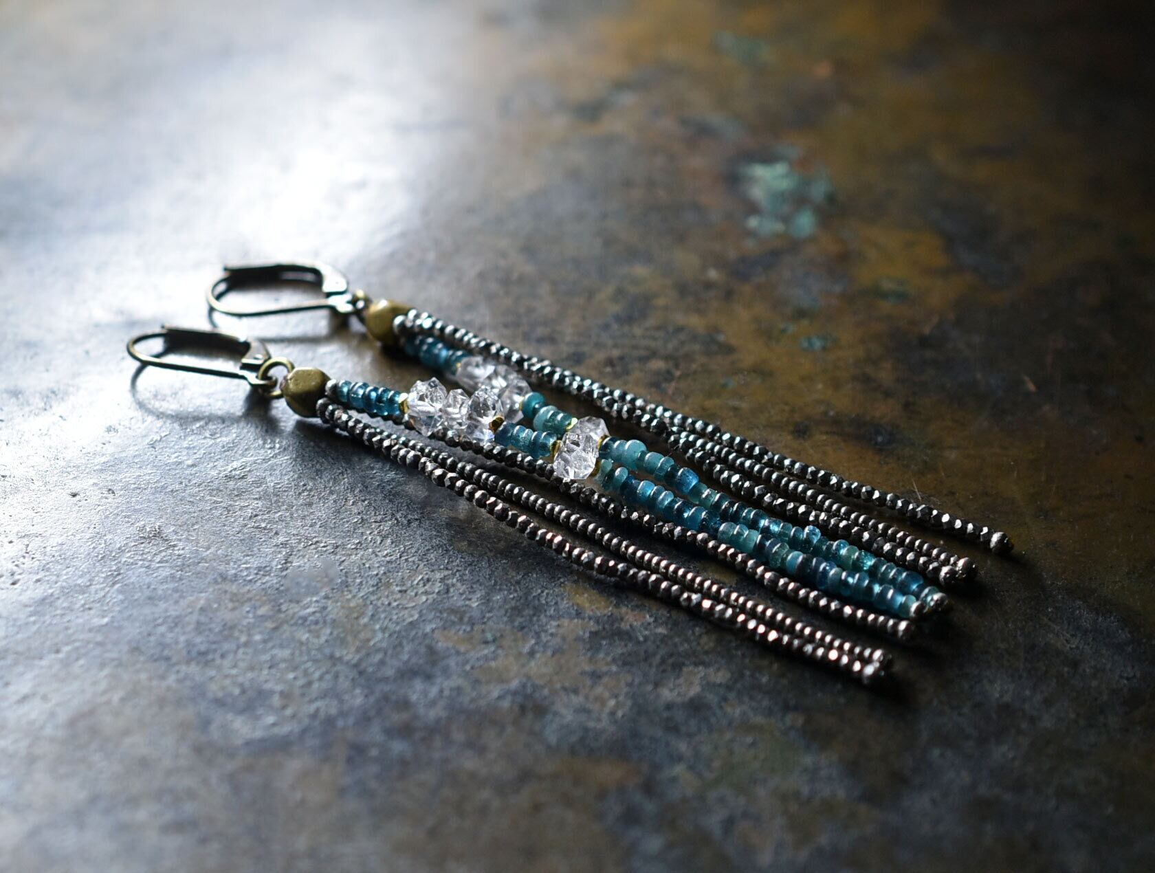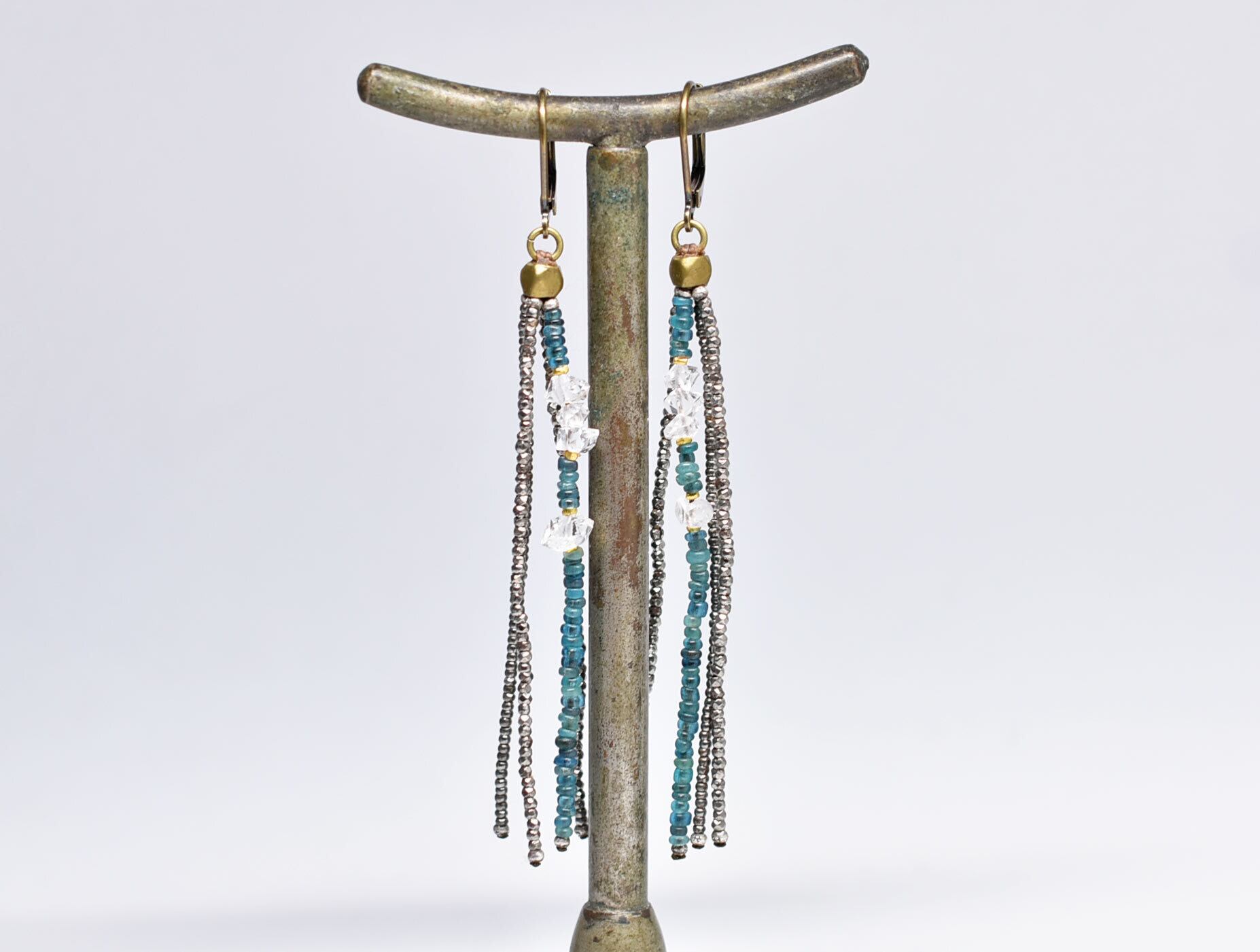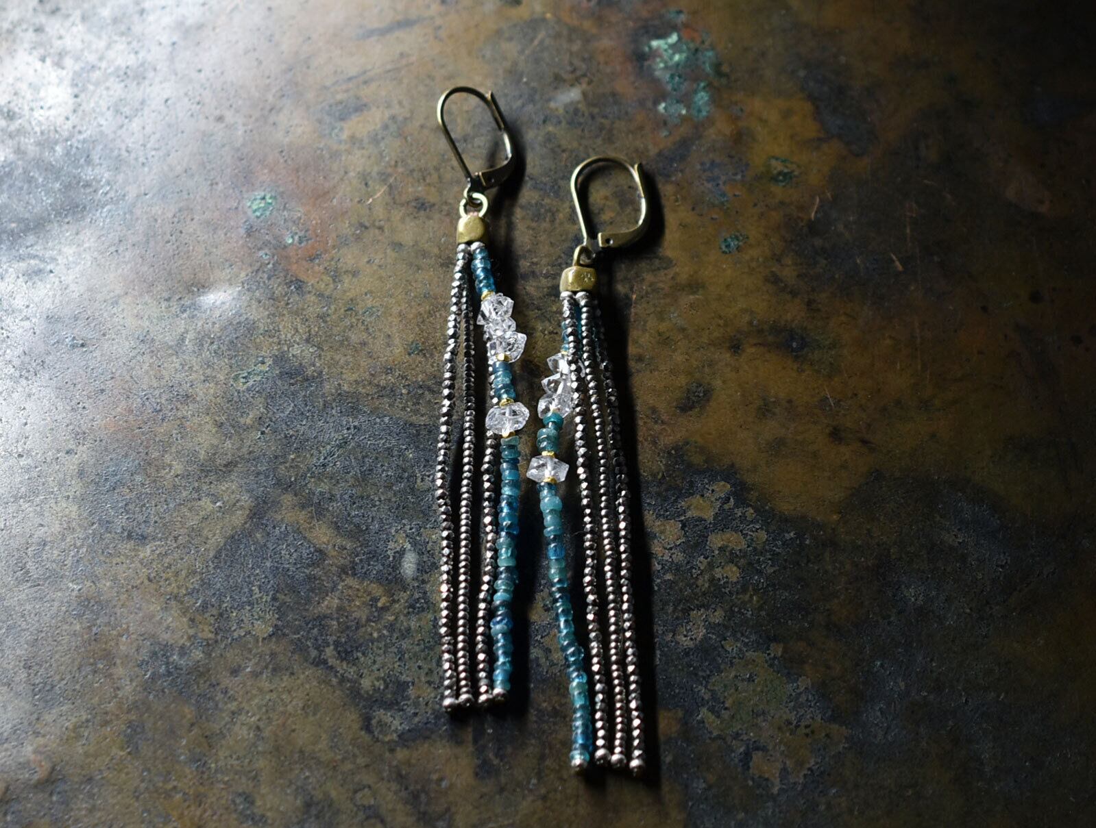 フランスアンティークカットスチールビーズとエメラルドブルーアンティークビーズ、ハーキマーダイヤモンドを繋いだ4連のピアスです。