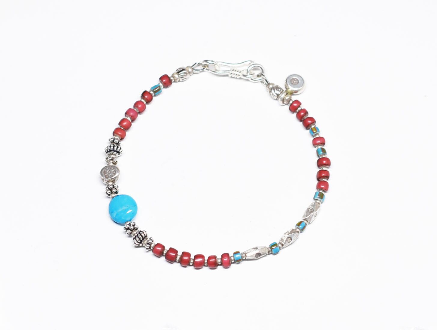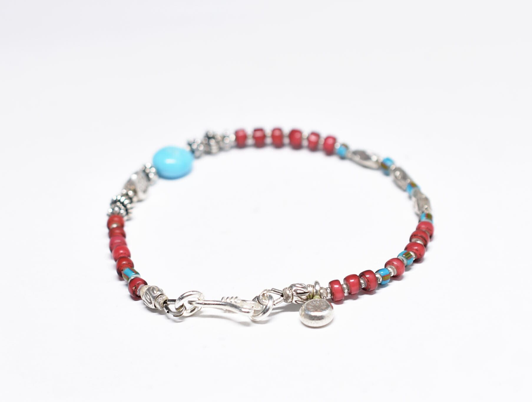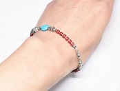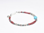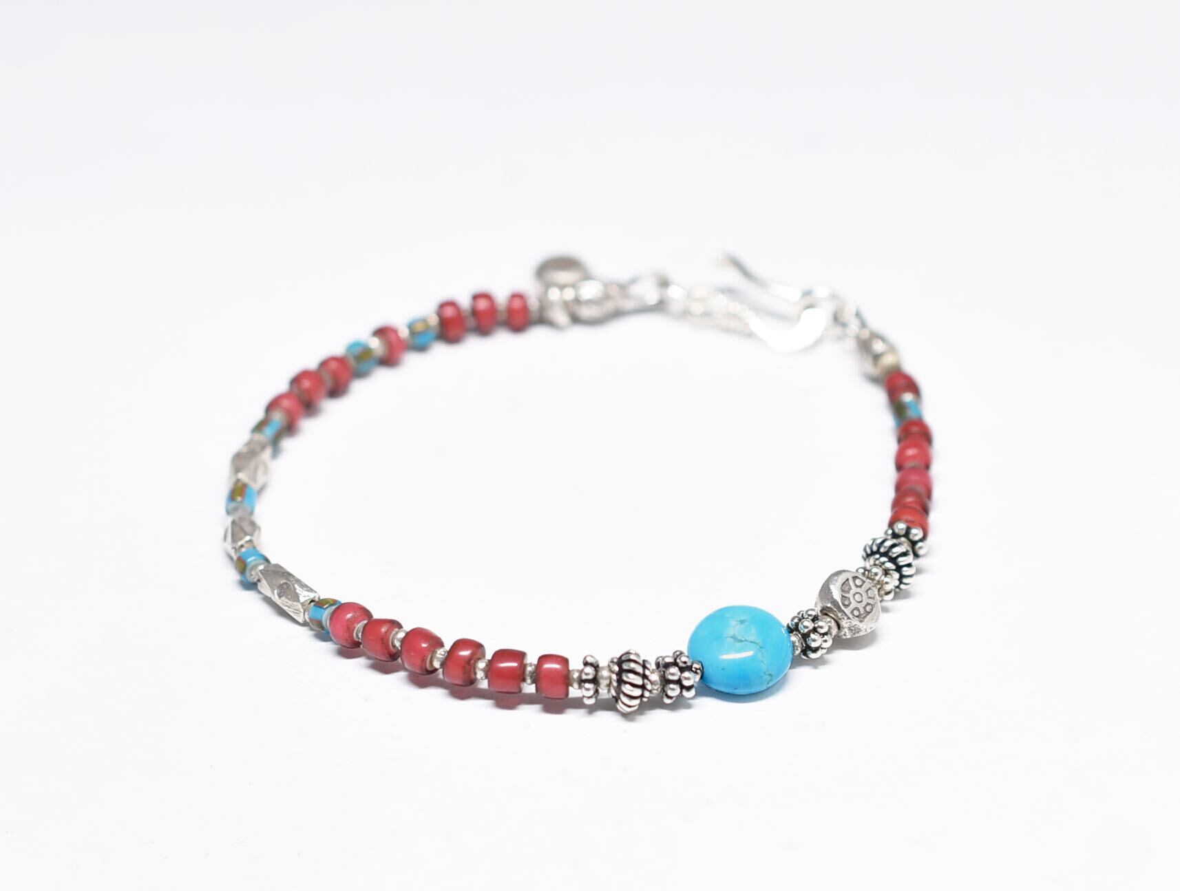 キングマンターコイズと金赤&ターコイズブルーホワイトハーツ、カレンシルバーを繋いだブレスです。