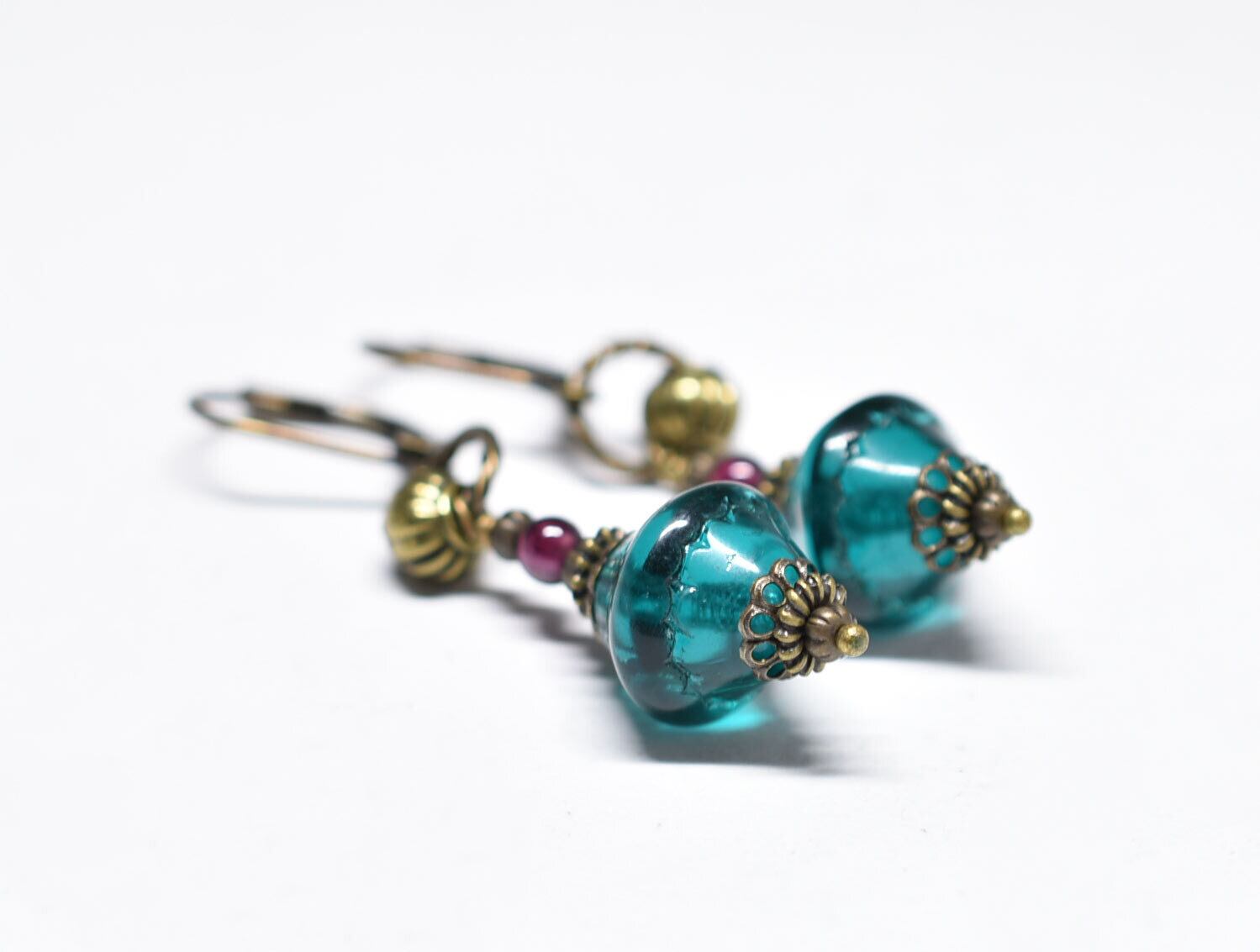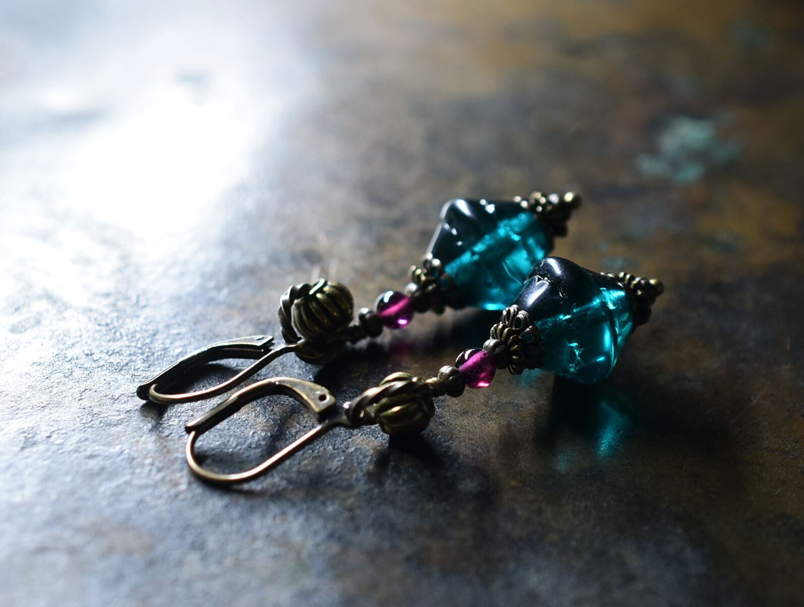 ブルーグリーンドイツヴィンテージビーズとガーネットのピアス