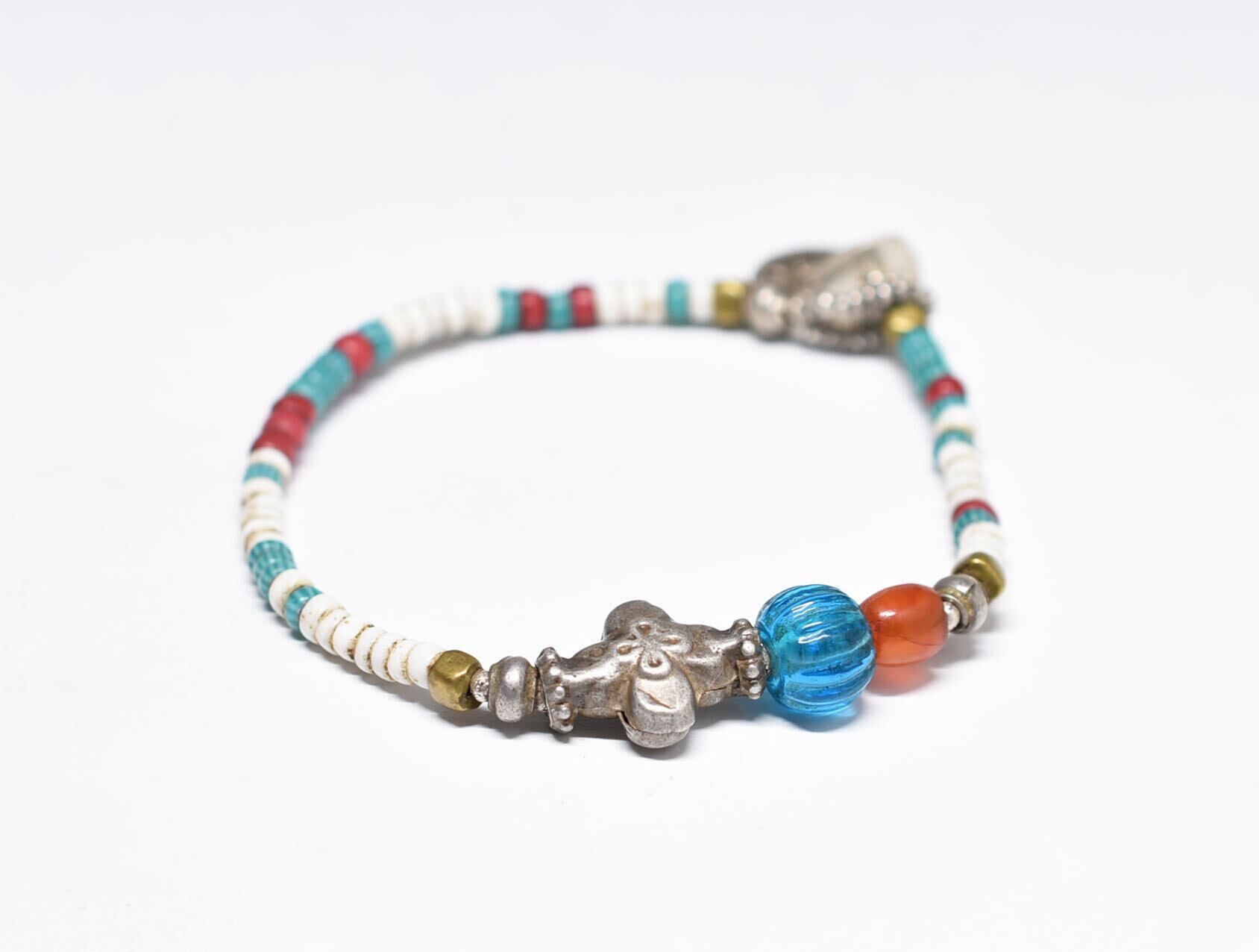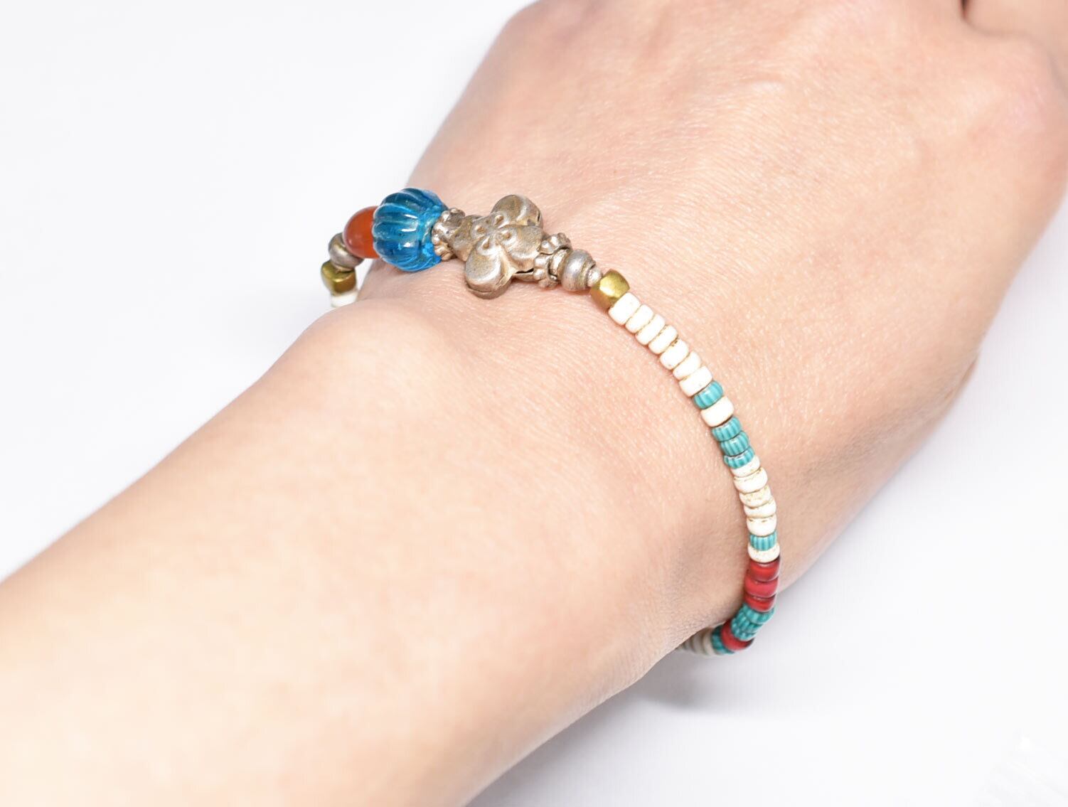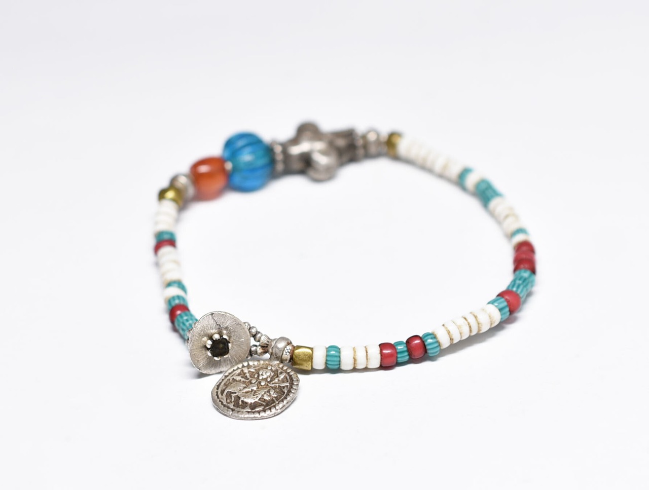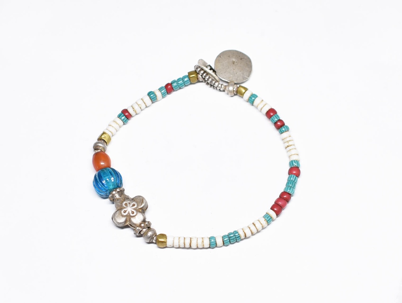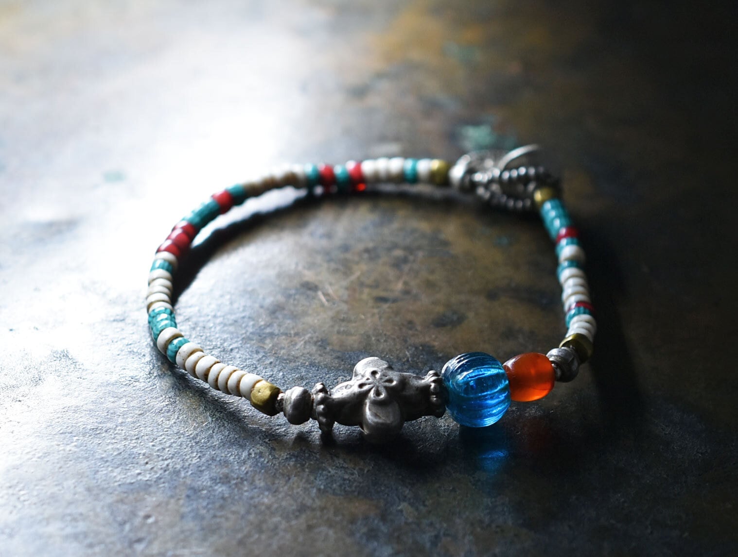 oldヒマーチャルシルバー、oldブルー蜜柑玉とミゾーラムカーネリアン、金赤ホワイトハーツ、ホワイトビーズ&ターコイズグリーンシェブロン、oldインドシルバーチャームなどを繋いだブレスです。
