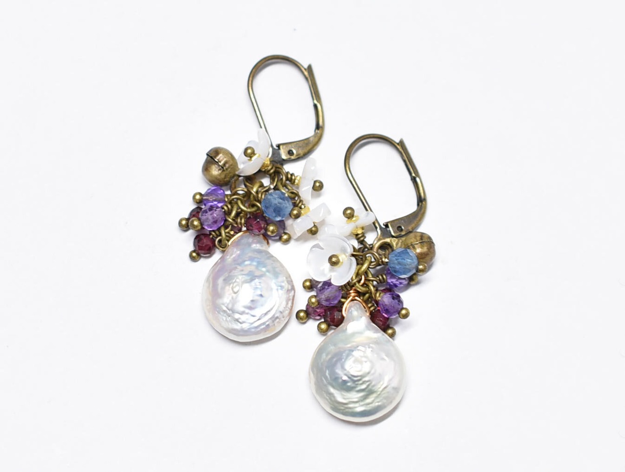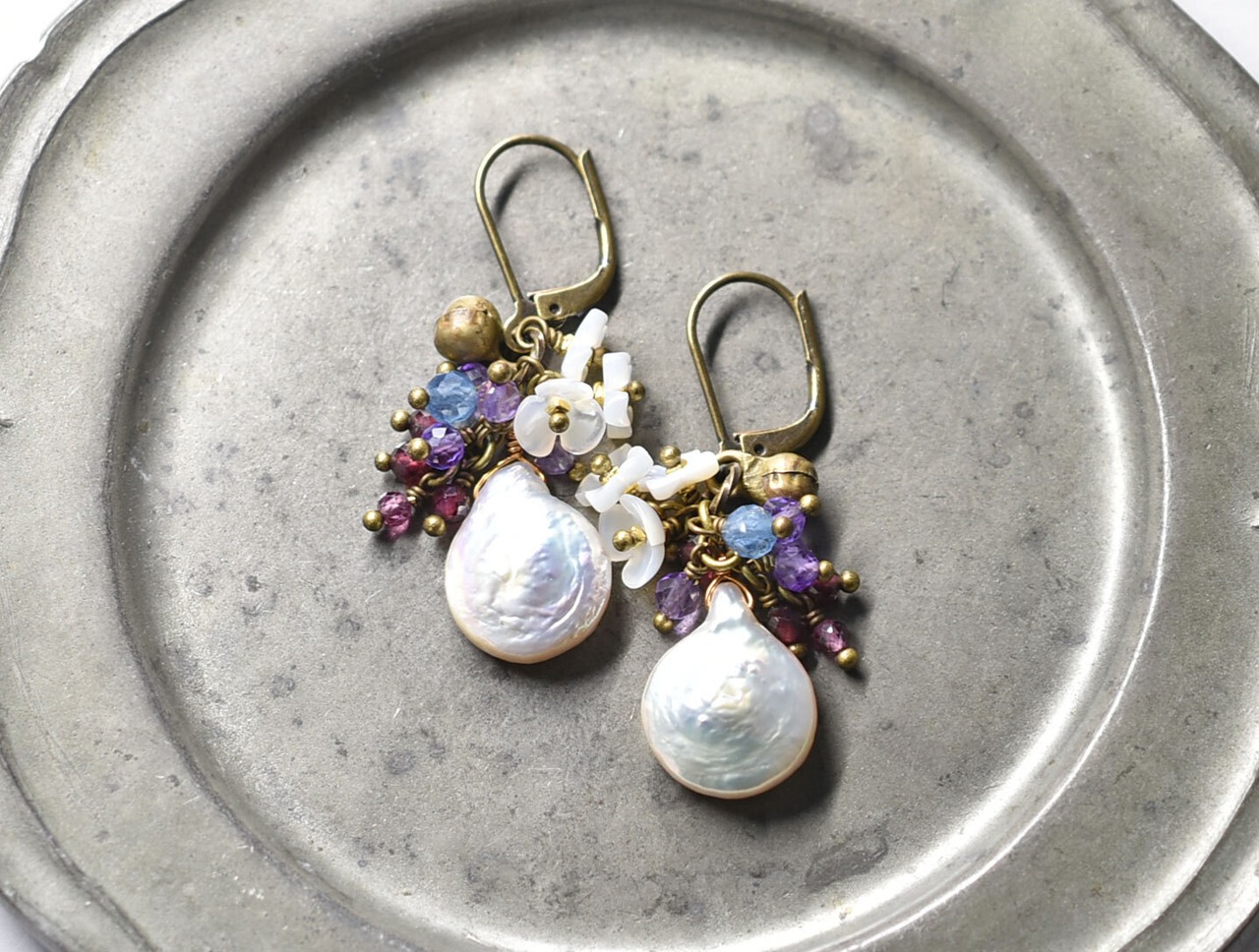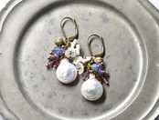 バロックパールとたわわなストーンビーズ、白蝶貝の小花、民族鈴を繋いだピアスです。