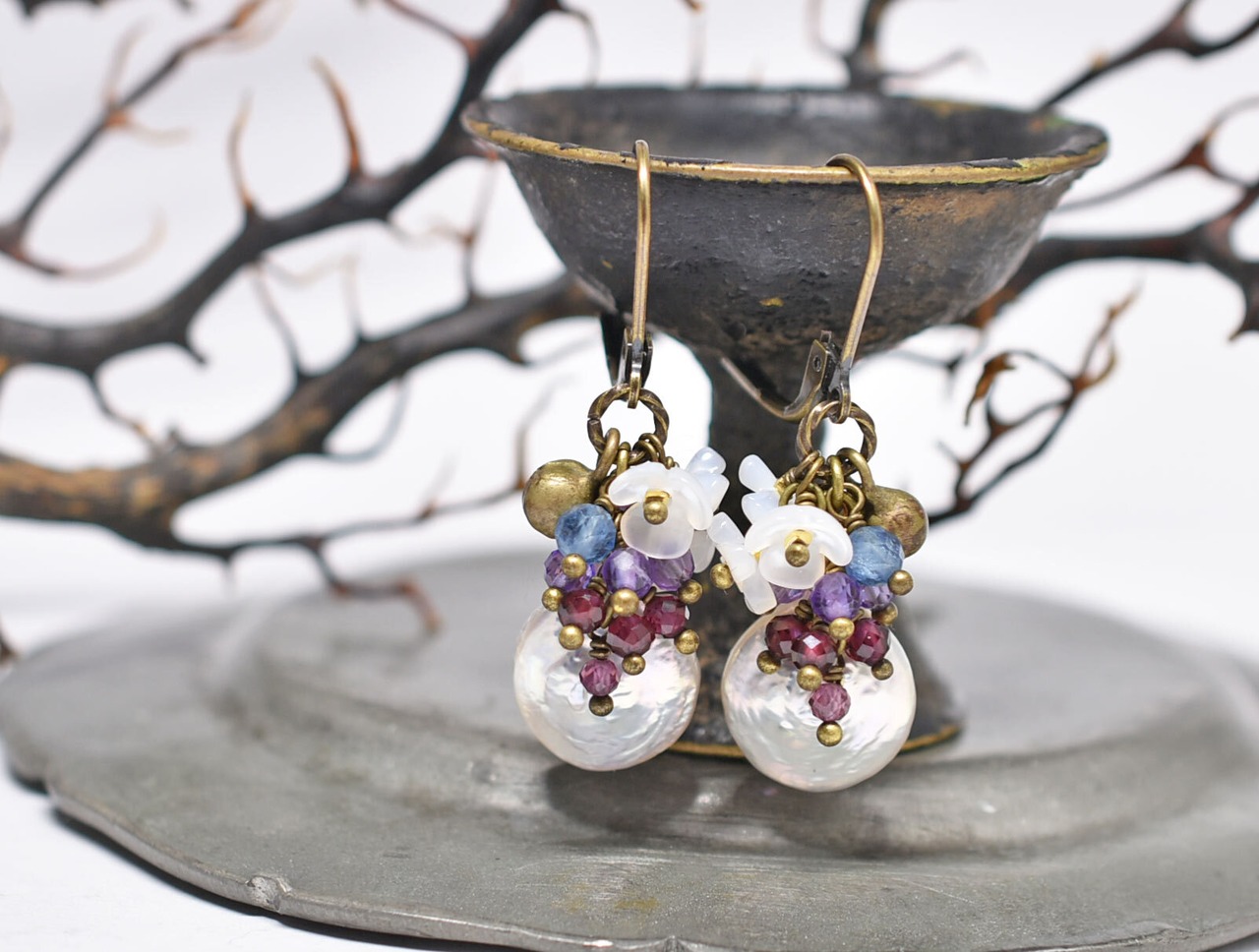 バロックパールとたわわなストーンビーズ、白蝶貝の小花、民族鈴のピアス