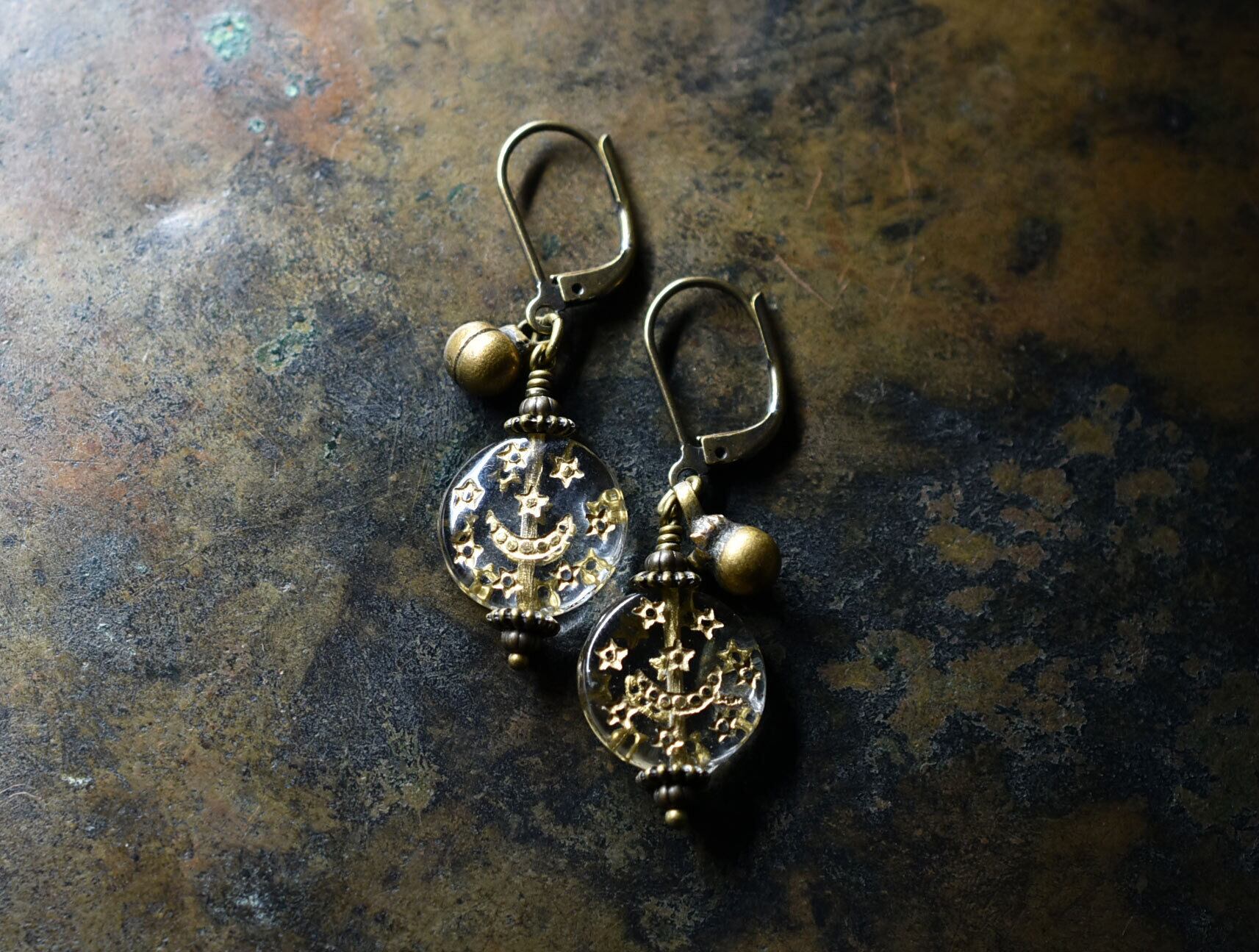 月と星の模様が施された聖者のビーズと、小さな鈴を繋いだピアスです。