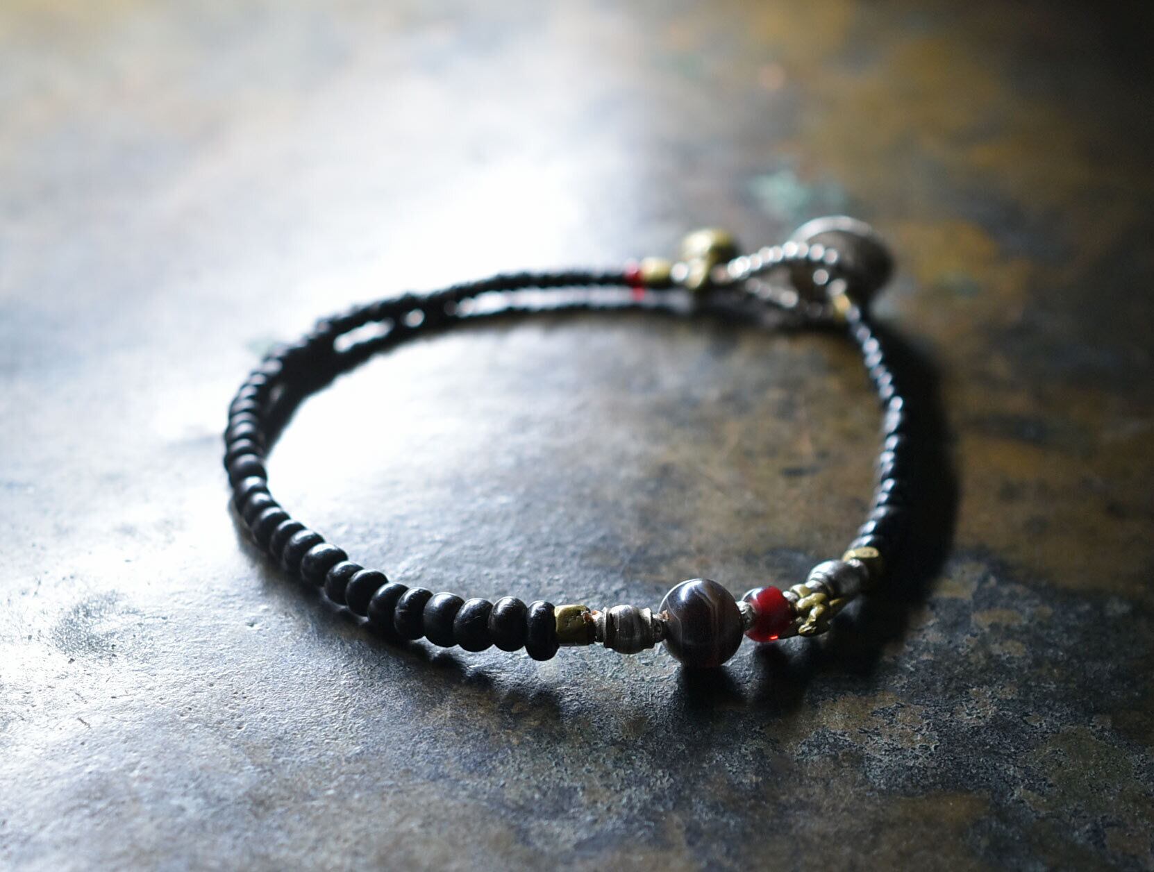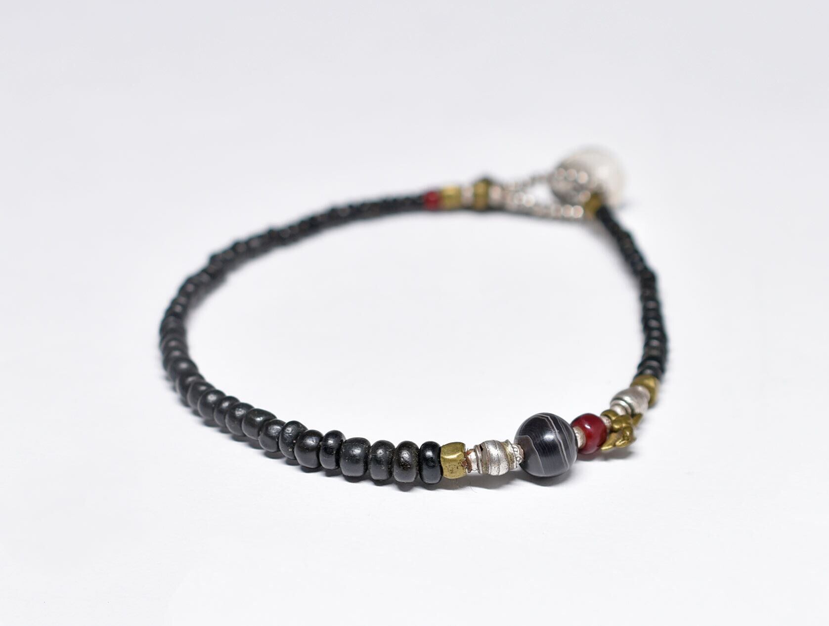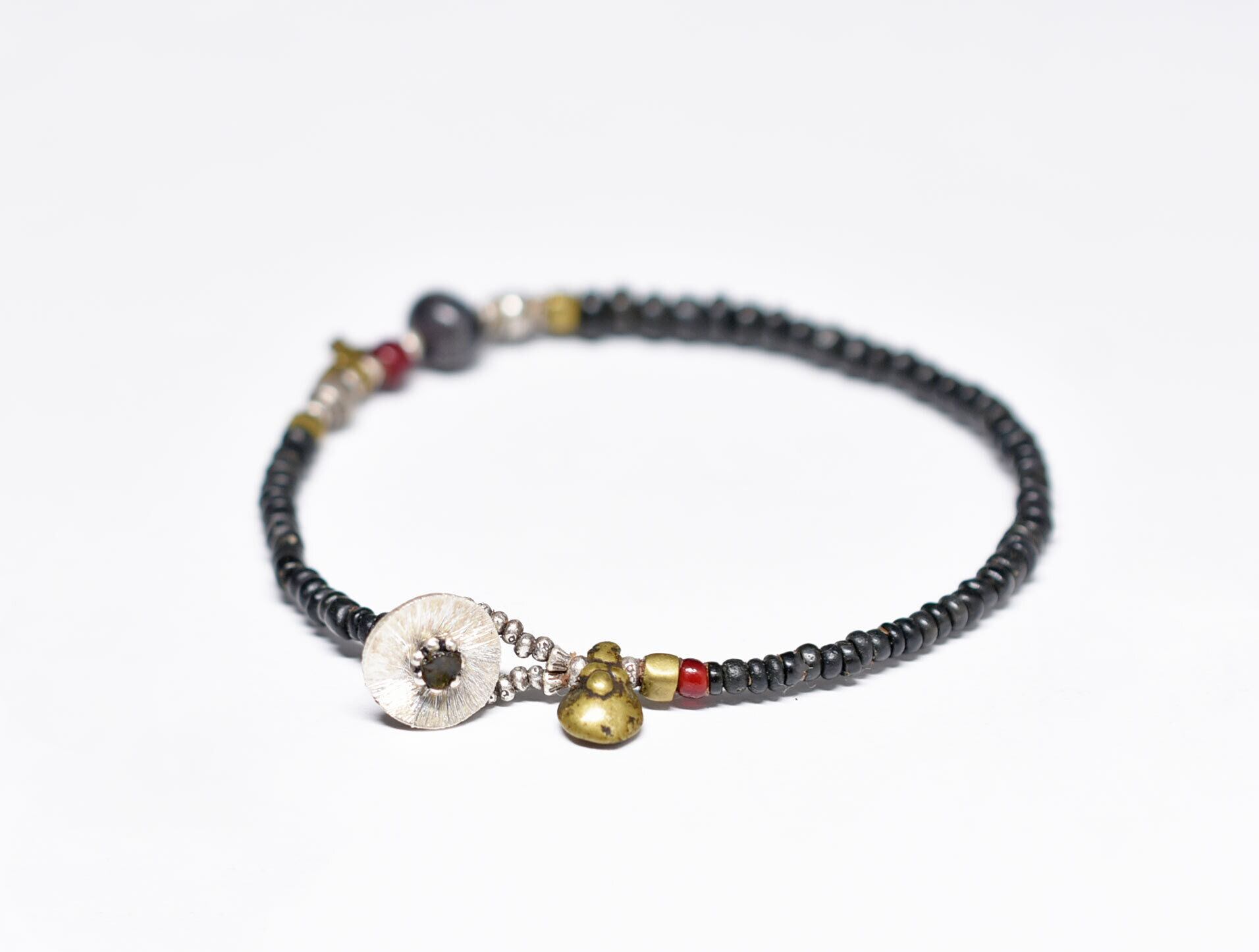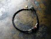 古代瑪瑙と血赤ホワイトハーツ、oldチンシルバー&oldオリッサブラス、漆黒ビーズのブレス