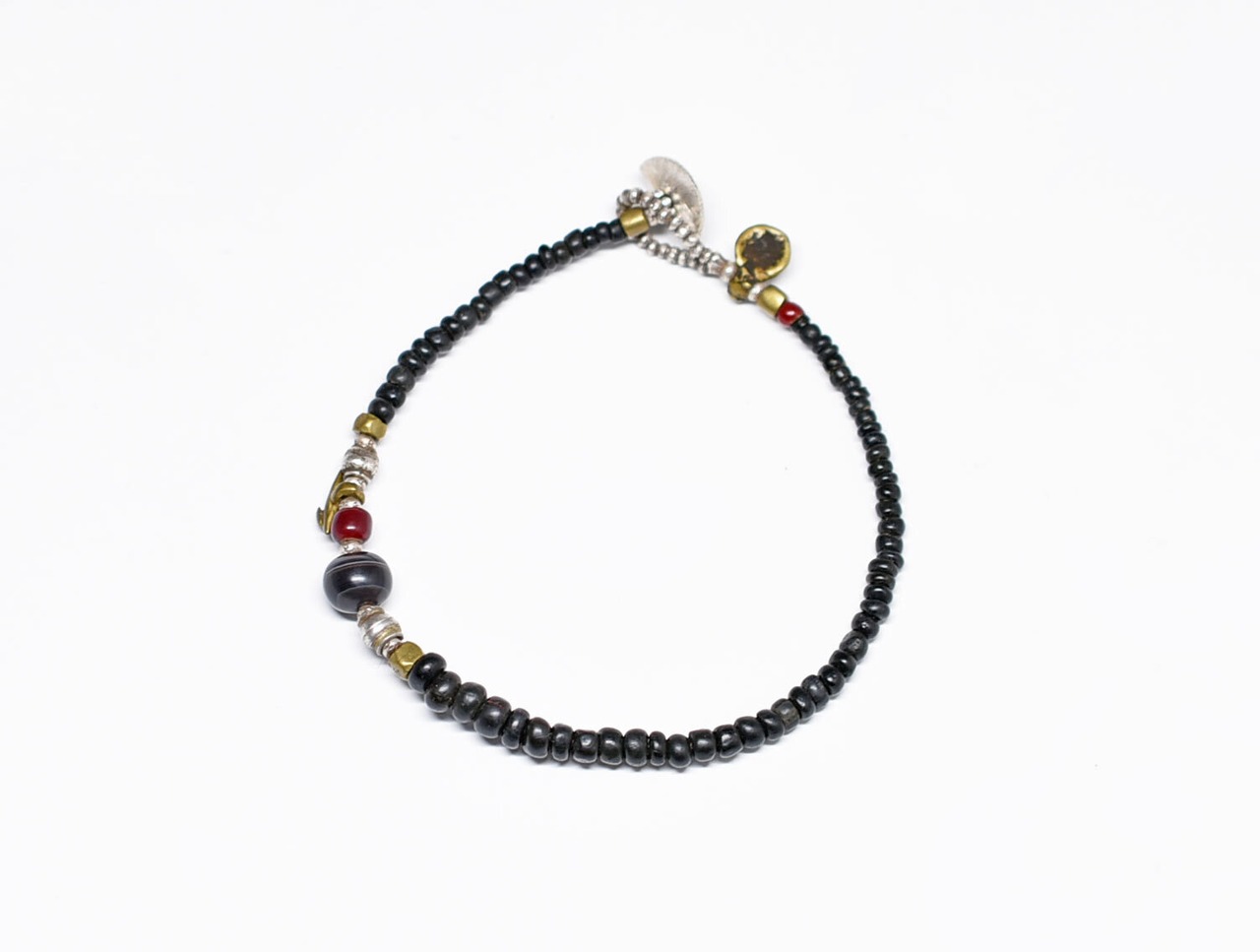 素材:古代瑪瑙、ガラス、oldチンシルバー、oldオリッサブラス、カレンシルバー、ロウビキ紐