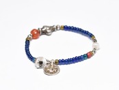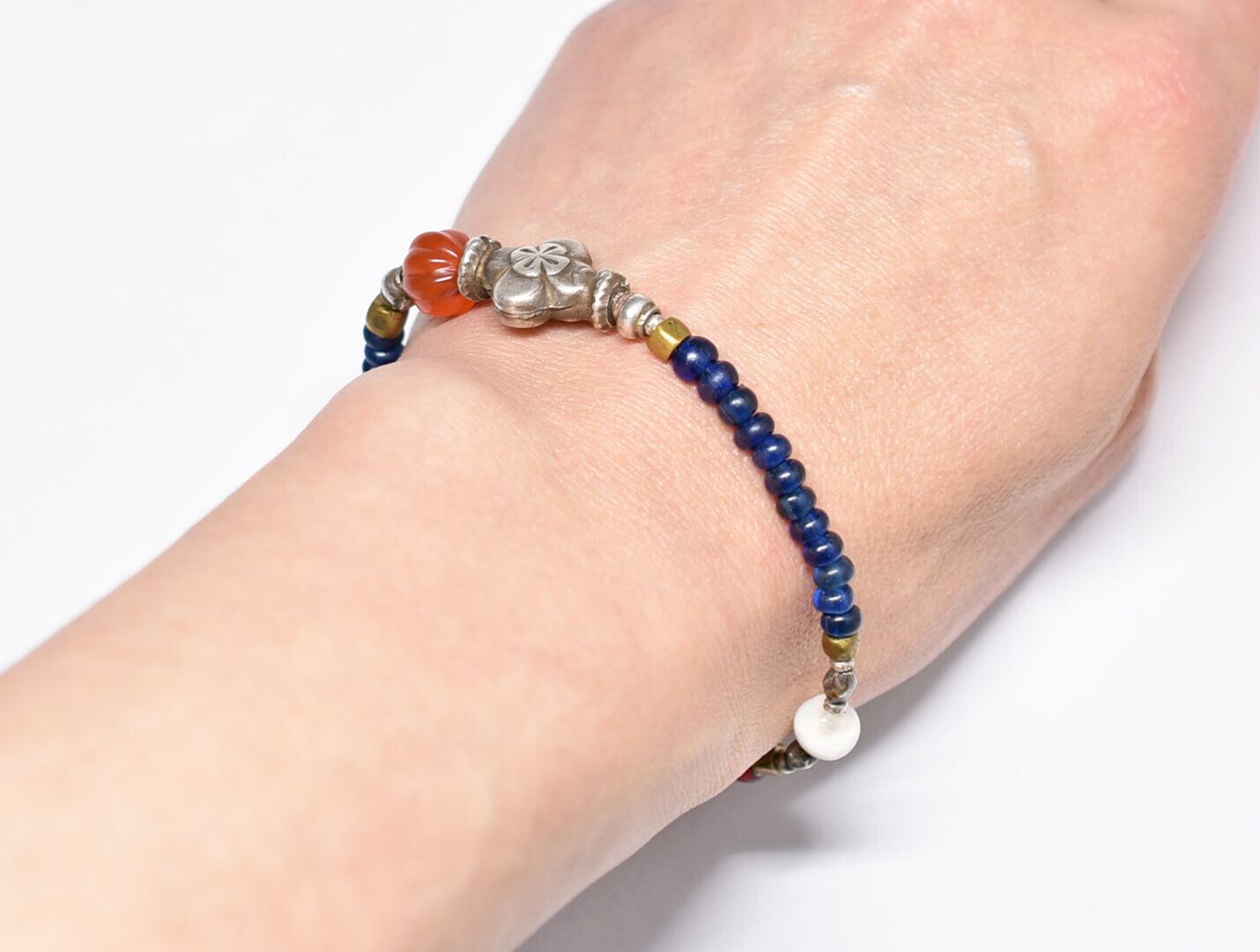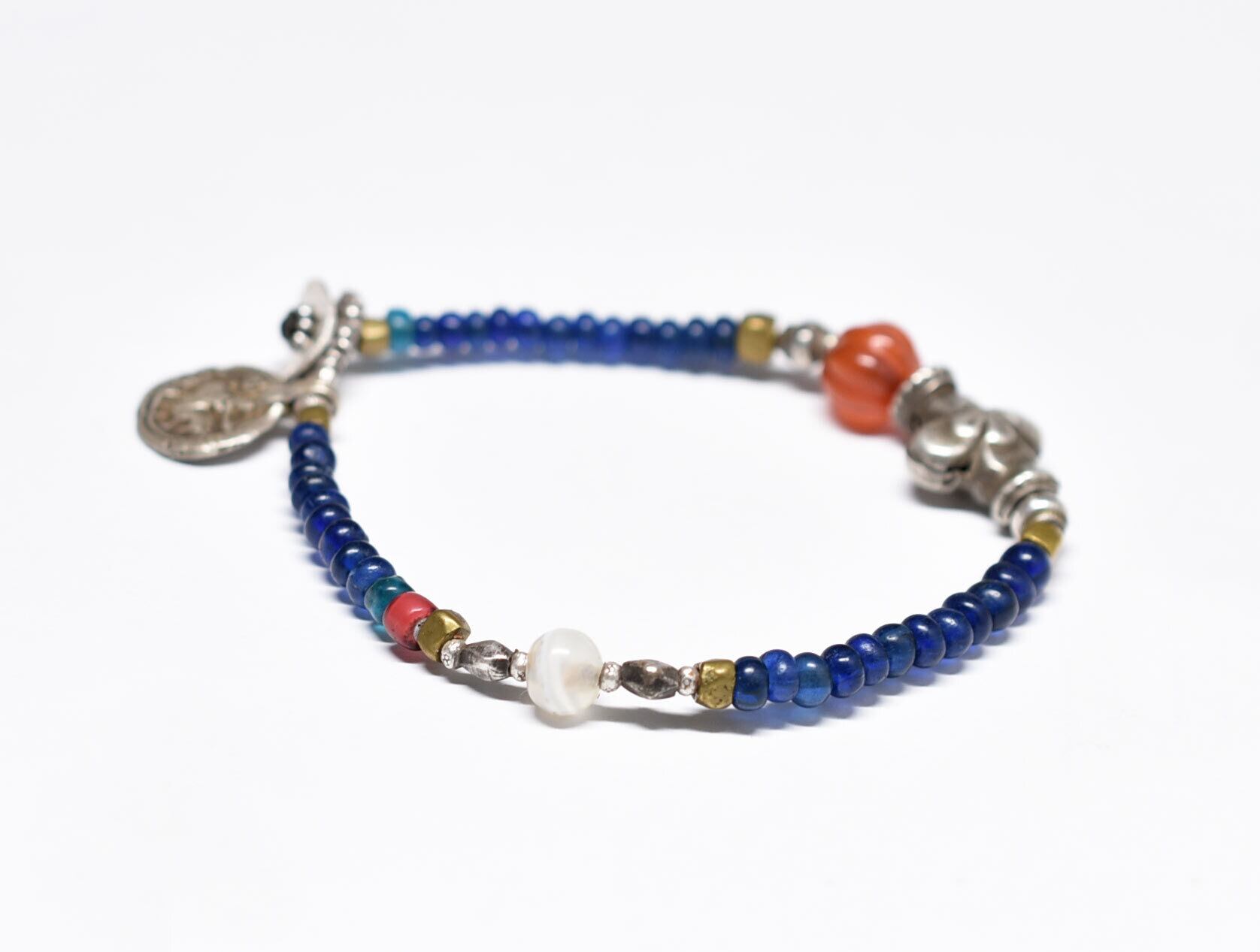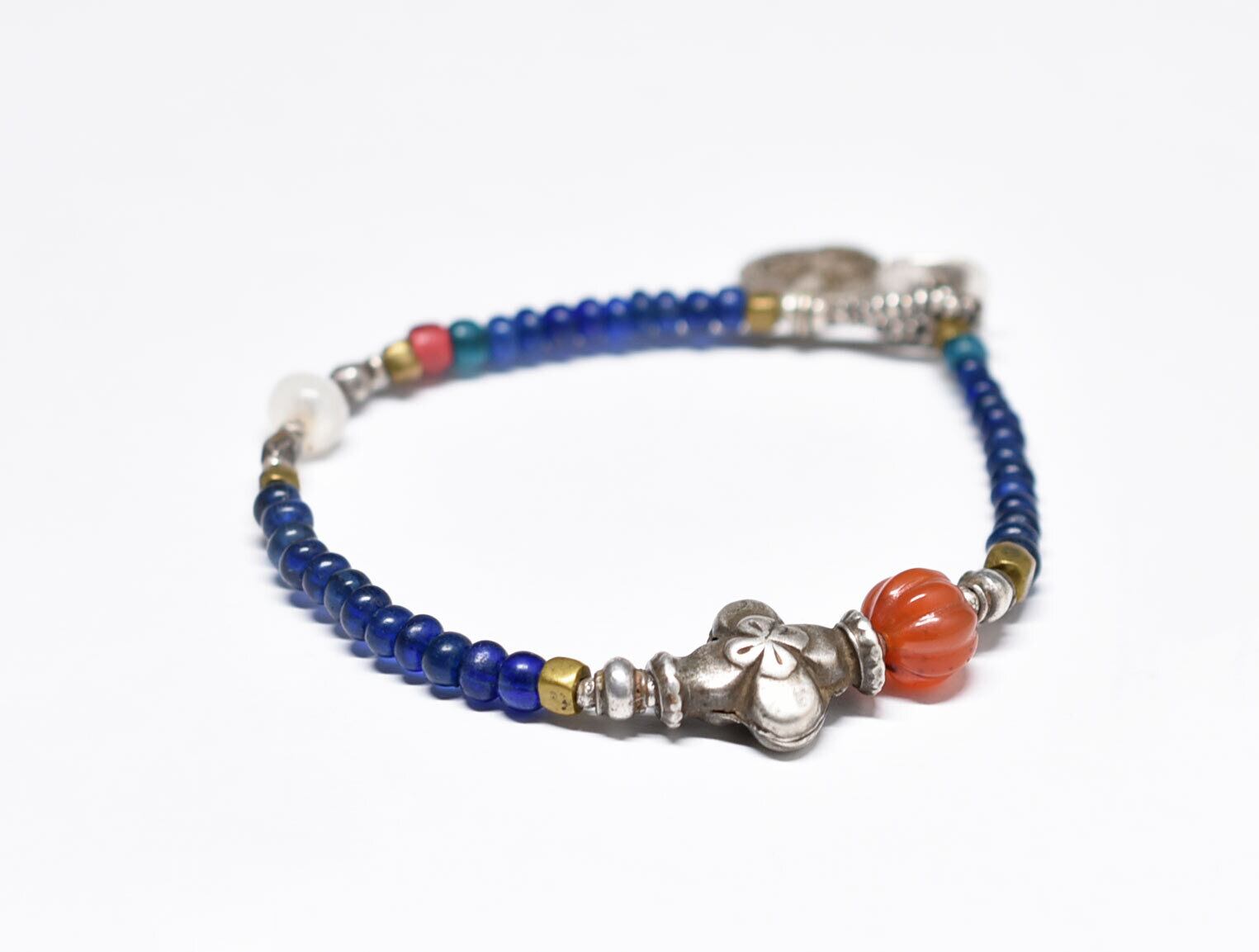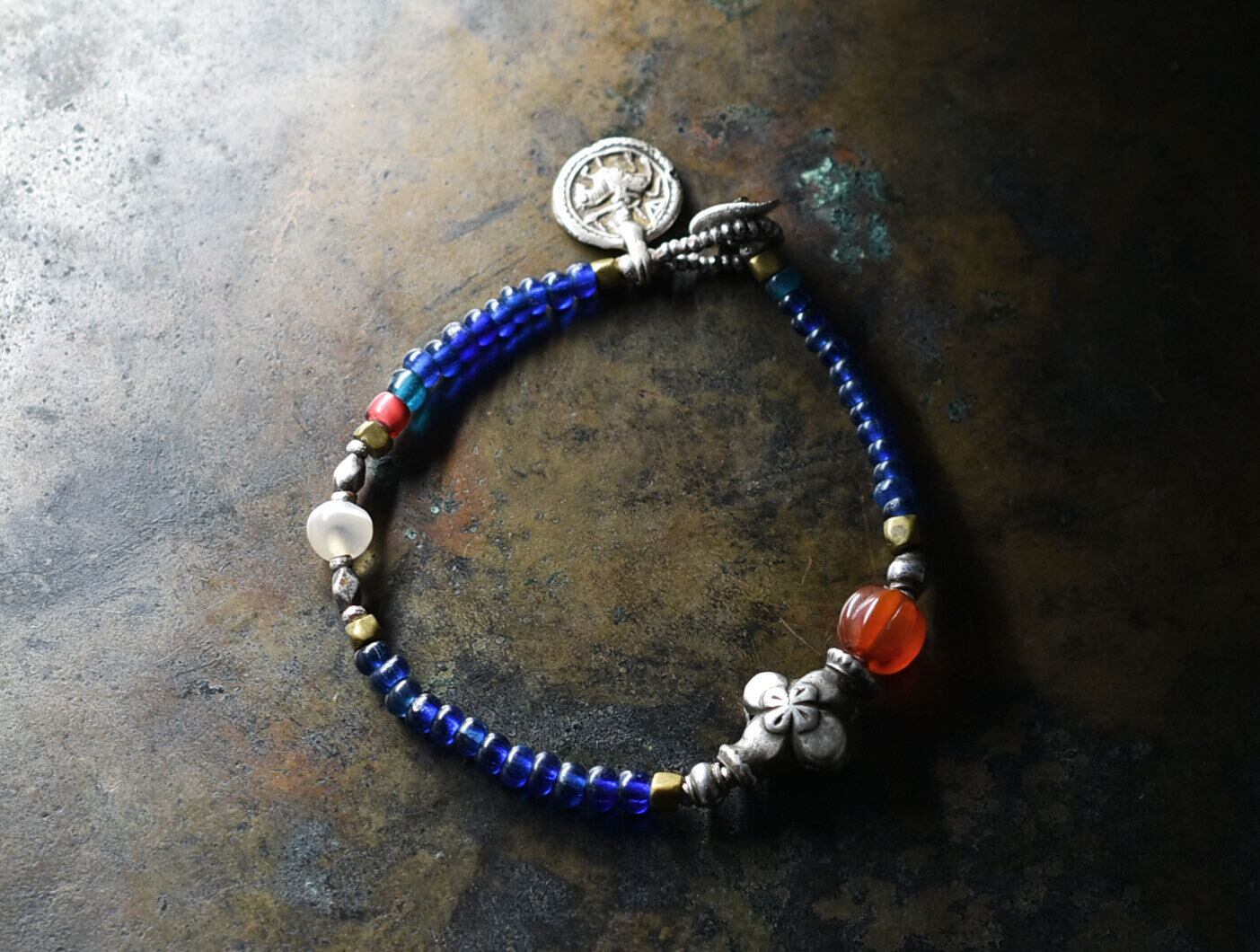 oldヒマーチャルシルバーとヴィンテージ蜜柑玉カーネリアン、古代瑪瑙、oldオリッサブラス&チンシルバー、ブルーブルービーズ、oldインドシルバーチャームなどを繋いだブレスです