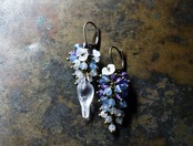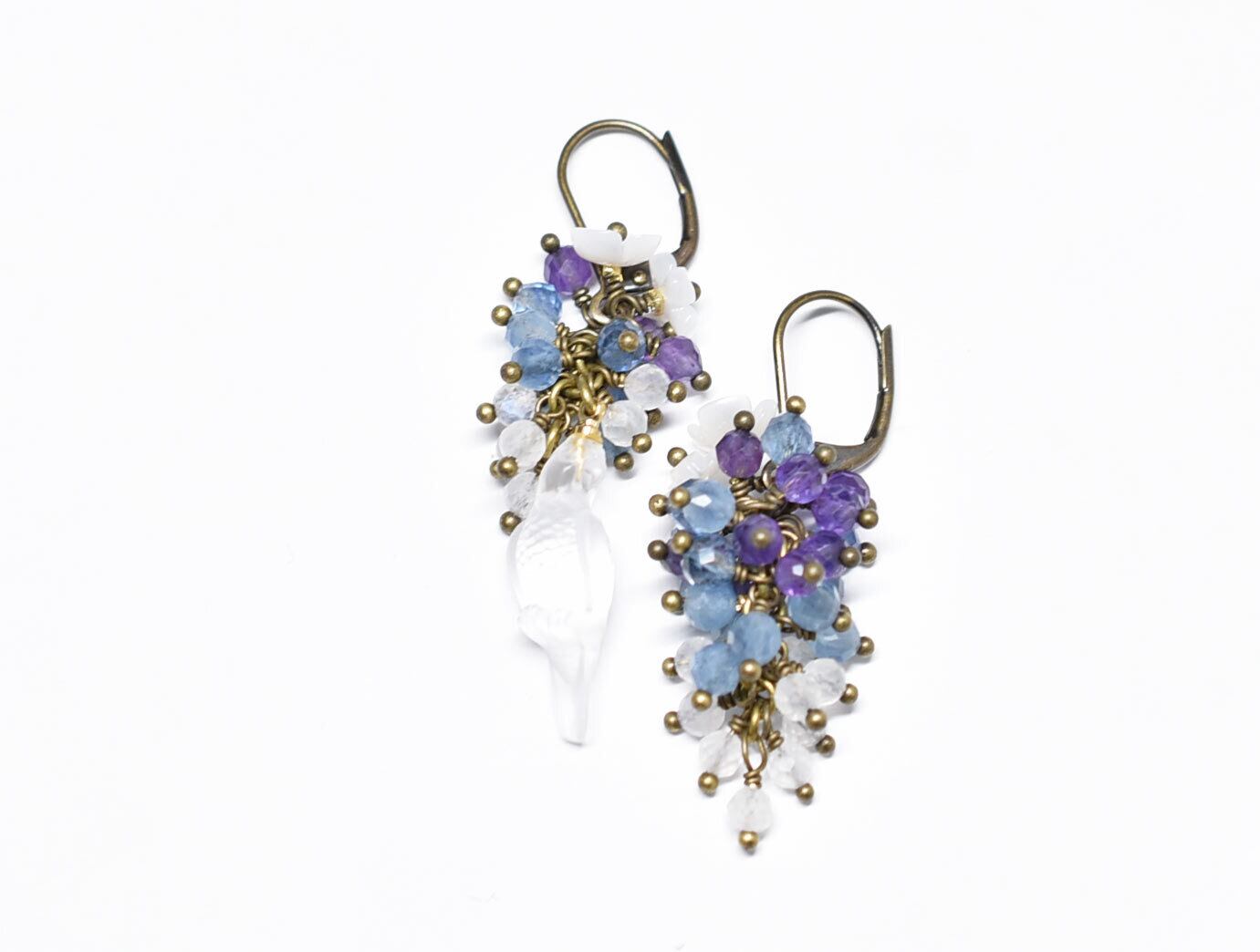 オーストリアヴィンテージ鳥ビーズとたわわなストーン、白蝶貝の小花のアンシメトリーピアス