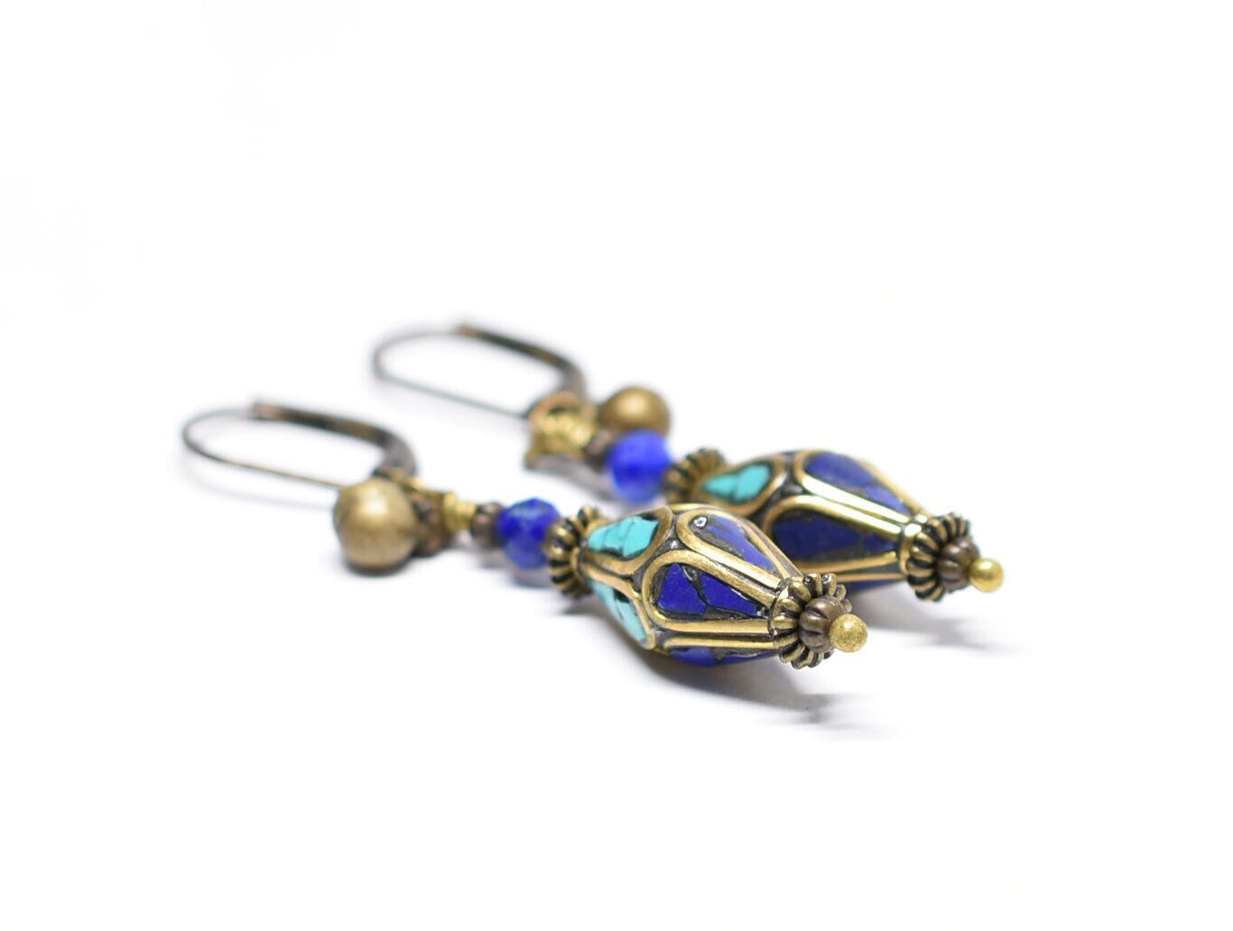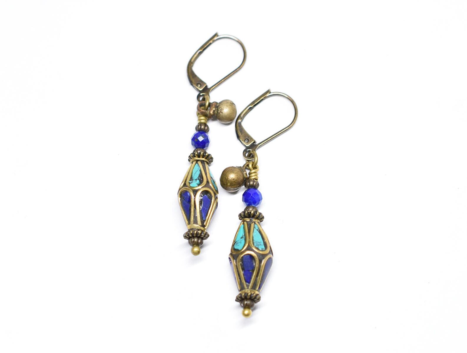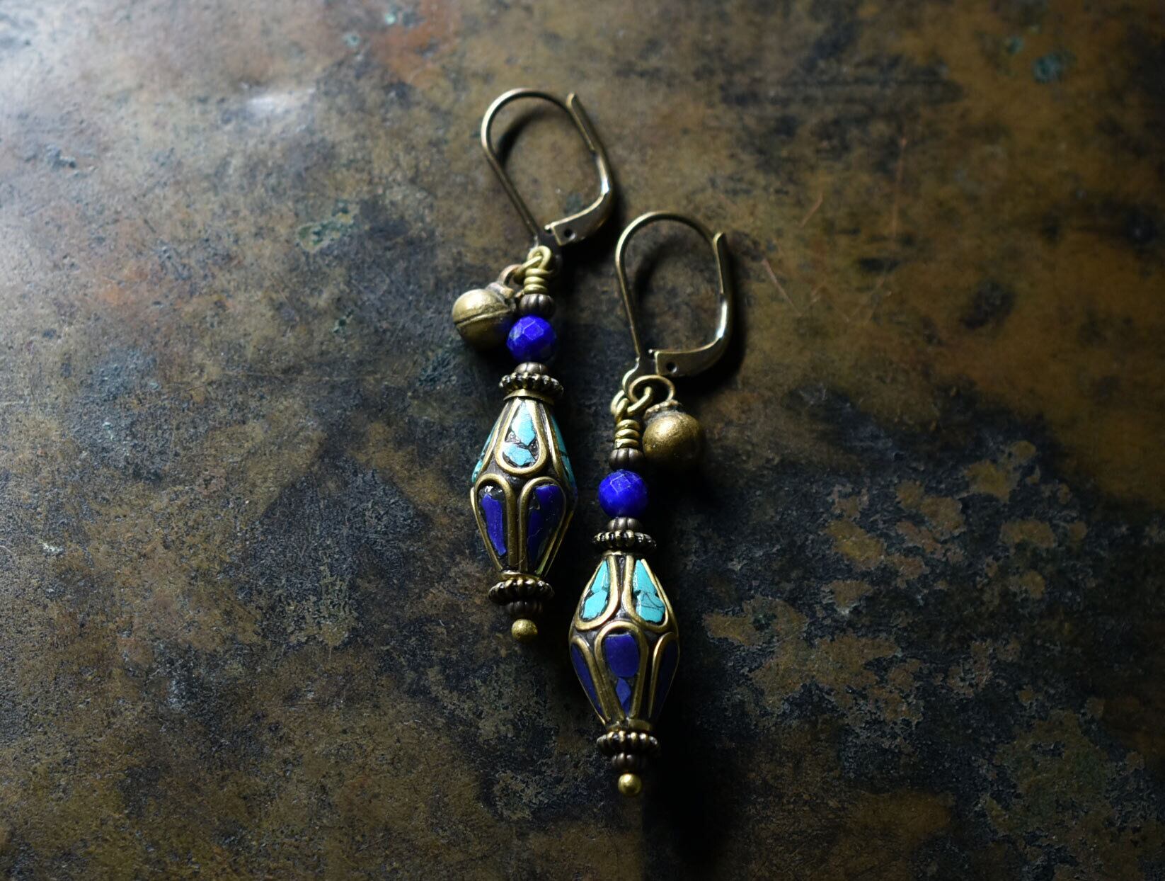 ラピス&ターコイズ象嵌ビーズとラピス、民族鈴を繋いだピアスです。