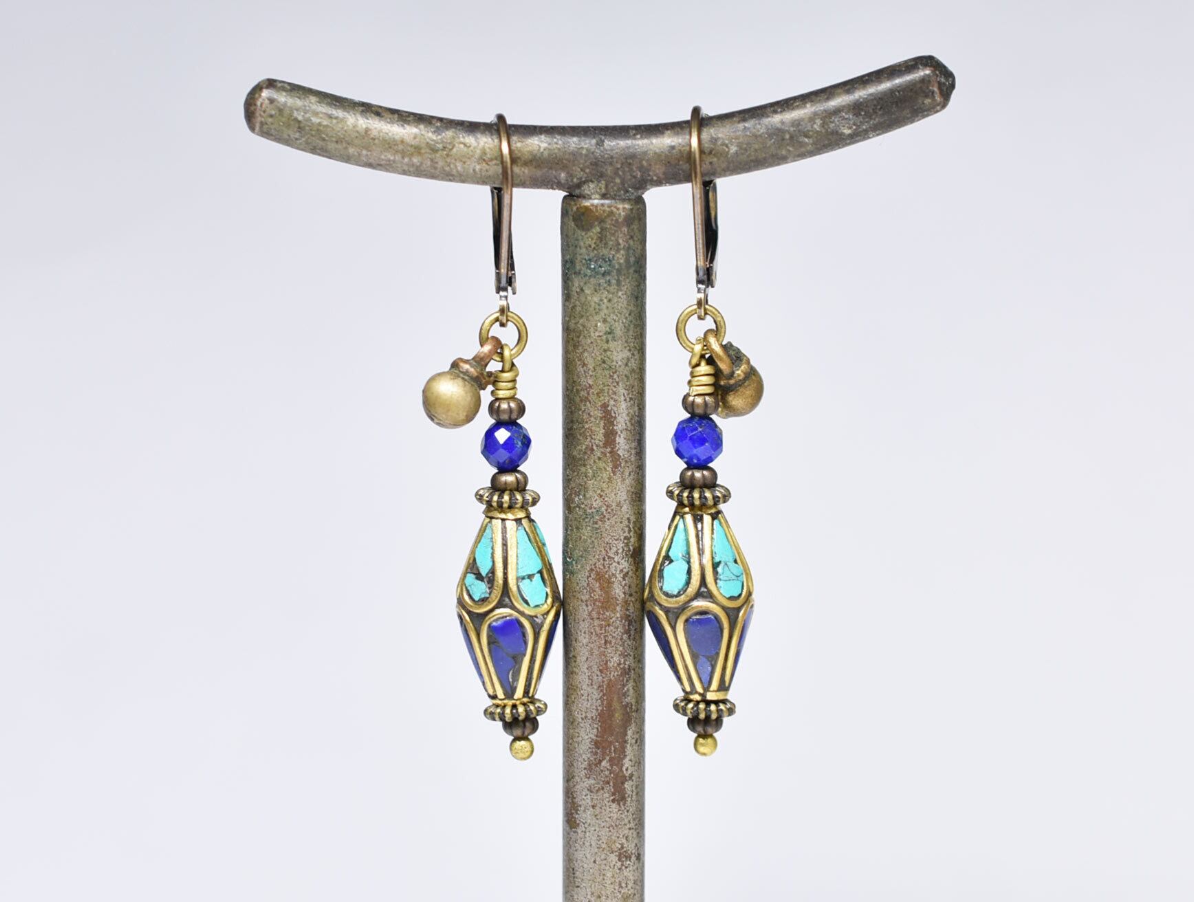 ラピス&ターコイズ象嵌ビーズとラピス、民族鈴のピアス