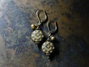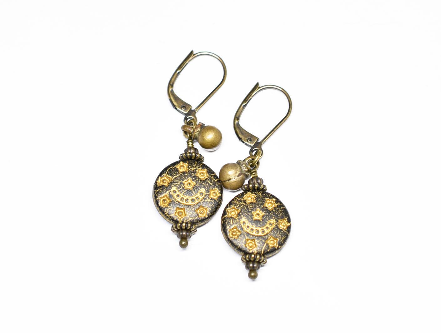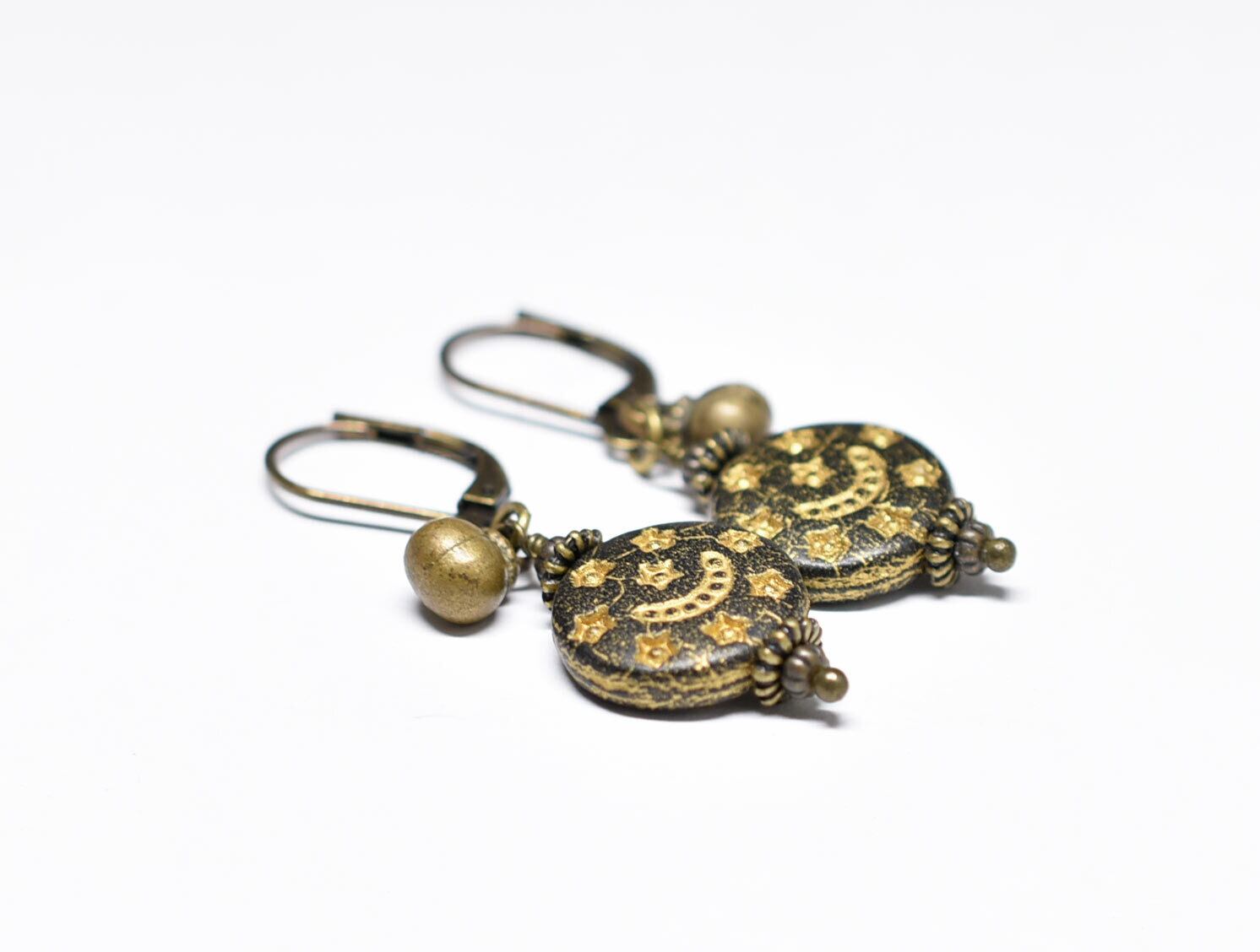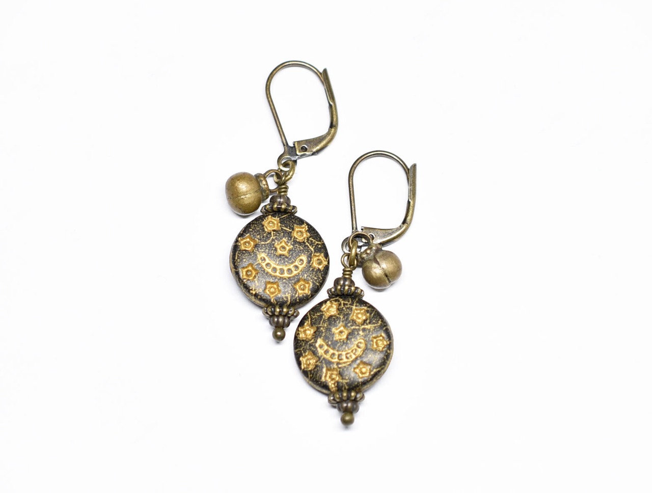 月と星の模様が施された聖者のビーズと、小さな鈴を繋いだピアスです。