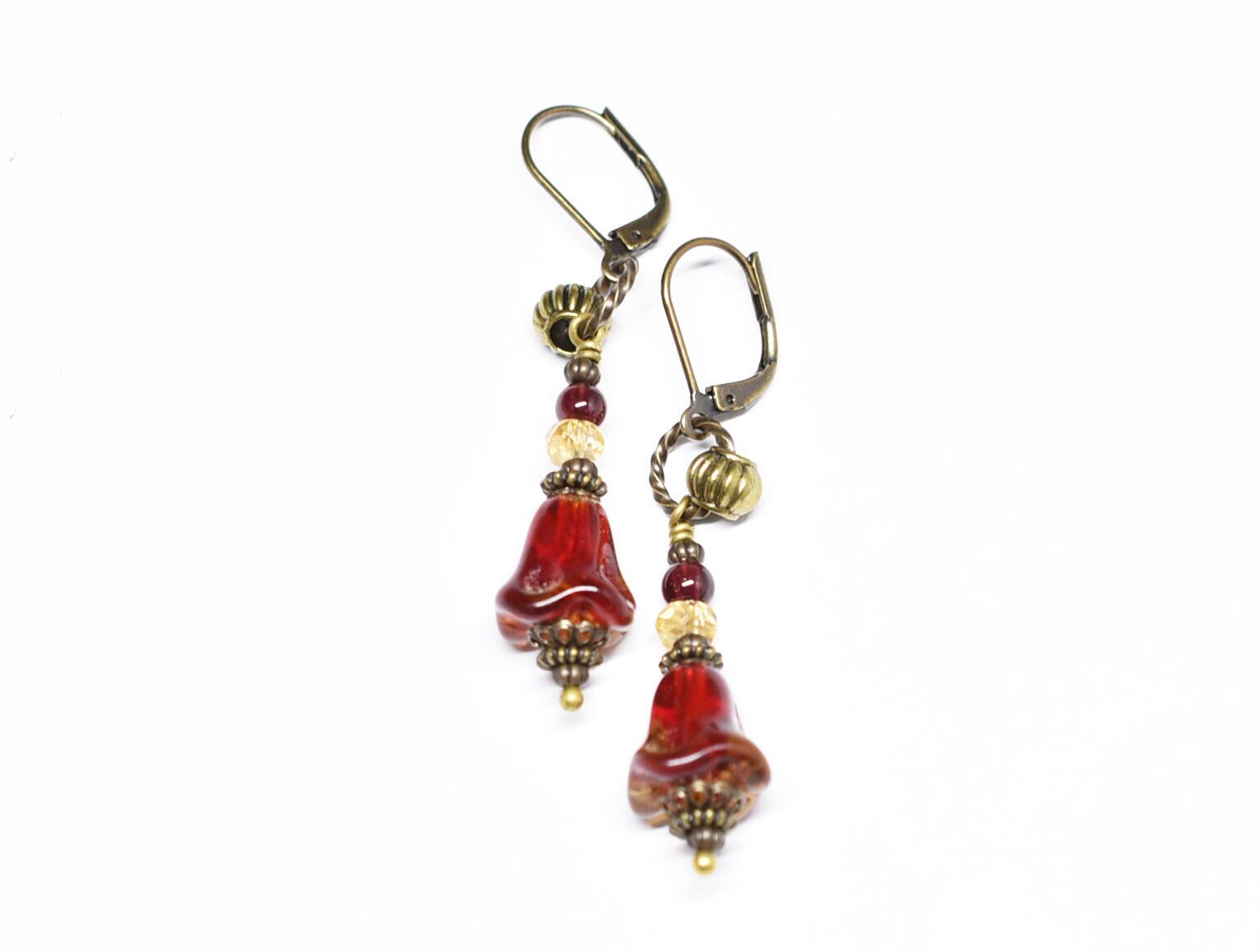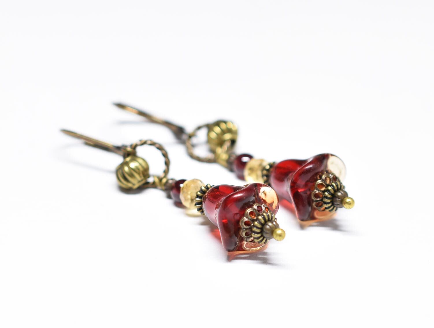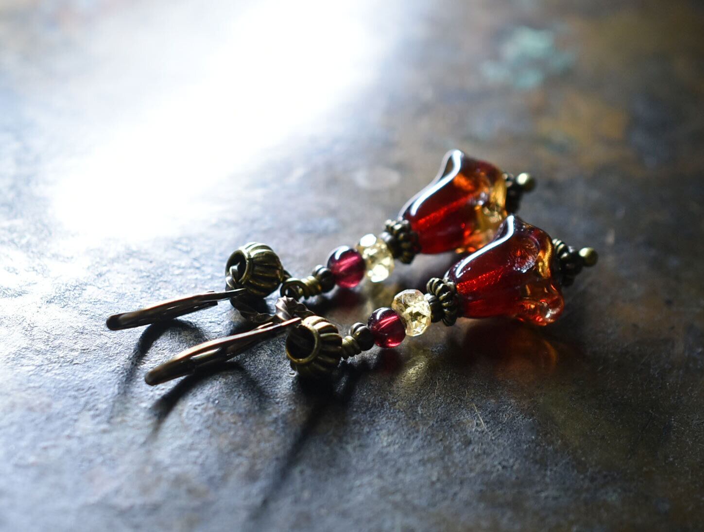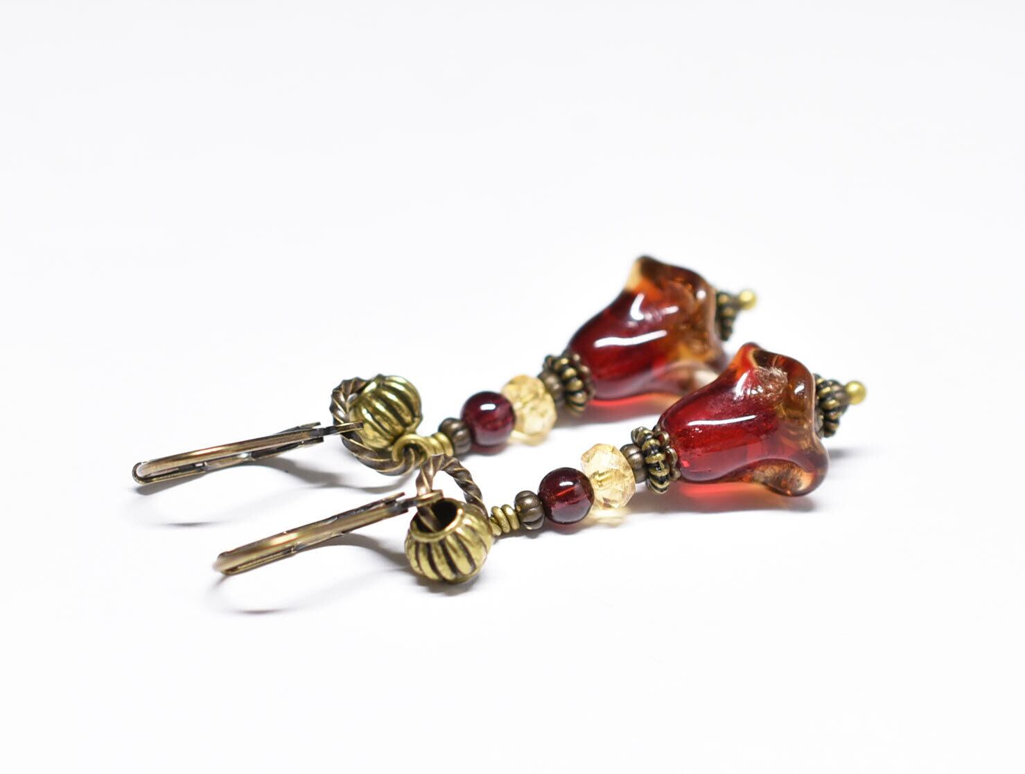 エンジェルトランペットの様なドイツヴィンテージビーズとシトリン&ガーネットのピアス(琥珀×レッド)