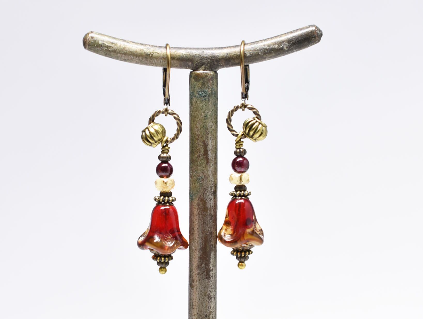 エンジェルトランペットの様なドイツヴィンテージビーズとシトリン&ガーネットなどを繋いだピアスです。