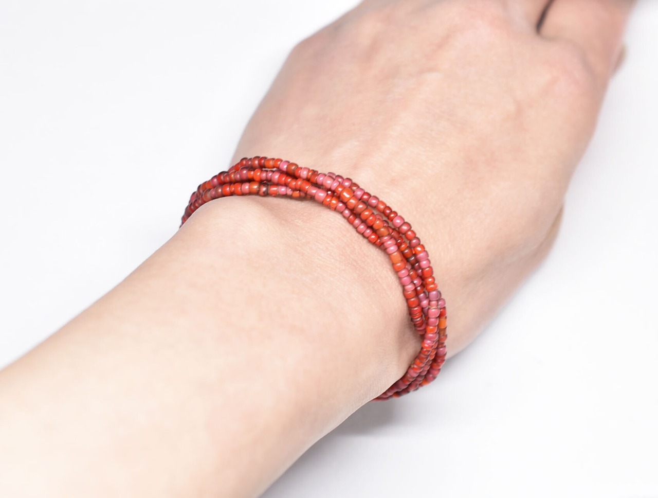 様々な赤色のビーズはホワイトハーツと呼ばれるアンティークビーズです。芯(ハート)部分が白いことからこう呼ばれています。こちらは19~20世紀頃のヴェネチア産のビーズです。特にピンク色の様な渋い赤色は金で赤色を発色させているため、このようなお色をしています、