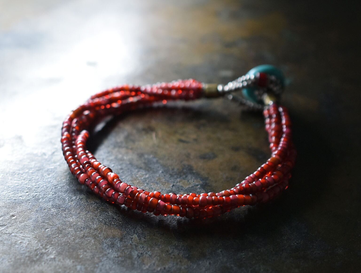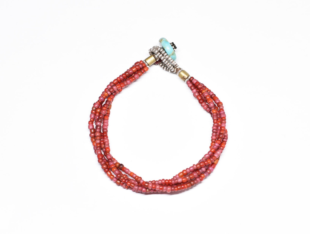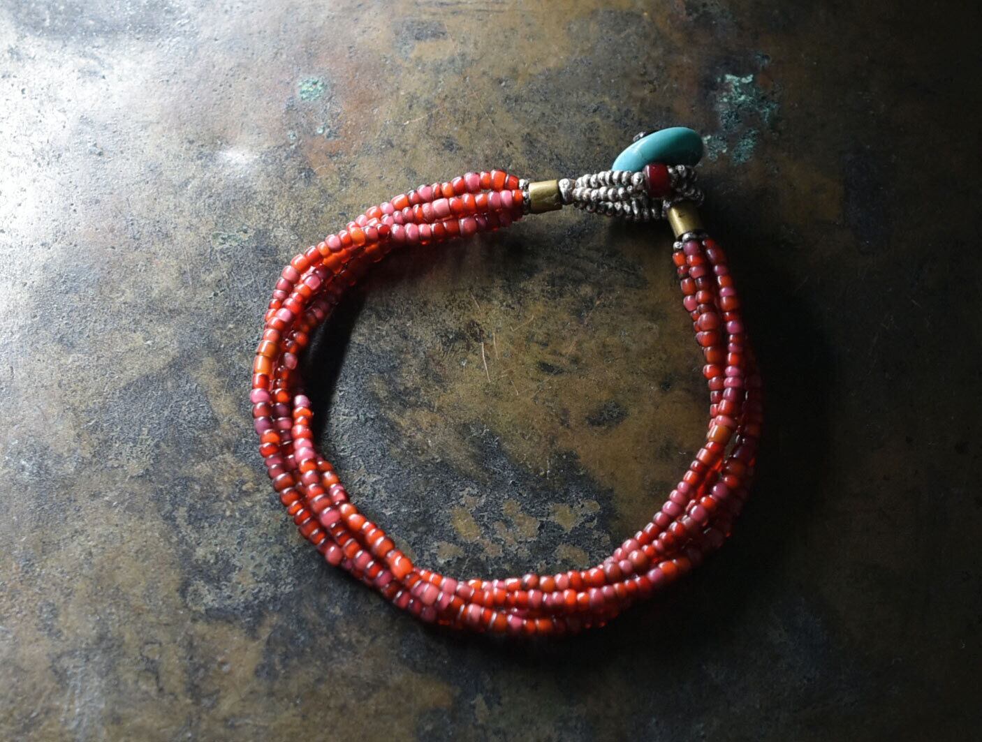 アンティーク金赤mixホワイトハーツの4連ブレス(ターコイズ留め金)
