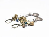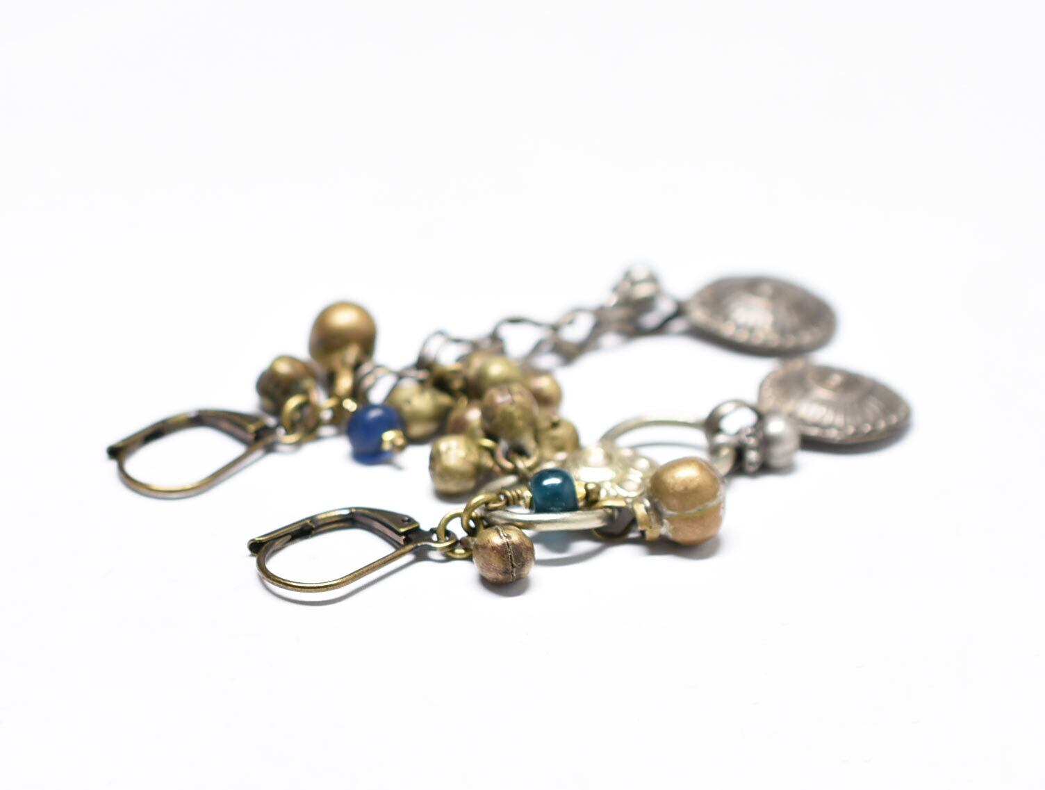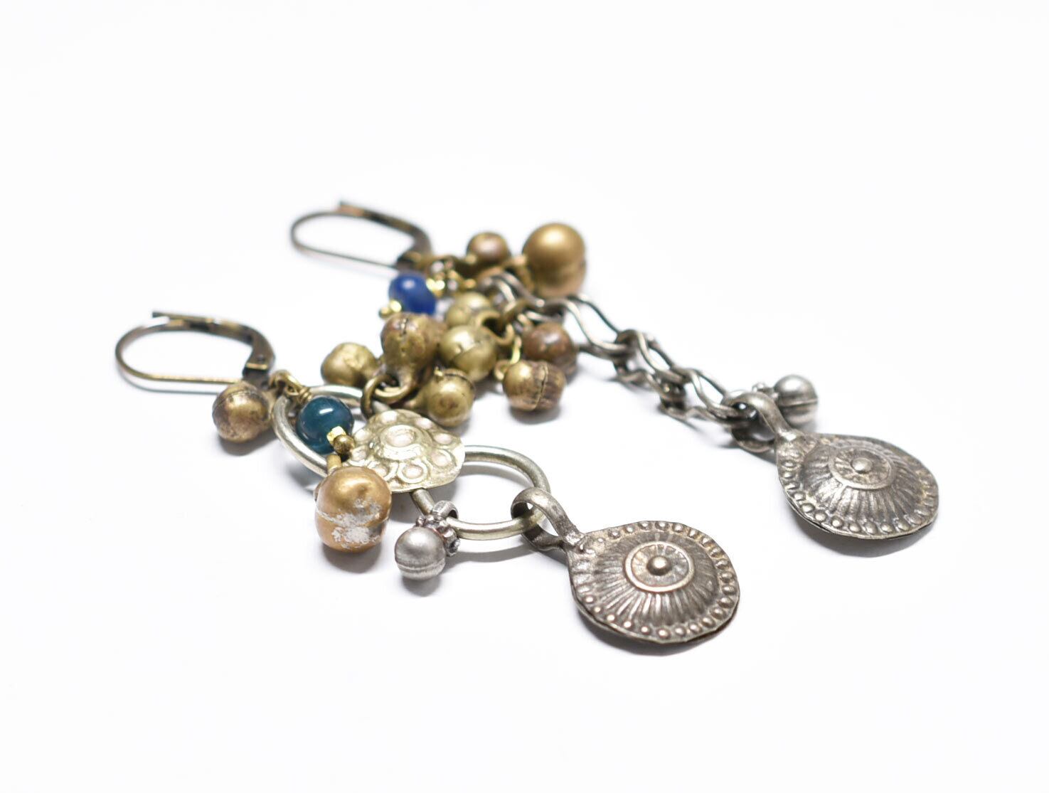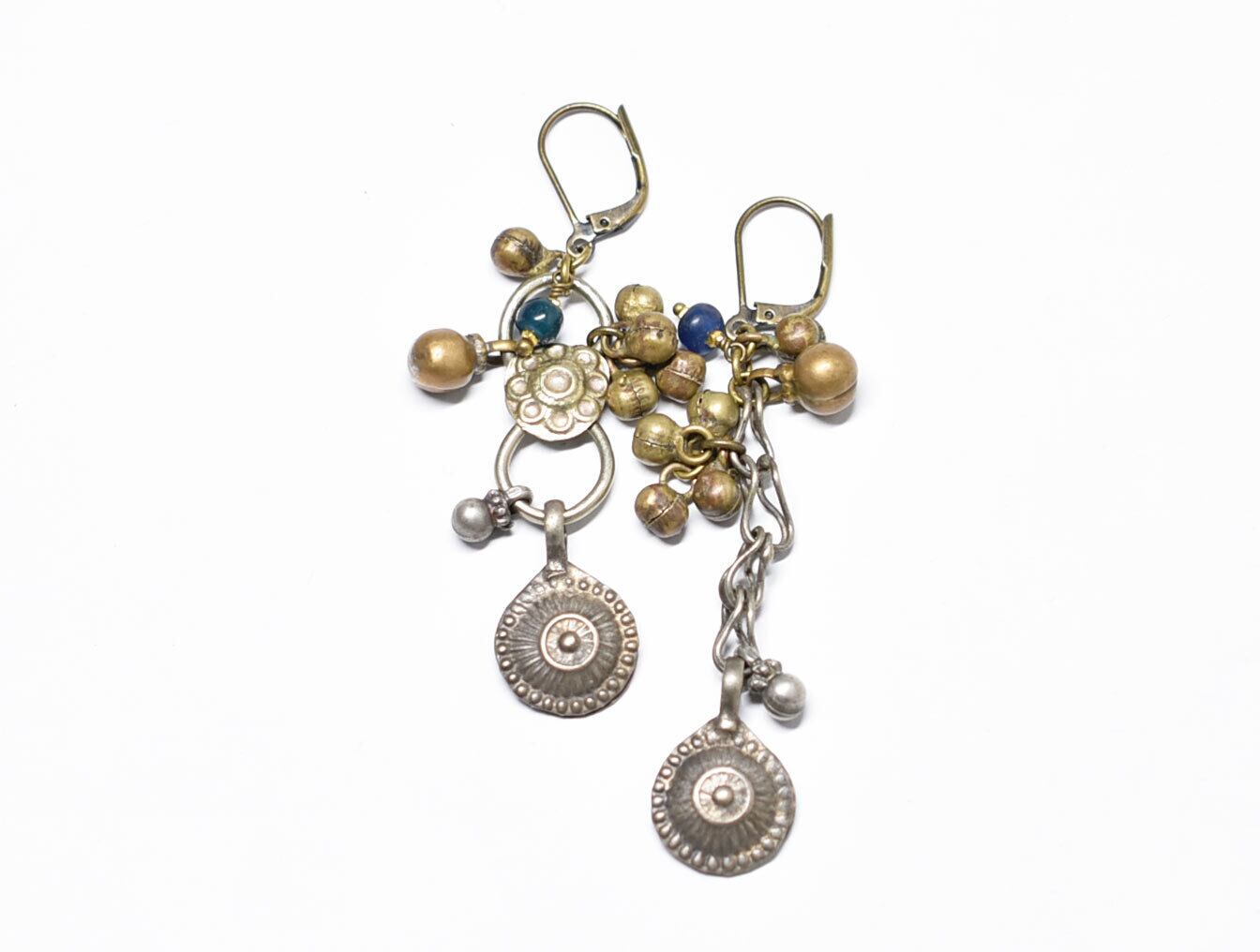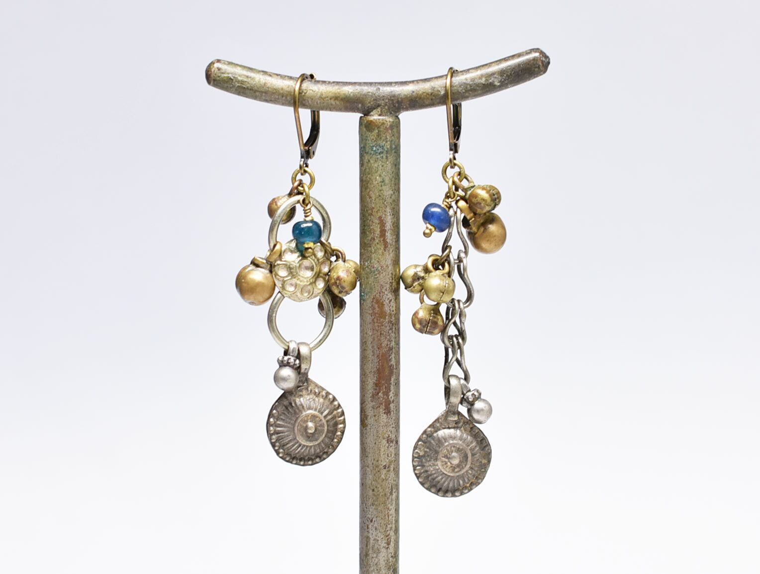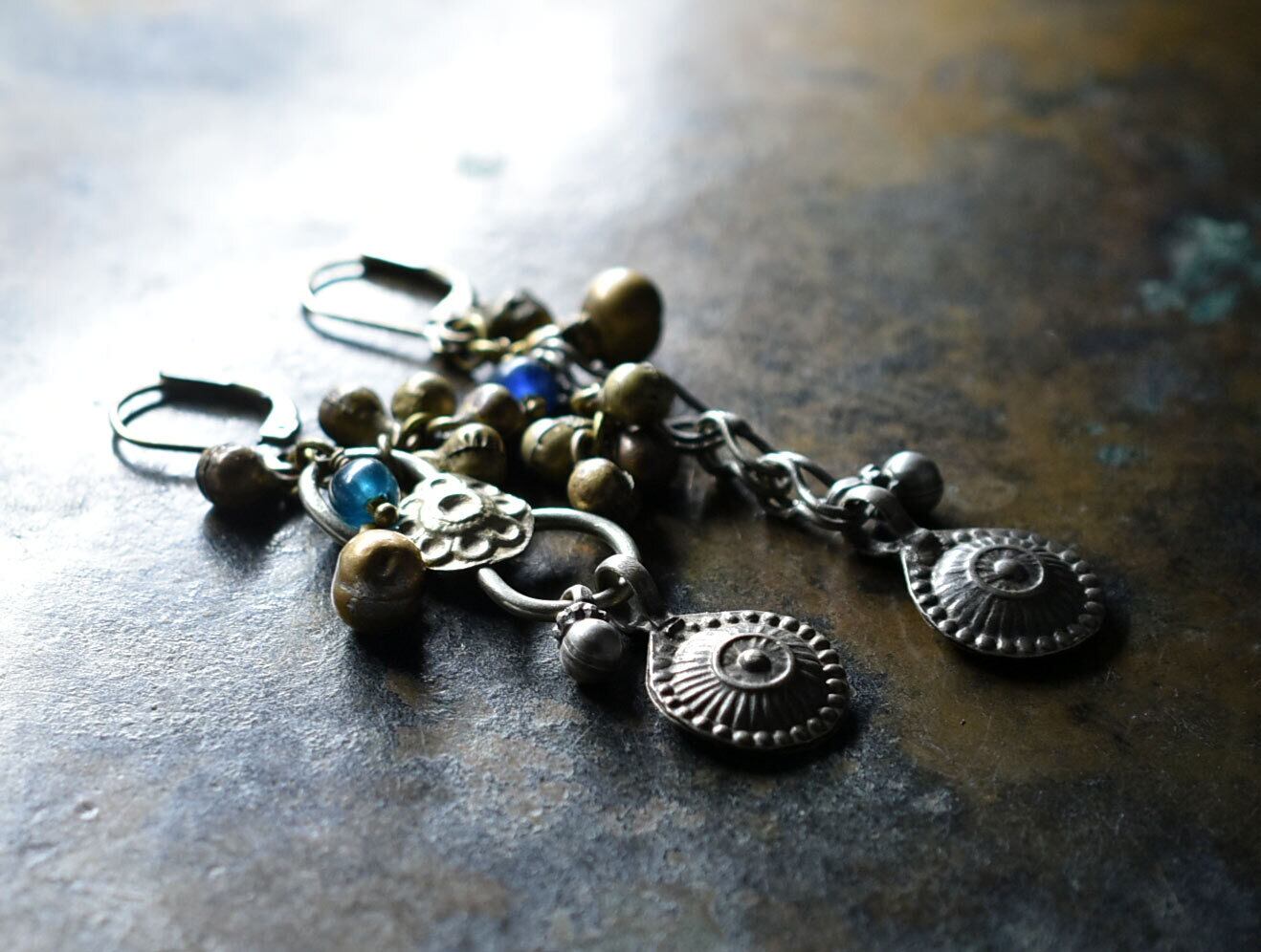 アフガンメタルと民族鈴、エメラルドブルー&ブルービーズのアンシメトリーピアス
