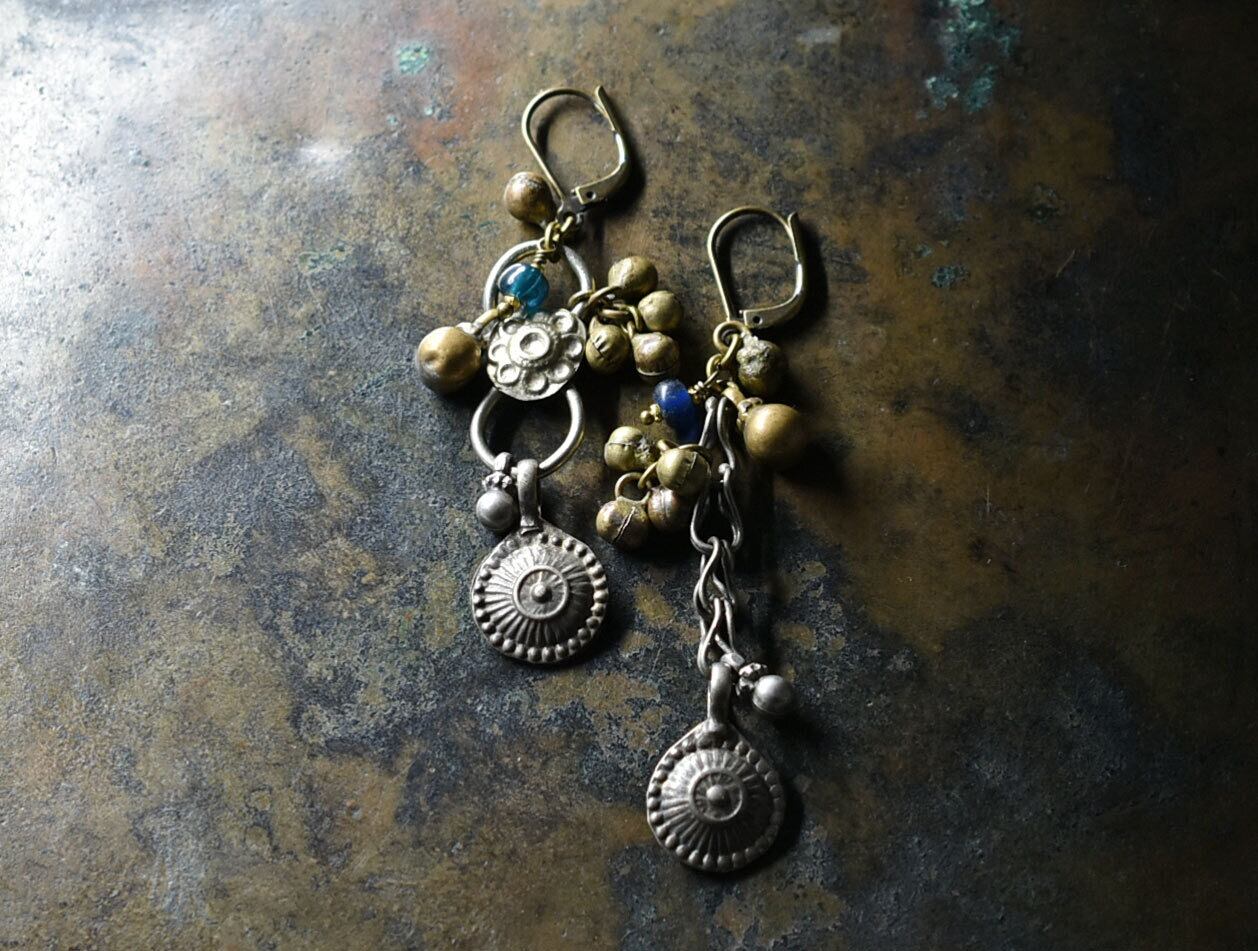 アフガンメタルと民族鈴、エメラルドブルー&ブルービーズを繋いだアンシメトリーなピアスです。