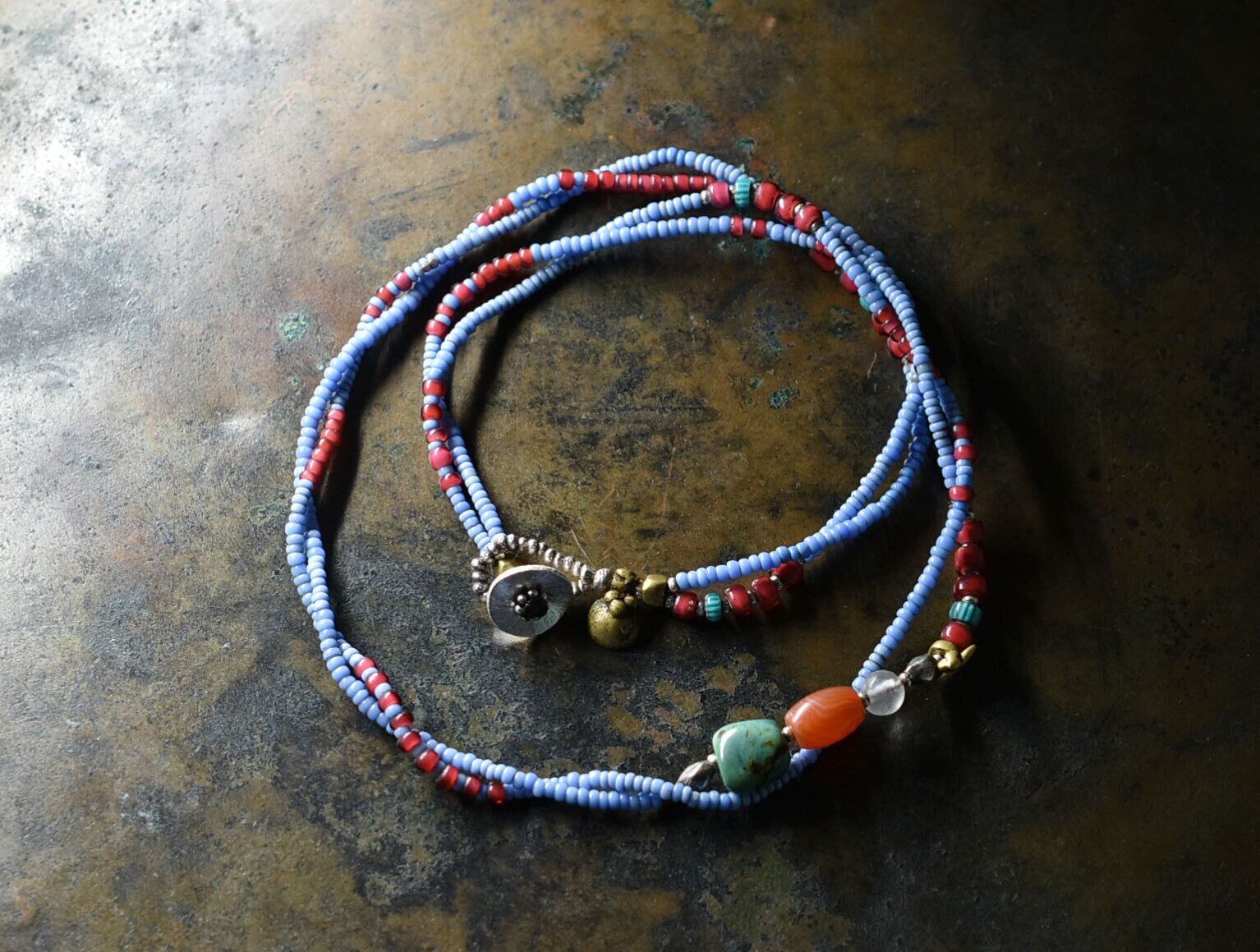 oldチベタンターコイズとシャン族カーネリアン、古代水晶、アンティークゼニスブルーシードビーズ、金赤ホワイトハーツなどを繋いだ2連ネックレスです。