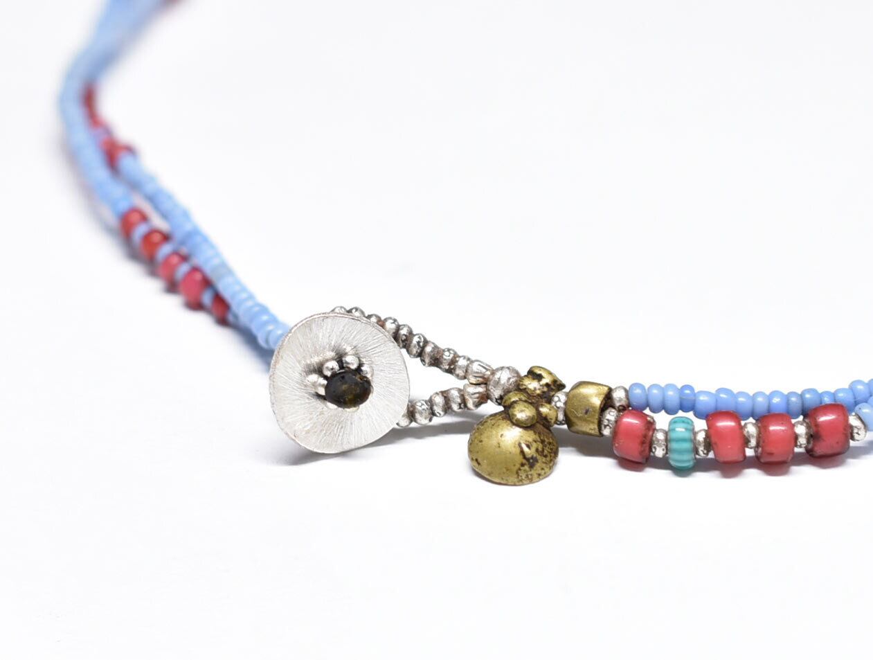 素材:oldチベタンターコイズ、シャン族カーネリアン、古代水晶、ガラス、カレンシルバー、oldオリッサブラス、oldチンシルバー、ロウビキ紐