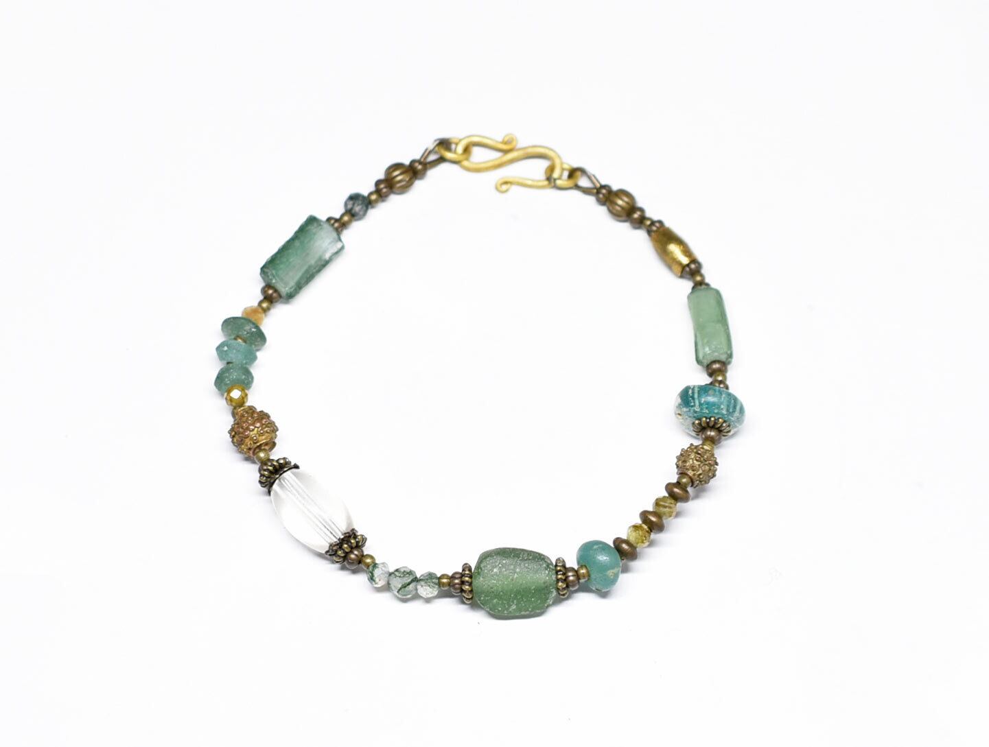アースカラー多彩ローマングラスとアンティークボヘミアビーズ、発掘ビーズ、つぶつぶブラス、モスアゲート、ラブラドライトのブレス