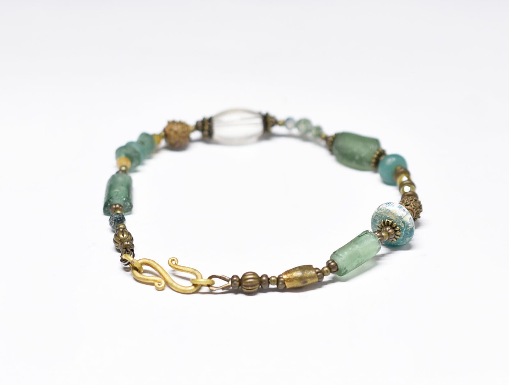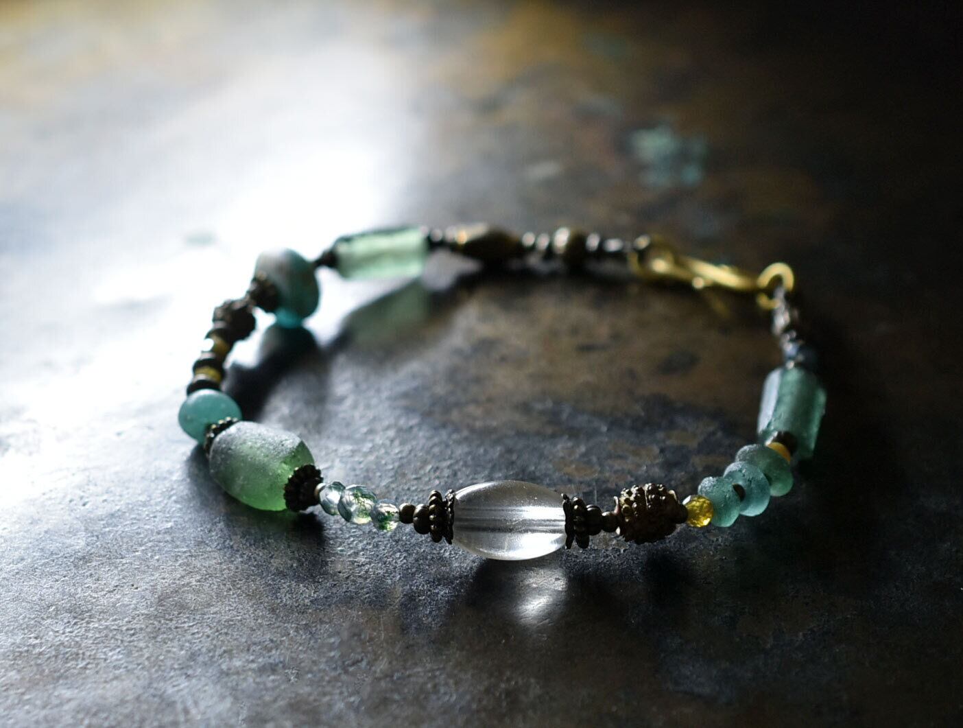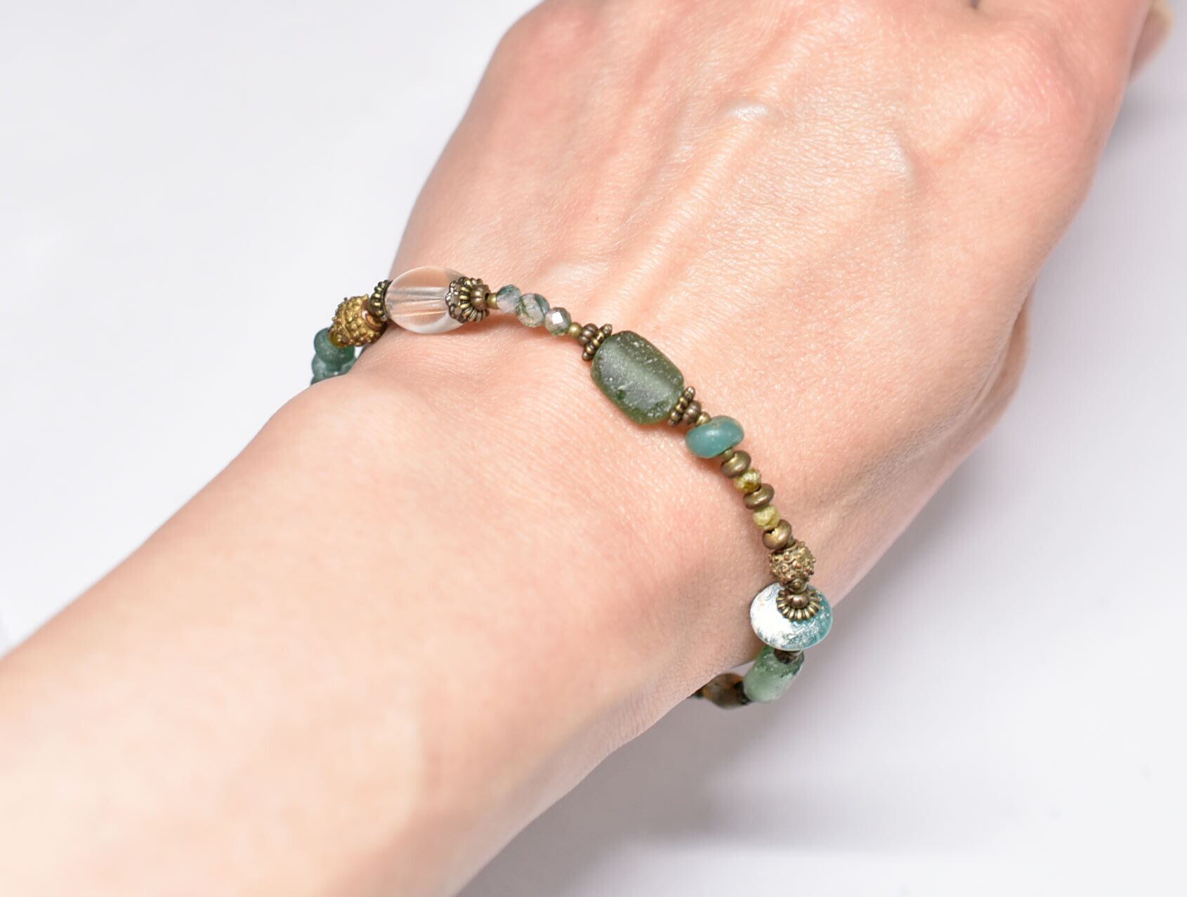 アースカラー多彩ローマングラスとアンティークボヘミアビーズ、発掘ビーズ、つぶつぶブラス、モスアゲート、ラブラドライトなどを繋いだブレスです。