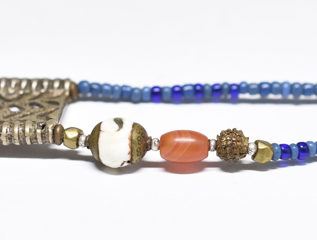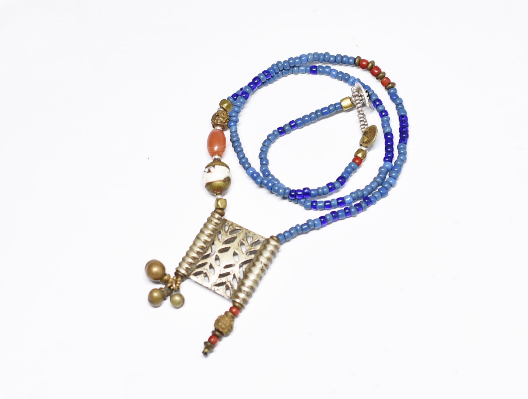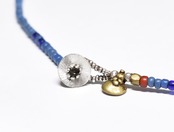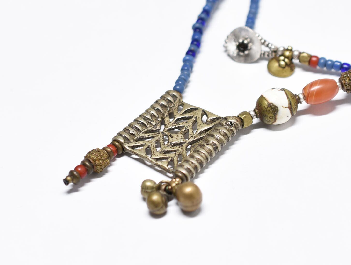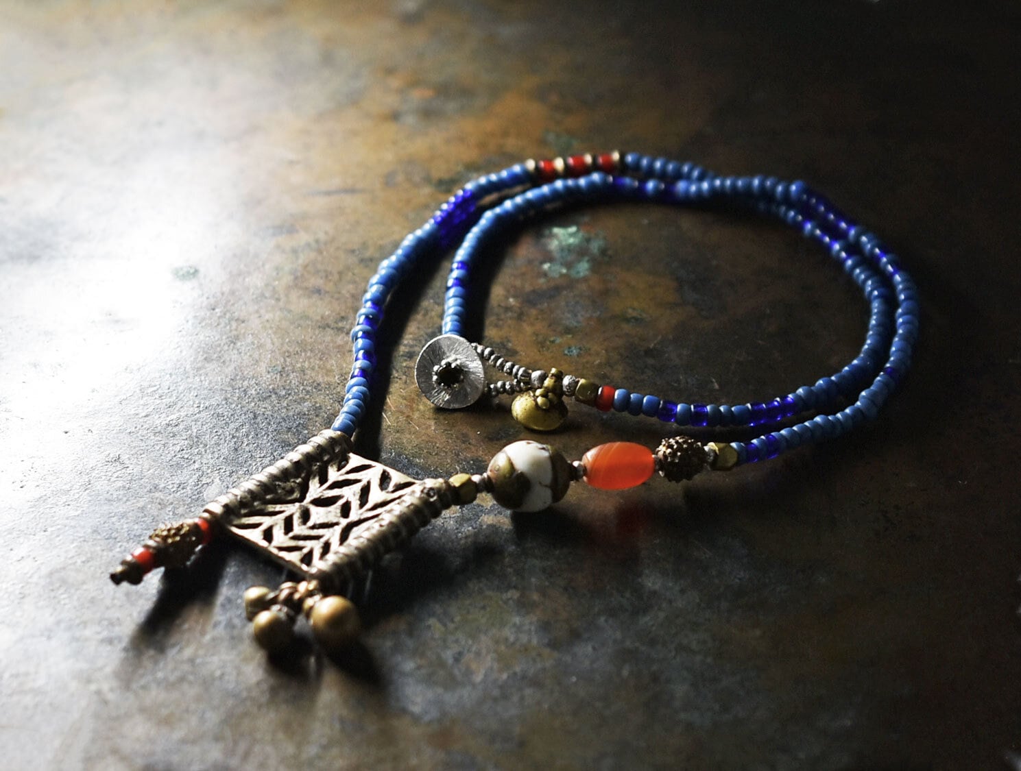 民族メタルパーツ&鈴とチベットブラス装飾シェルビーズ、シャン族カーネリアン、つぶつぶブラス、ブルーグレー&ブルービーズなどを繋いだネックレスです。