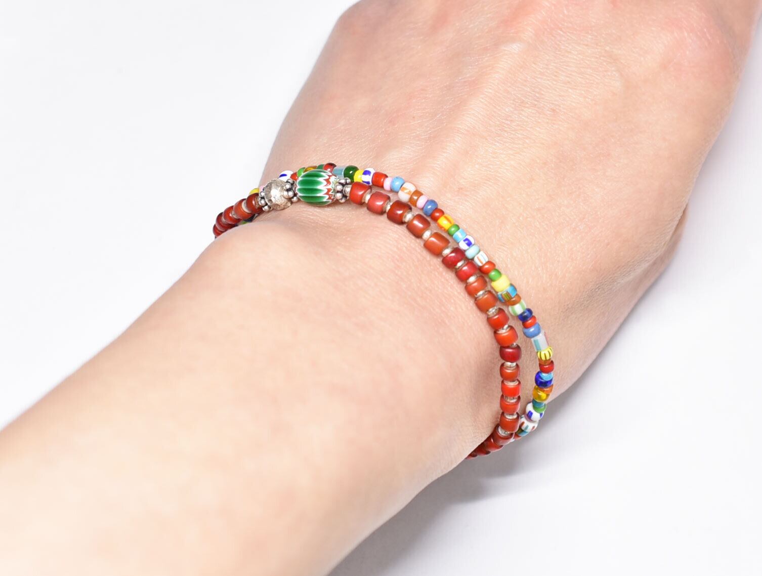カラフルなクリスマスビーズと、ホワイトハーツ、カレンシルバービーズ、グリーンシェブロンを繋いだ2連のブレスです。