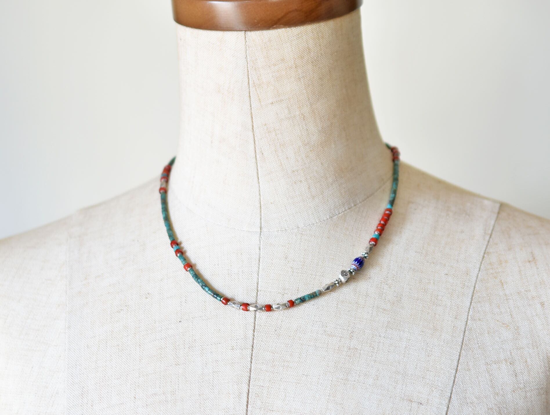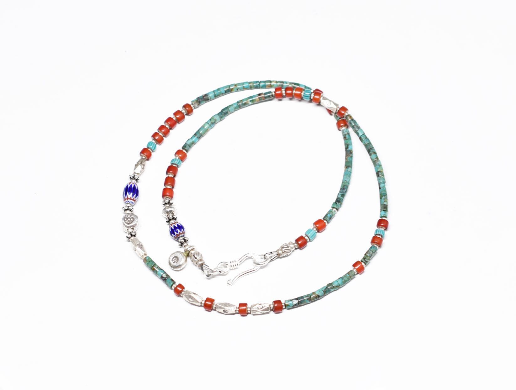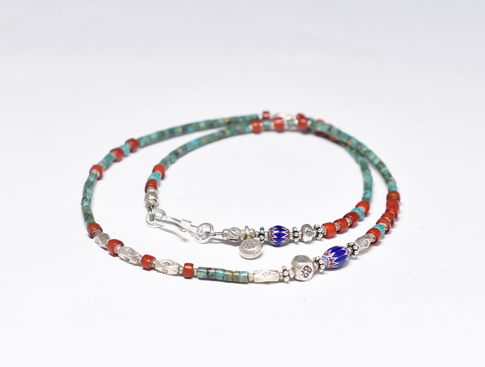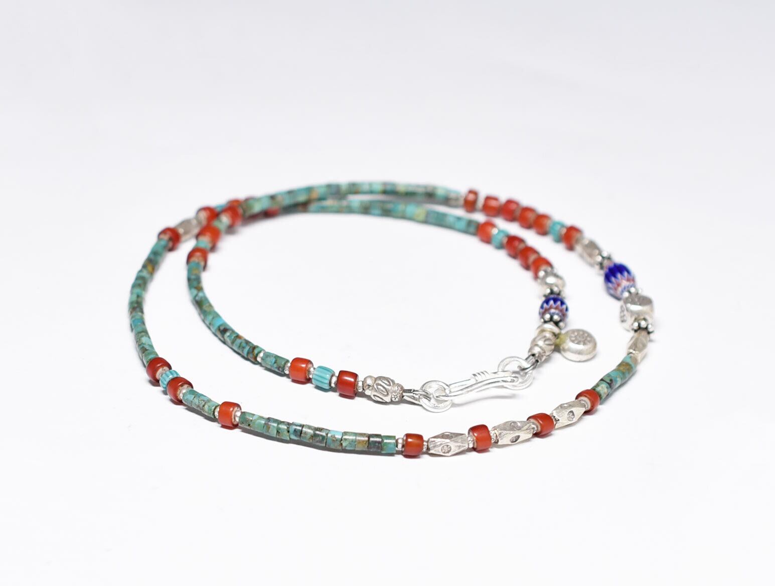 グリーンターコイズと飴色ホワイトハーツ 、ブルーとターコイズブルーシェブロン、カレンシルバーを繋いだ華奢なネックレスです。