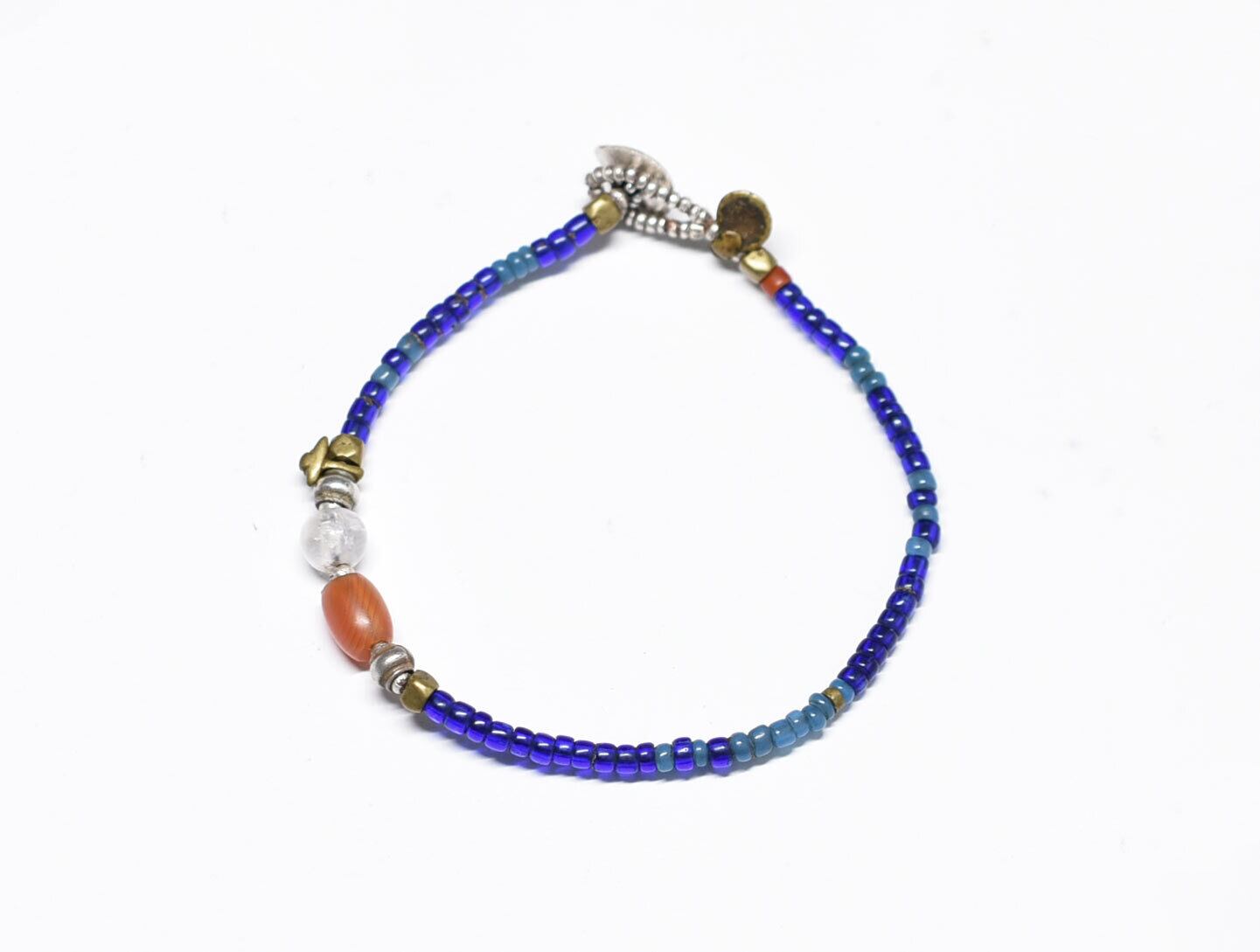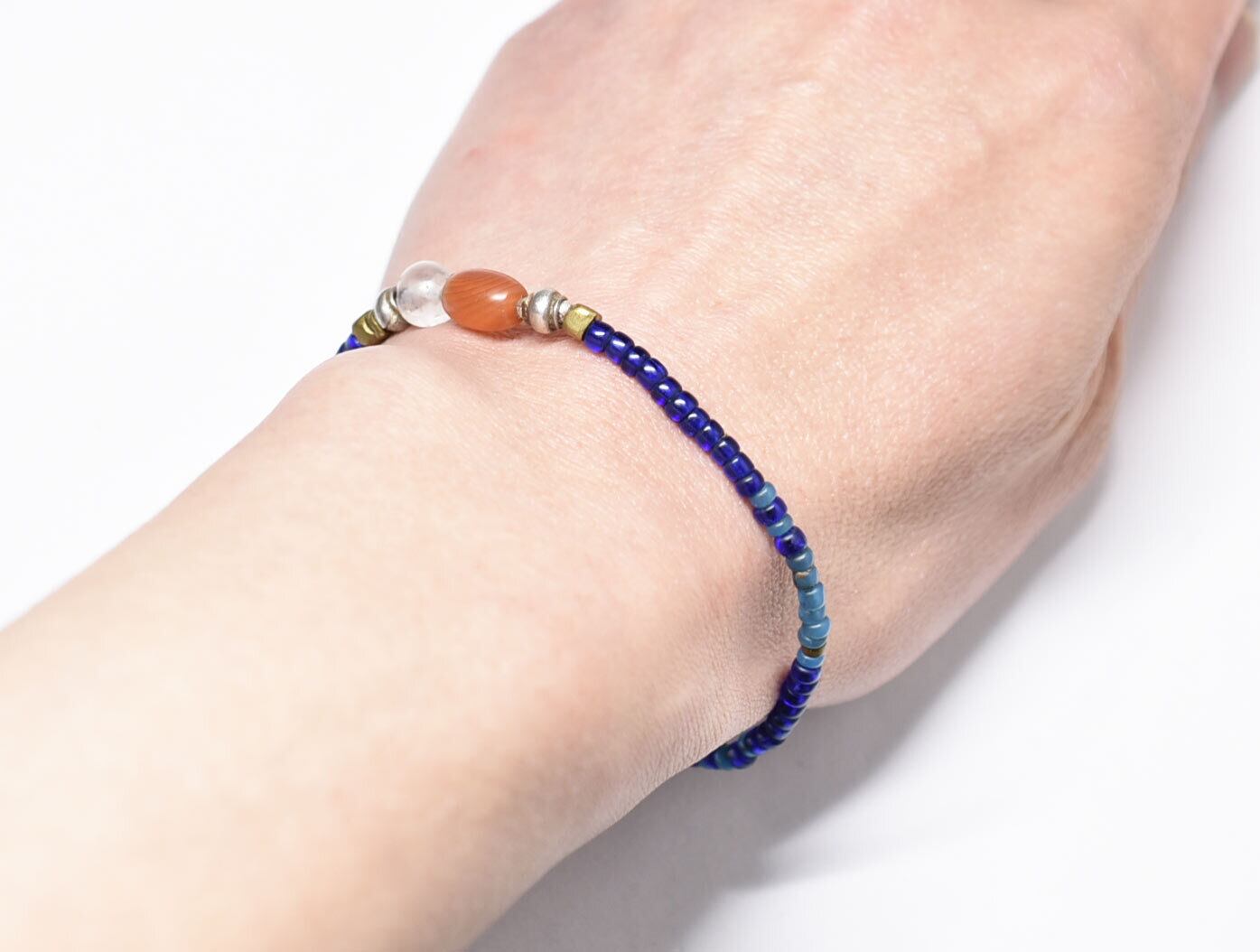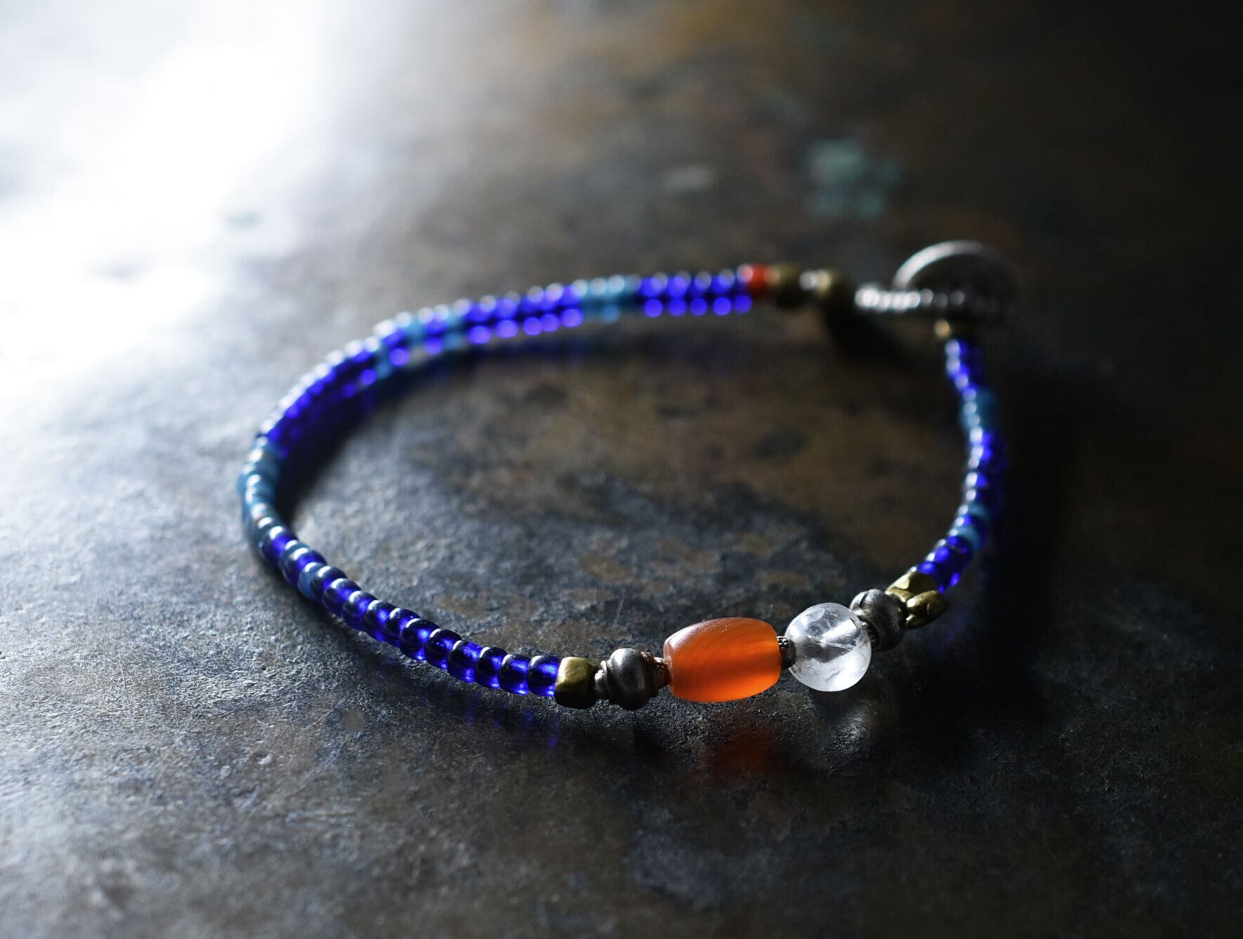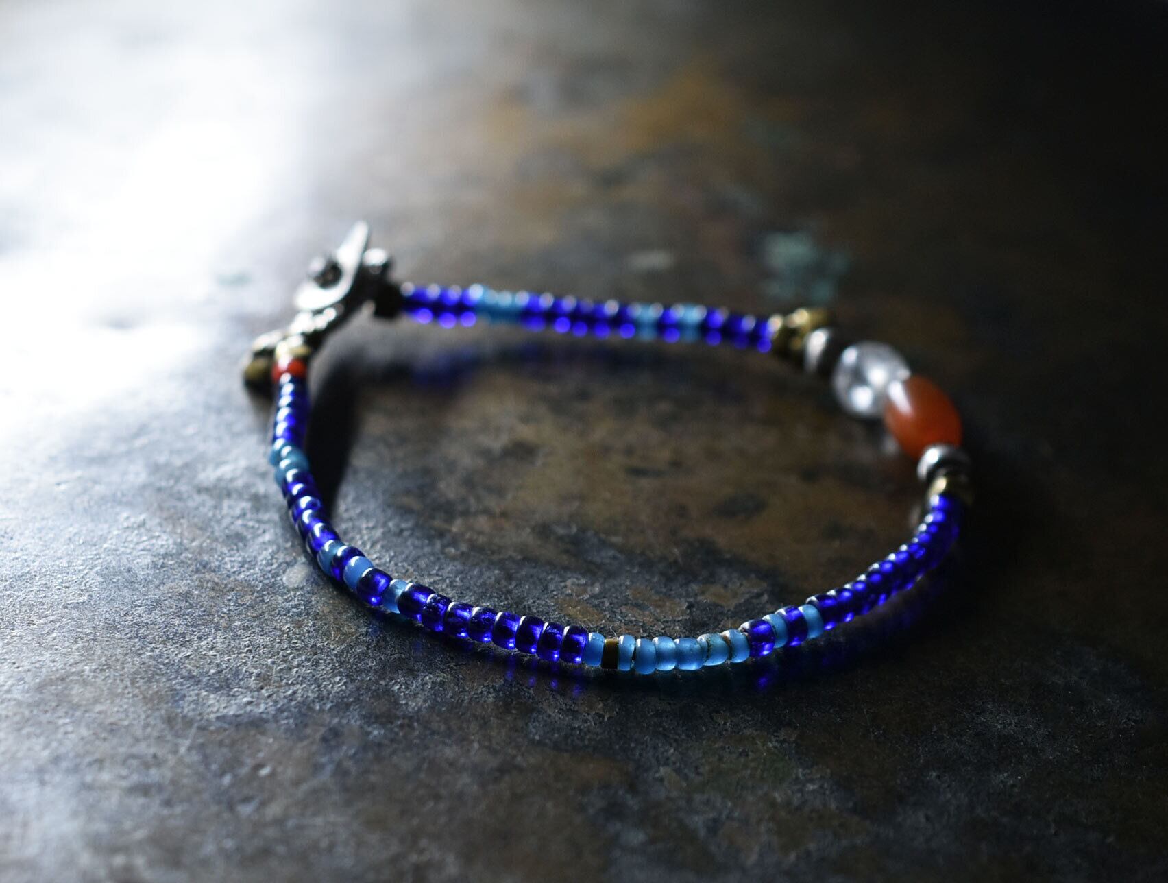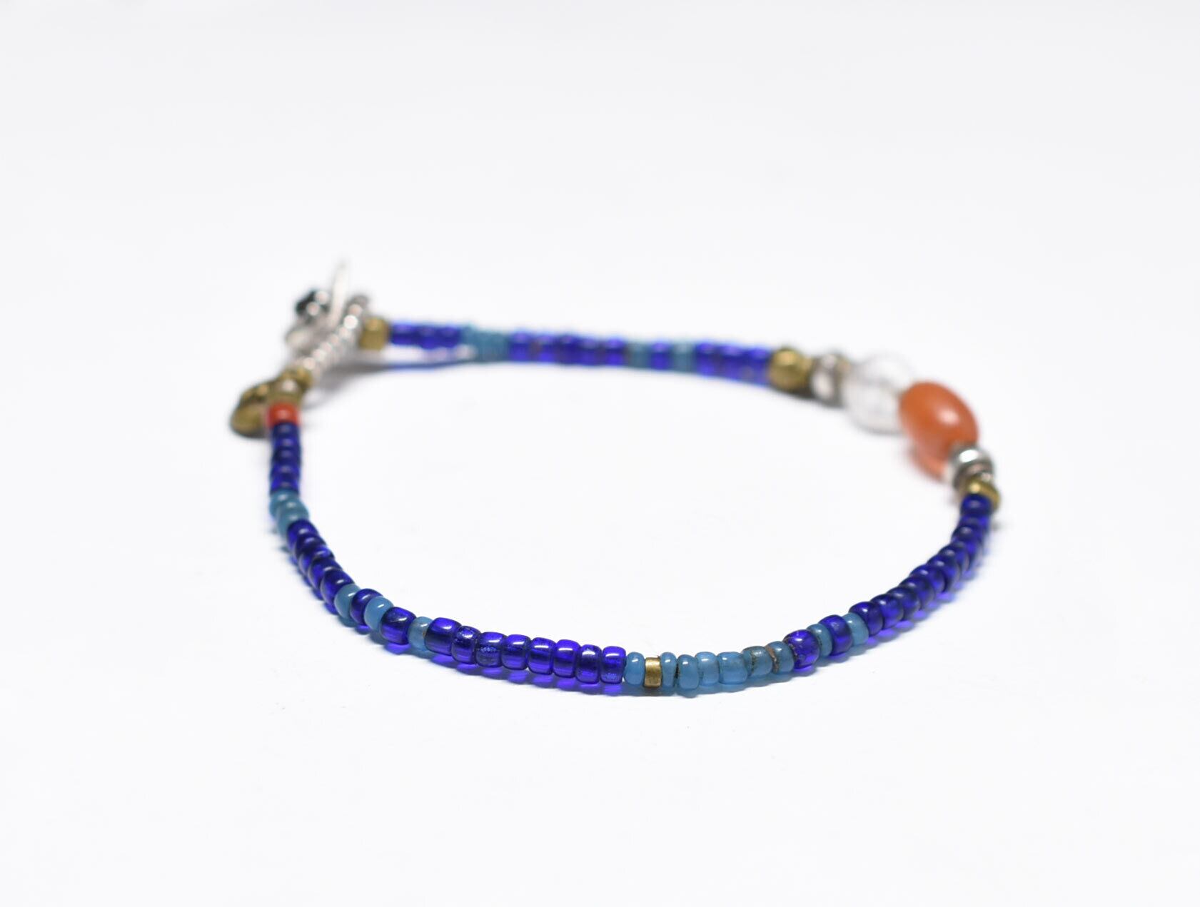 瑠璃色&サックスブルービーズとシャン族ヴィンテージカーネリアン、古代水晶、oldチンシルバー&オリッサブラスなどを繋いだ華奢なブレスです。