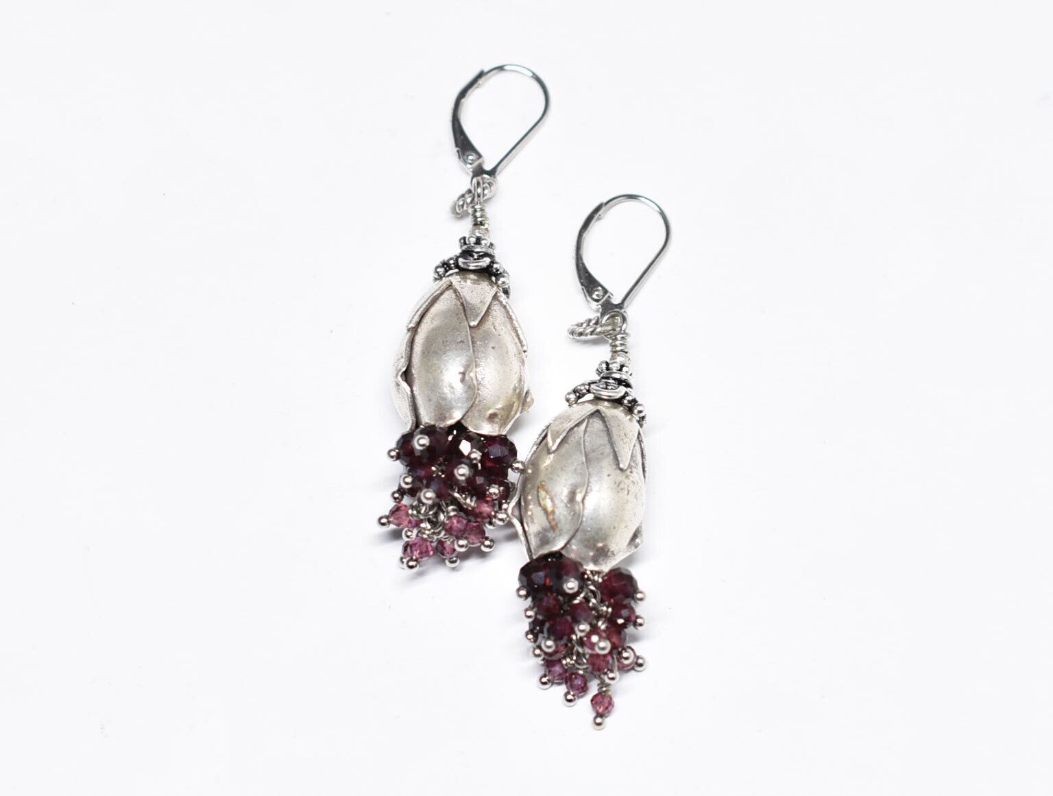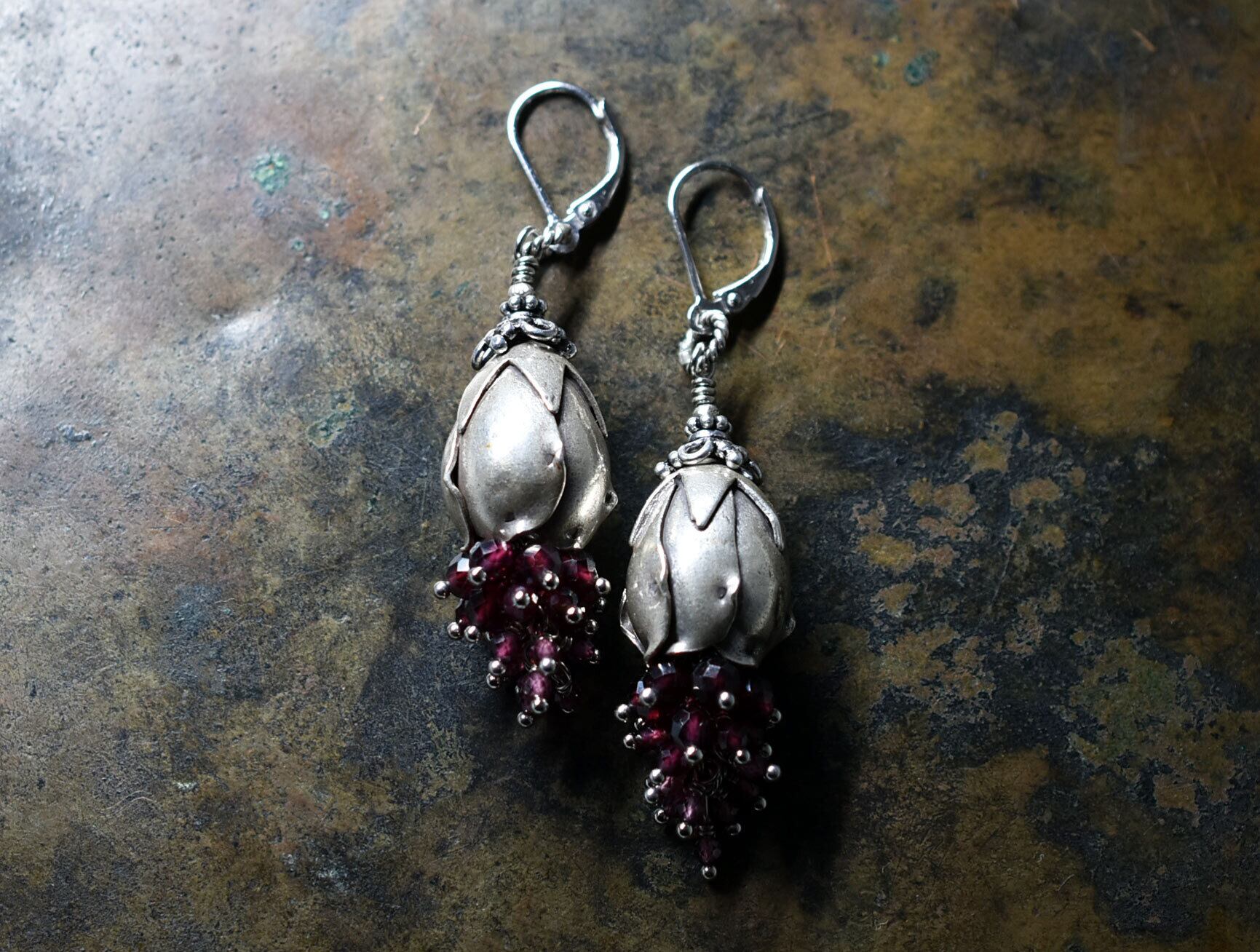 たわわなガーネットと蕾カレンシルバーを繋いだボリュームのあるピアスです。